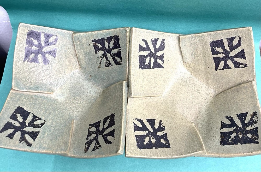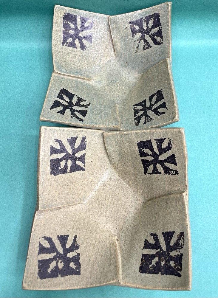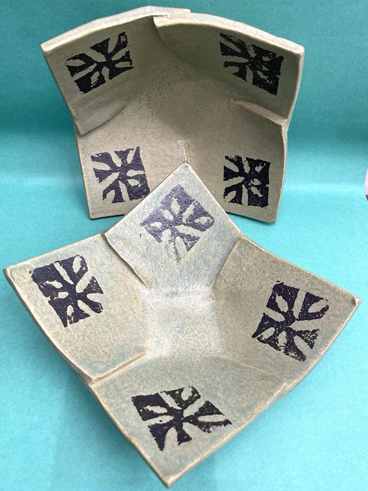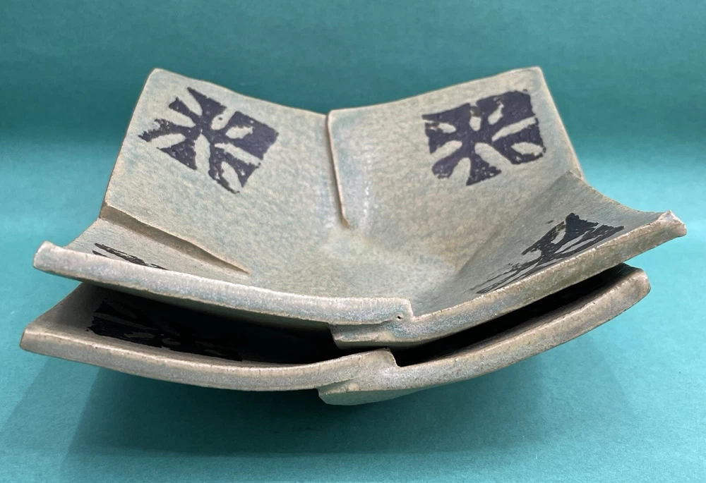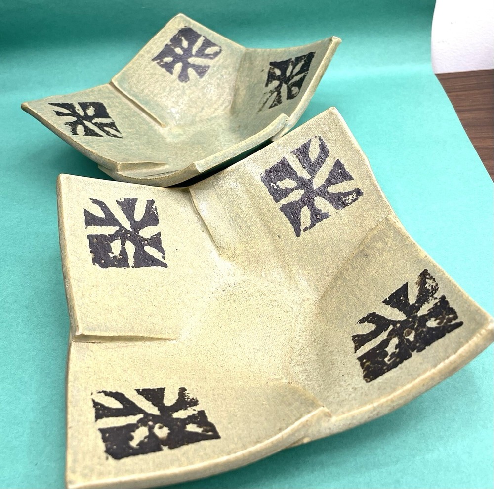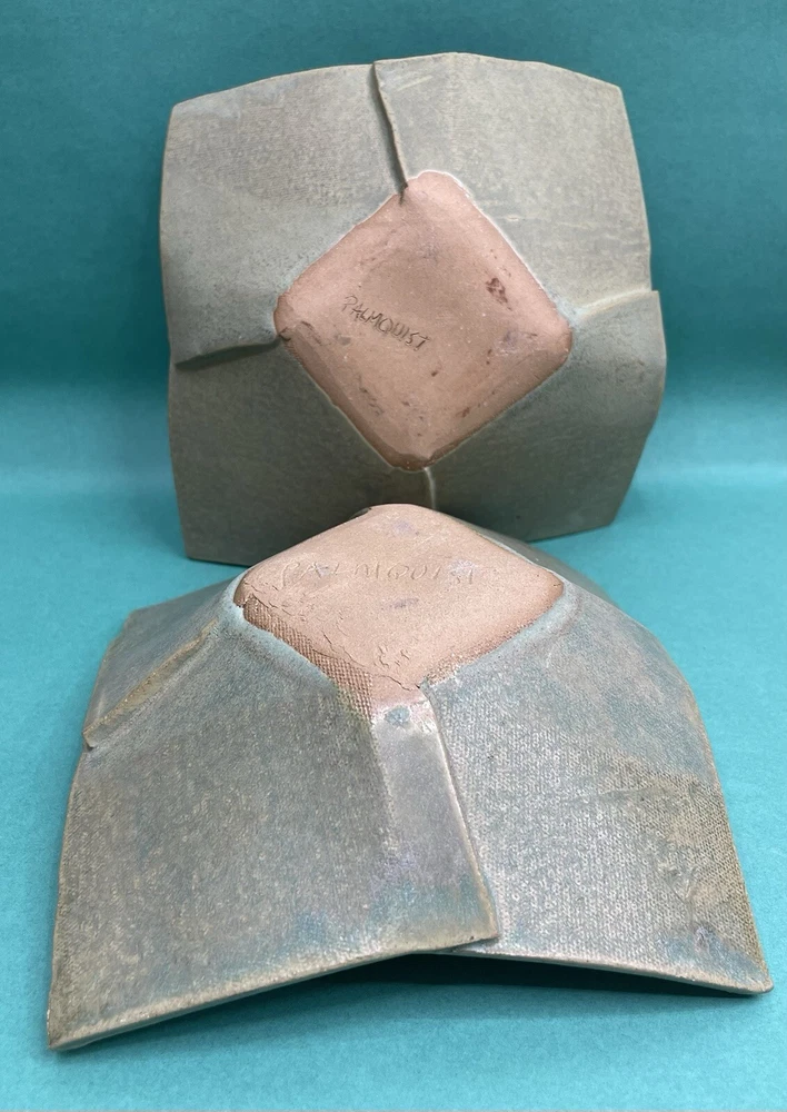 Set of 2 Art Pottery Studio Made Clay Bowls Khaki Square 7" x 6.5" x 2.75" Artist Signed "PALMQUIST"