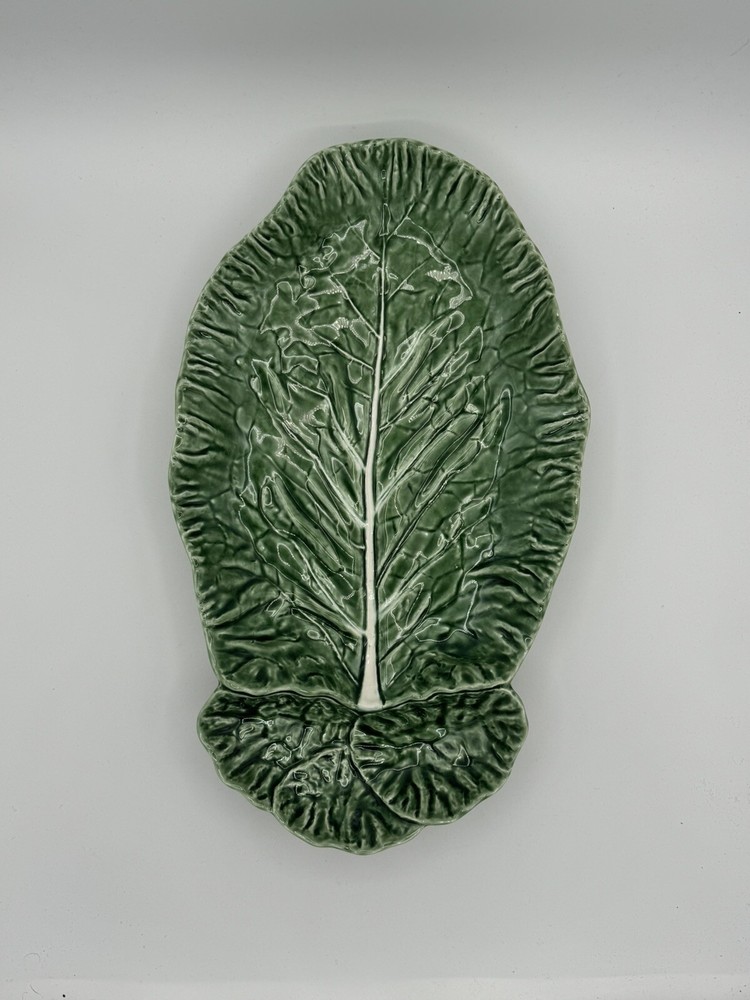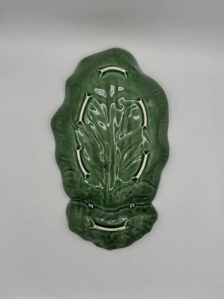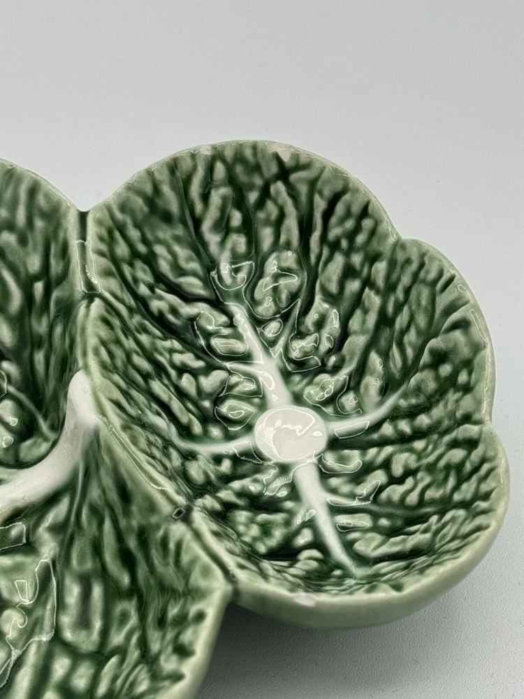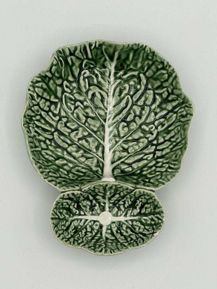 2 Bordallo Pinheiro Green Cabbage Leaf Chip & Dip 16.5” x 10” Large Serving Bowl Dish. Smaller dip dish measures 7.25” x 5.25”. Large dish is in excellent condition free of chips and cracks. The smaller dish has 3 tiny rim chips in the smallest dip section as shown in pictures. Great versatile pieces to add to your collection.