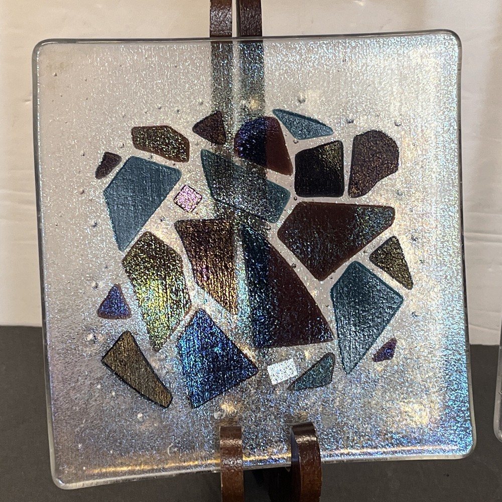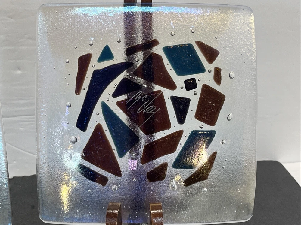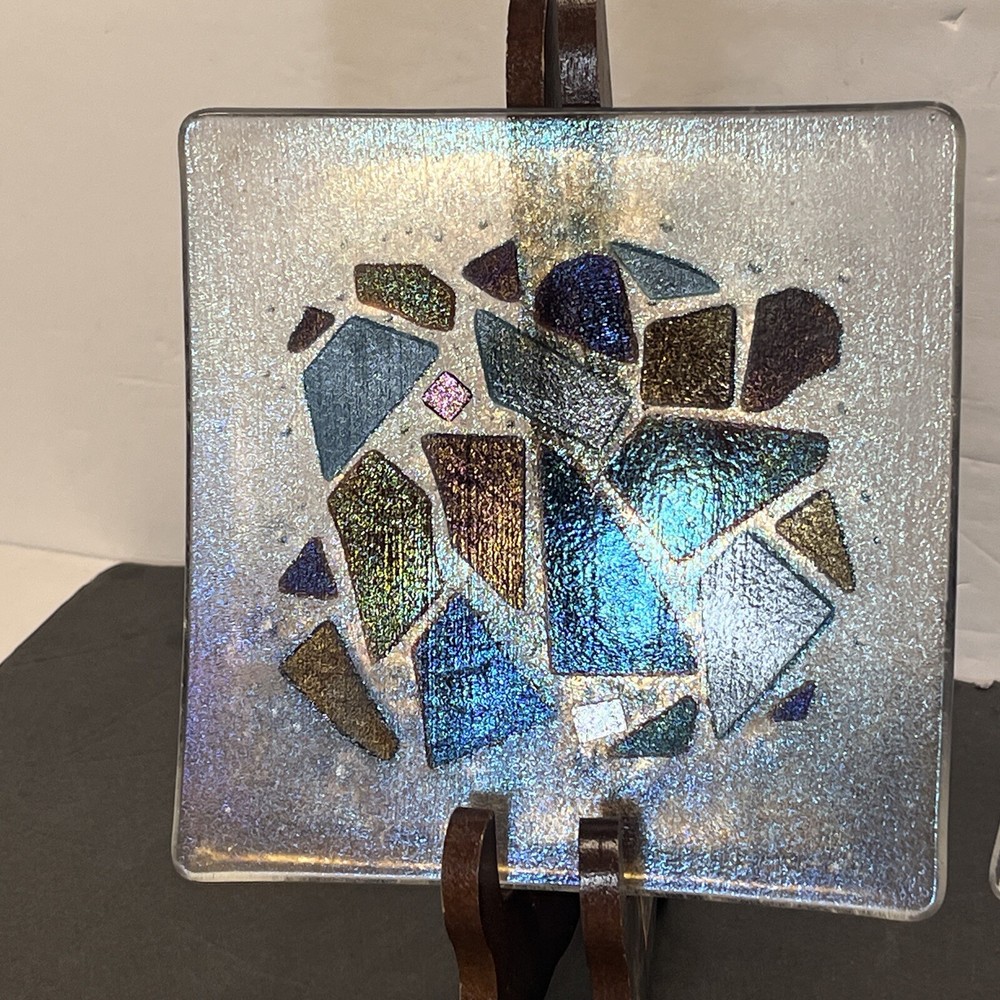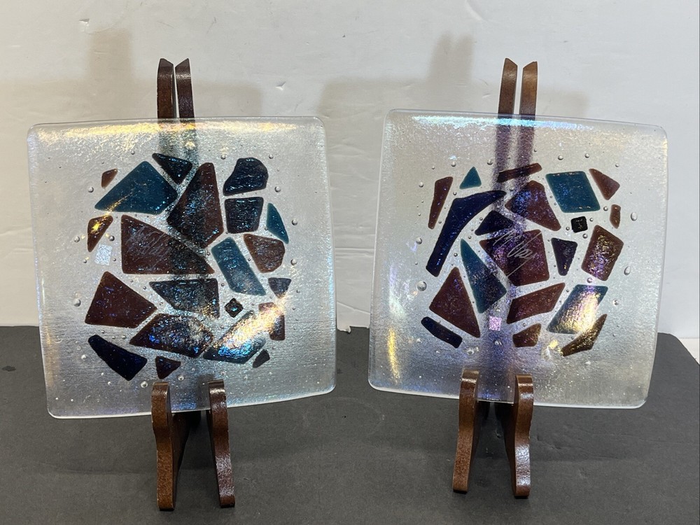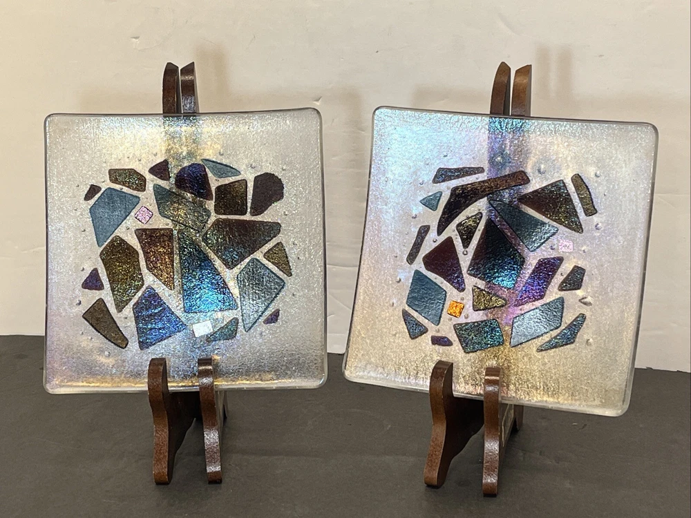 Add a touch of eclectic charm to your dining table with these two Kurt McVay art glass square dishes. These dishes feature a carnival iridescent finish and a fused geometric design, making them a unique addition to your collection. They are six inches in length and width, with a height of only half an inch, making them perfect for serving small appetizers or desserts. These dishes are handmade and signed by the artist, ensuring their authenticity and originality. They are easy to care for, as they should be hand washed only. These contemporary original pieces were produced in the 1980s using fused glass techniques, and are incised with a signature.