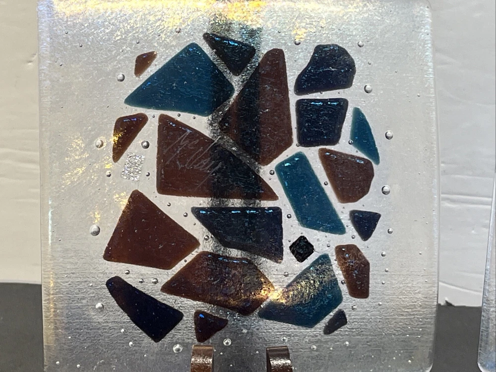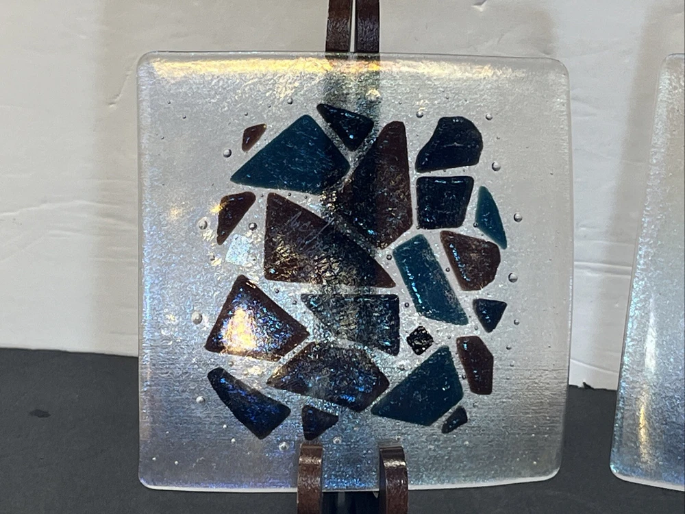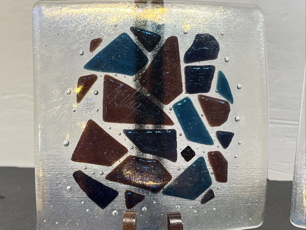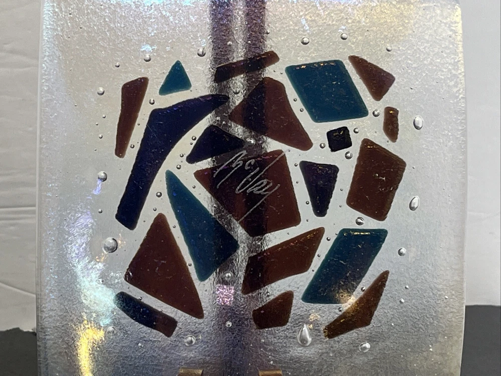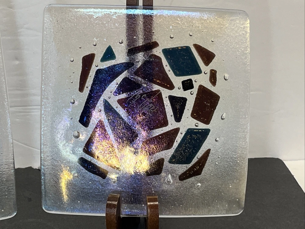 Add a touch of eclectic charm to your dining table with these two Kurt McVay art glass square dishes. These dishes feature a carnival iridescent finish and a fused geometric design, making them a unique addition to your collection. They are six inches in length and width, with a height of only half an inch, making them perfect for serving small appetizers or desserts. These dishes are handmade and signed by the artist, ensuring their authenticity and originality. They are easy to care for, as they should be hand washed only. These contemporary original pieces were produced in the 1980s using fused glass techniques, and are incised with a signature.