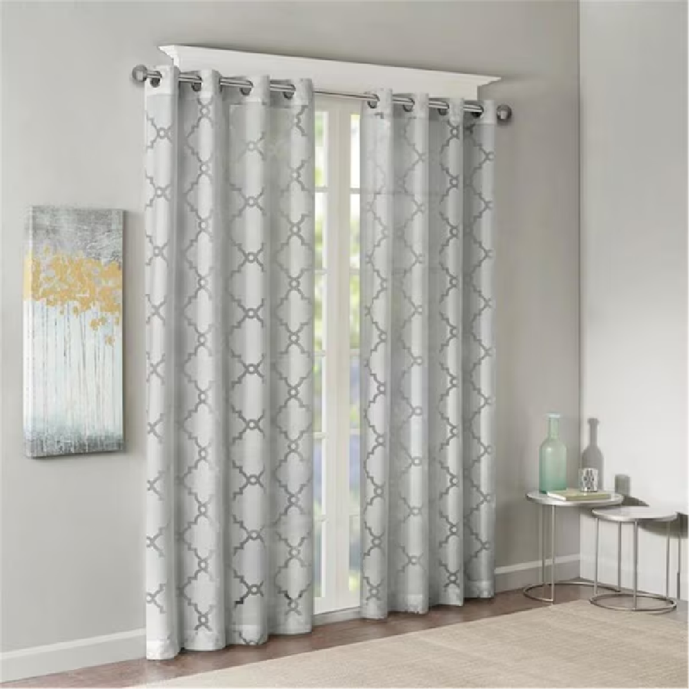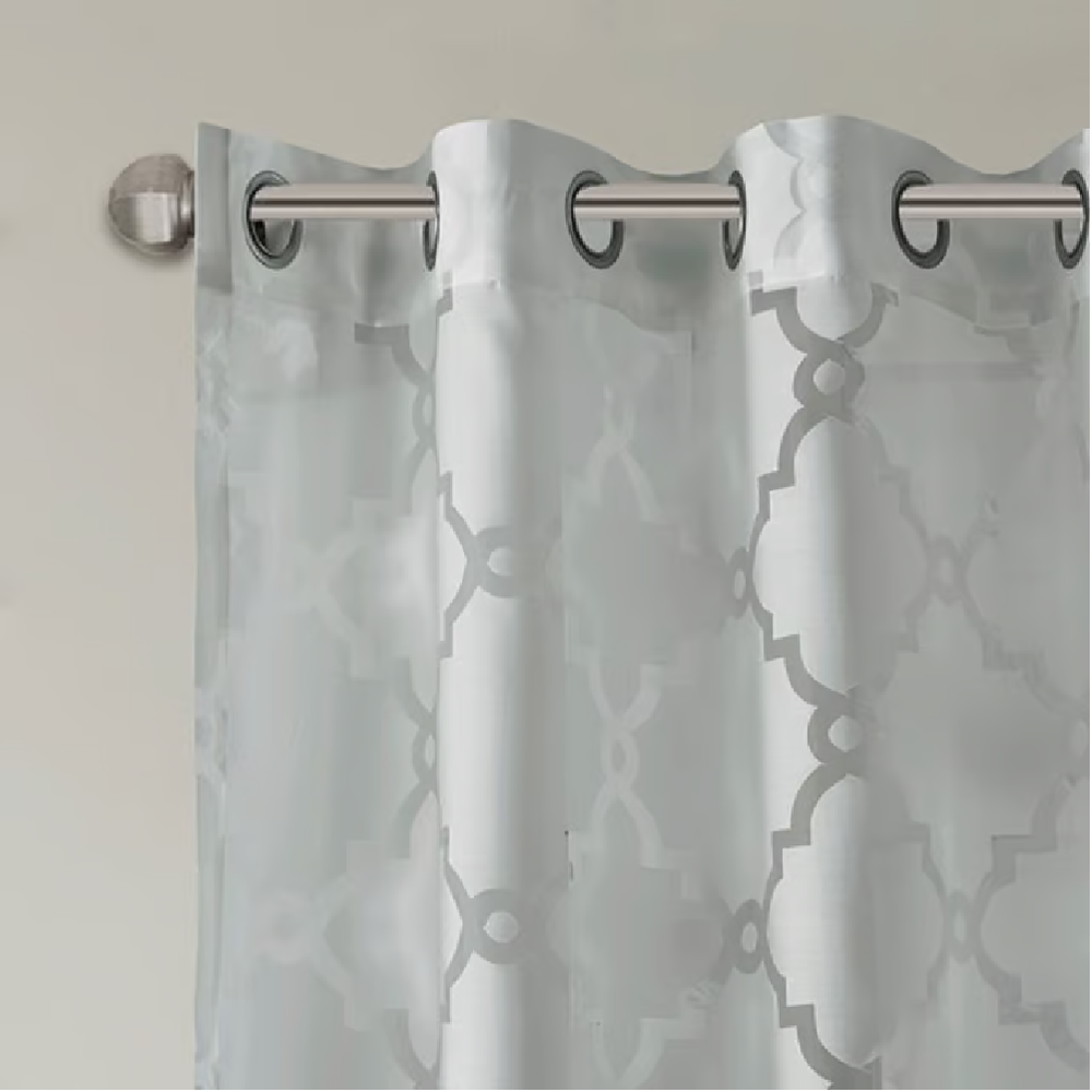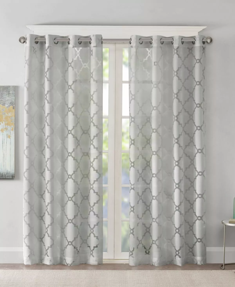 2 Madison Park Eden Fretwork Burnout Sheer Curtain Panel - 50 x 95 inch color : gray Details: Stylish yet delicate, the Madison Park Eden Fretwork Sheer Curtain will update and soften any room. The lightweight sheer fabric features a burnout fretwork design on a gray ground, for a dimensional and airy look. Finished with a grommet top detail making it easier to hang, open, and close panels throughout the day. Fits up to 1.25" diameter rod. Dimensions: L 95 X W 50 X H 0.13 Weight: 0.99 lbs Finish: gray Item Features: Country Of Origin : China Care Instruction : Machine Wash Item Description: Fretwork Burnout Sheer Curtain Panel Style: Modern Color: Ivory Fabric Content: 38% polyester 62% Rayon