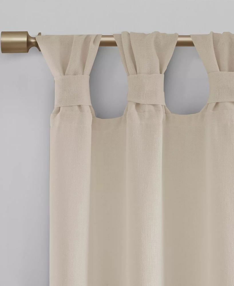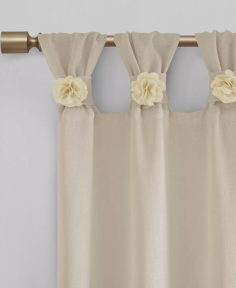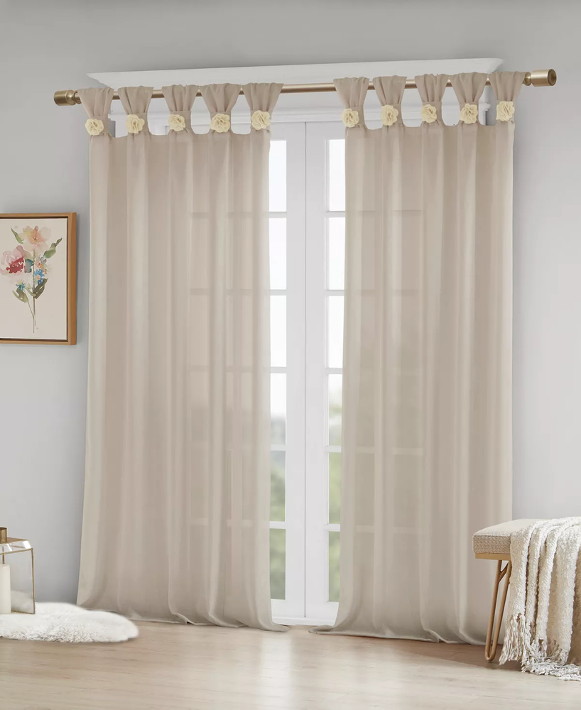 Linen Madison Park Rosette Floral Embellished Cuff Twist Tab Top Single Window Panel offers a gorgeous one-of-a-kind look to your home. This soft voile panel provides a simple and airy update to your décor. The DIY cuff twist tab top creates beautiful and delicate folds for a stylish decorator's touch. Fits up to a 1.25" diameter rod. 1 Single Window Panel: 50"W x 84"L, as shown in image - Need to purchase 2 curtain Panel for each Single Window for standard coverage. Care instructions: machine washable