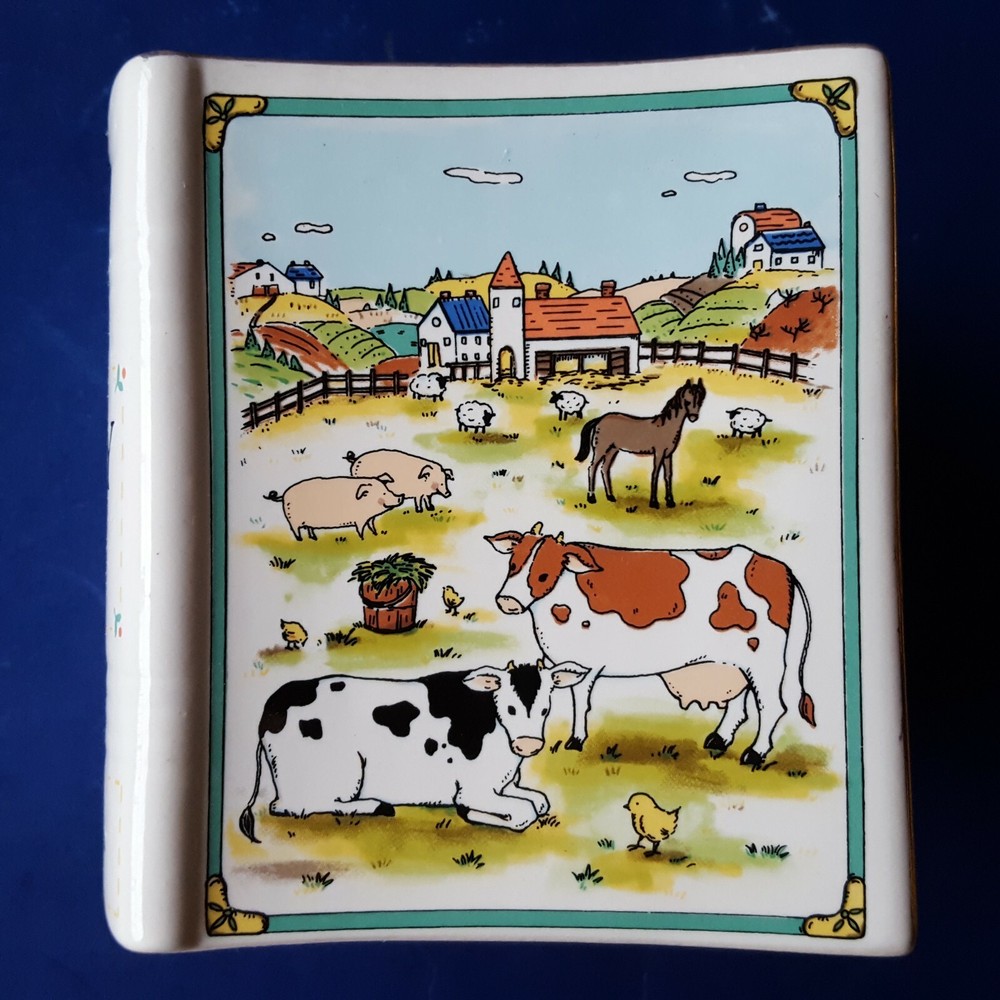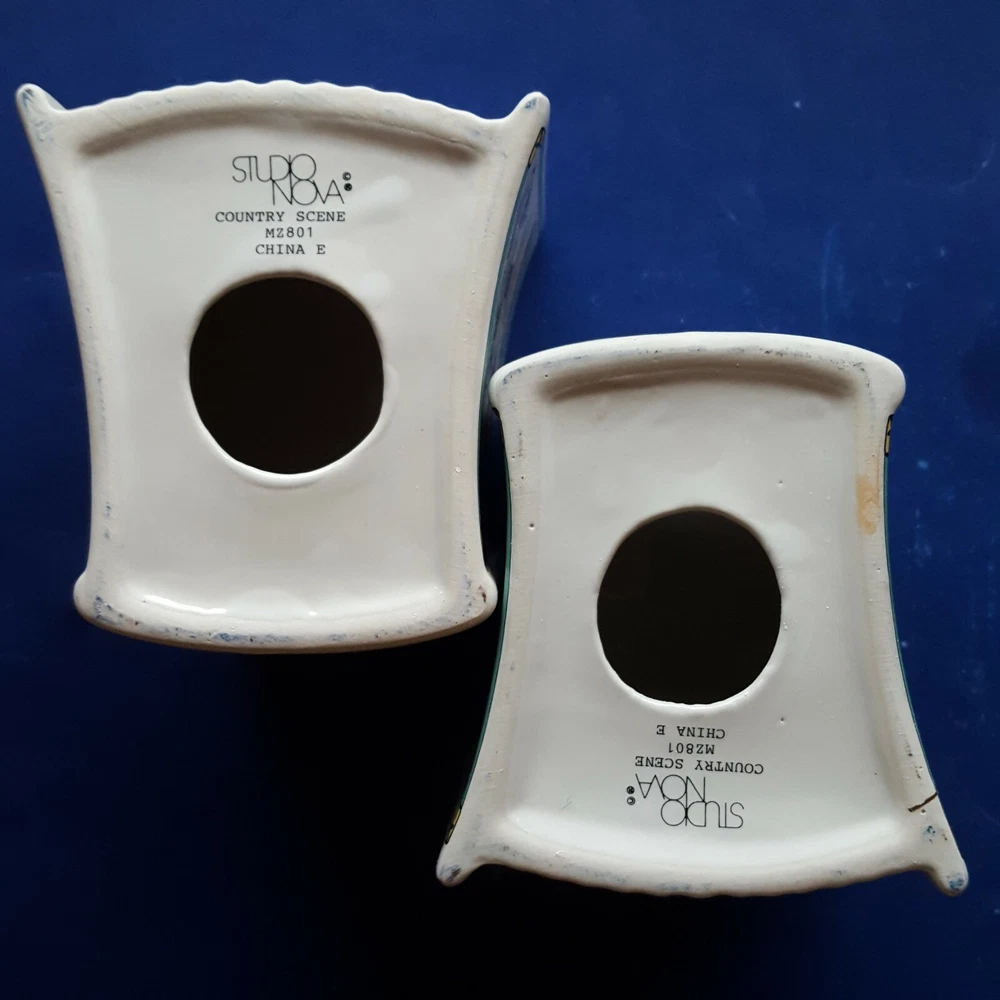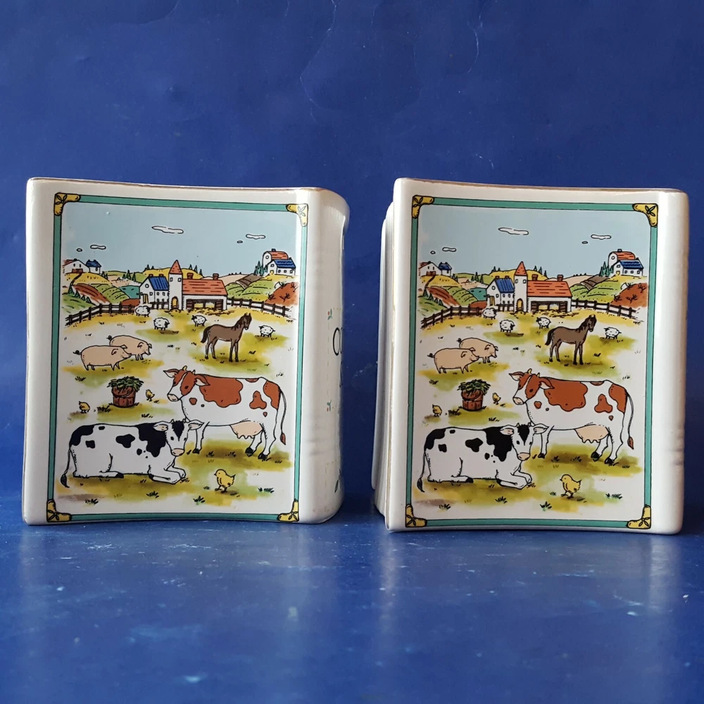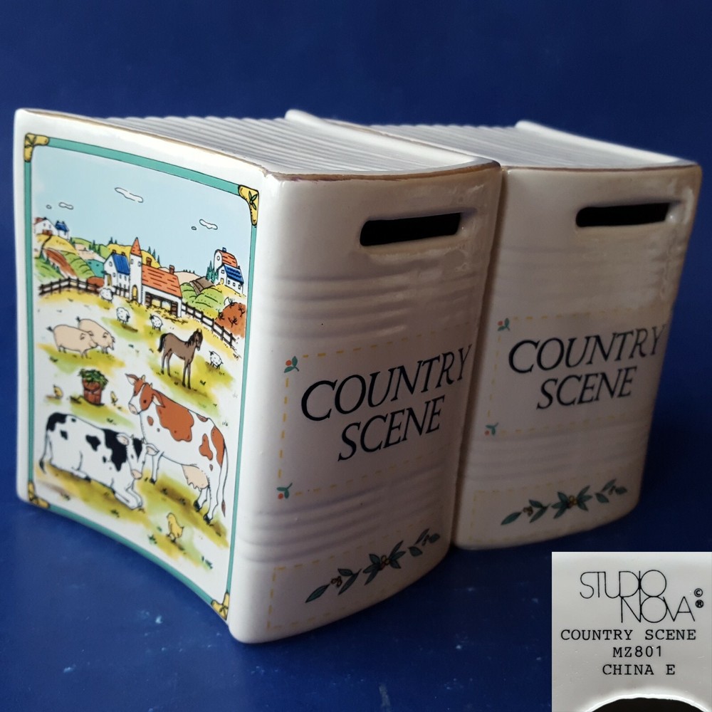2 MIKASA STUDIO NOVA COUNTRY SCENE CERAMIC BOOK-SHAPED BANKS/BOOKENDS. BARNYARD Item Description You are buying a set of two (2) authentic Studio Nova 'Country Scene' coin banks dating, approximately, from 1984 to 2007. These cute, colorful, country-casual, earthenware coin banks are fashioned in a likeness of storybooks decorated with colorful barnyard scenes on the front and back covers. The spines are labeled with the 'Country Scene' title. Each bank contains a slot on its spine for depositing coins and a plugged hole on the bottom for withdrawals. The edges are trimmed with glistening, 22K gold. The bottoms are labeled with a Studio Nova trademark, the 'Country Scene' pattern name and the 'MZ801' pattern number. The Studio Nova brand, a member of the Mikasa family, was produced from 1984 through 2007. Each bank measures approximately 4-3/8 inches tall and 2-1/2 inches wide. These twin banks could be re-purposed as clever bookends for country cookbooks or as napkin holders on a dining table. These decades-old banks are in EXCELLENT condition. The colors are rich, and the details are distinct. The finish is lustrous, and the gold is glossy. The bottom hole plugs are intact. There are no chips, cracks, crazing, breaks or repairs. See the photos for further clarification. The items pictured are the items you will receive. These banks will be shipped as a trackable parcel.