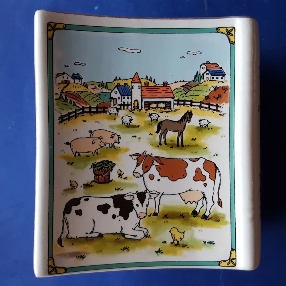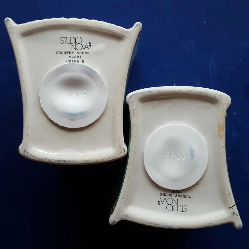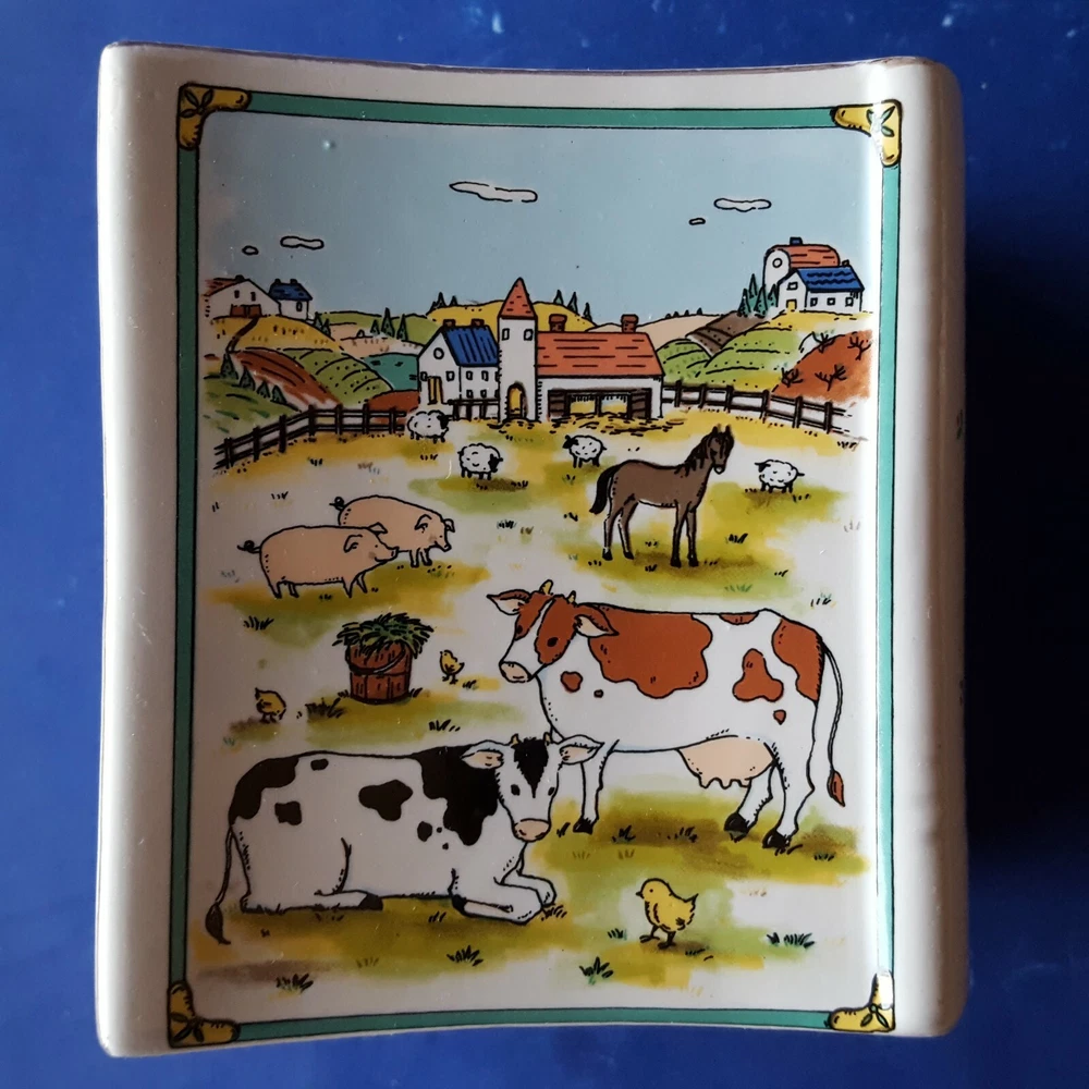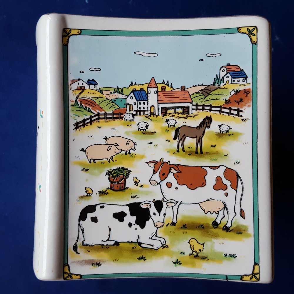 2 MIKASA STUDIO NOVA COUNTRY SCENE CERAMIC BOOK-SHAPED BANKS/BOOKENDS. BARNYARD Item Description You are buying a set of two (2) authentic Studio Nova 'Country Scene' coin banks dating, approximately, from 1984 to 2007. These cute, colorful, country-casual, earthenware coin banks are fashioned in a likeness of storybooks decorated with colorful barnyard scenes on the front and back covers. The spines are labeled with the 'Country Scene' title. Each bank contains a slot on its spine for depositing coins and a plugged hole on the bottom for withdrawals. The edges are trimmed with glistening, 22K gold. The bottoms are labeled with a Studio Nova trademark, the 'Country Scene' pattern name and the 'MZ801' pattern number. The Studio Nova brand, a member of the Mikasa family, was produced from 1984 through 2007. Each bank measures approximately 4-3/8 inches tall and 2-1/2 inches wide. These twin banks could be re-purposed as clever bookends for country cookbooks or as napkin holders on a dining table. These decades-old banks are in EXCELLENT condition. The colors are rich, and the details are distinct. The finish is lustrous, and the gold is glossy. The bottom hole plugs are intact. There are no chips, cracks, crazing, breaks or repairs. See the photos for further clarification. The items pictured are the items you will receive. These banks will be shipped as a trackable parcel.