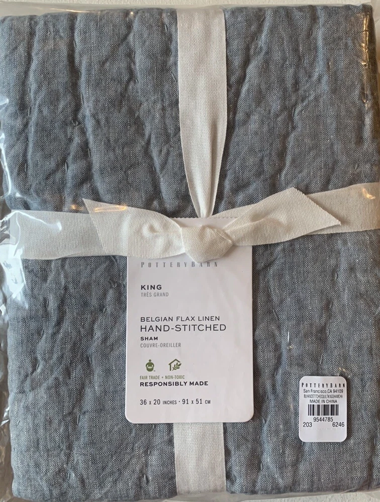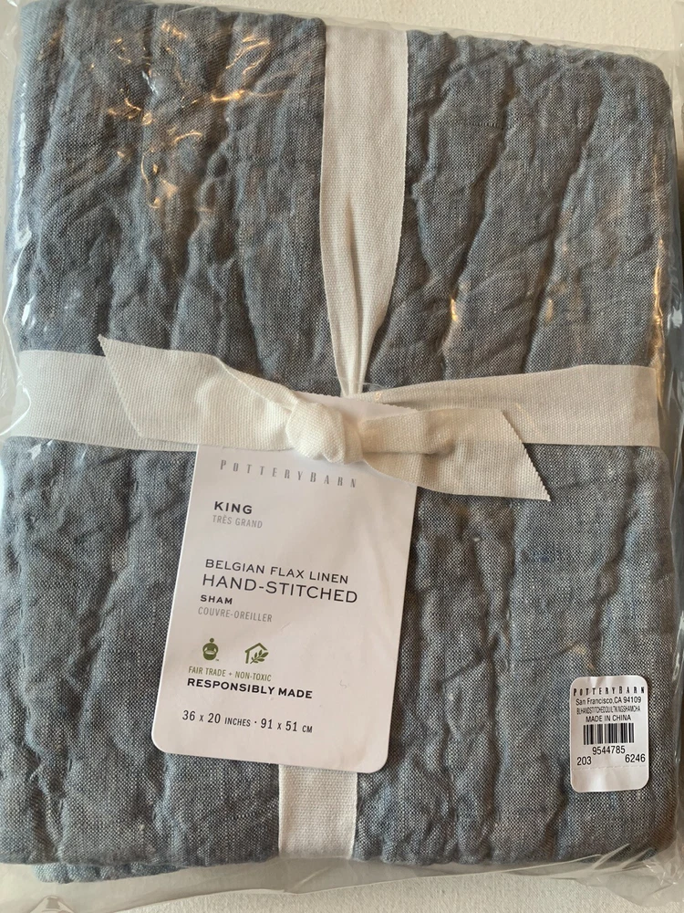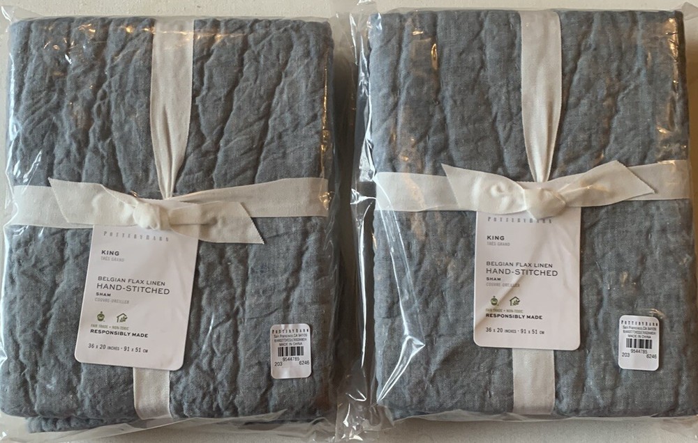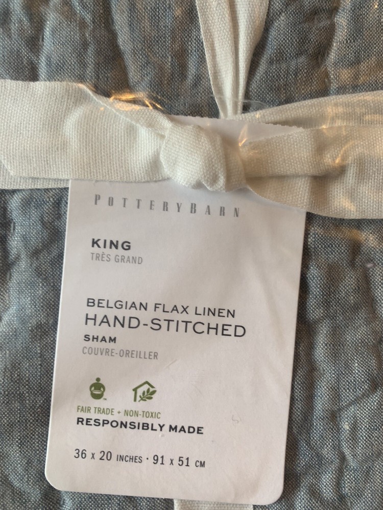 NEW 2 Pottery Barn Belgian Flax Linen Hand Stitched King Size Quilted SHAM Chambray You will receive 2 pillow shams. The epitome of casual luxury, quilted bedding is crafted of the finest heirloom linen and stitched by hand. Made at a Fair Trade Certified™ factory. Natural fibers, like offer beautiful, unique variations in color, ensuring your bedding is one of a kind. DETAILS Material: Linen is hand woven from 100% Belgian flax; reverse fabric is 75% cotton and 25% linen blend. Fill is 100% cotton. Natural Variation: Color variations are inherent to natural fibers, and slight variations may occur to what is shown online for our Flax color option. Secure Design: Quilted sham features an overlap closure. Place of Manufacture: Imported. CARE INSTRUCTIONS Machine wash in cold water separately on a gentle cycle. Use only non-chlorine bleach, if needed. Line or tumble dry on a low temperature. Warm iron as needed. DIMENSIONS KING Shams: 20" w x 36” l Ships from Oregon Keywords: pottery barn, cozy, casual, cottage, pillow cover, pillow sham, luxe, high quality