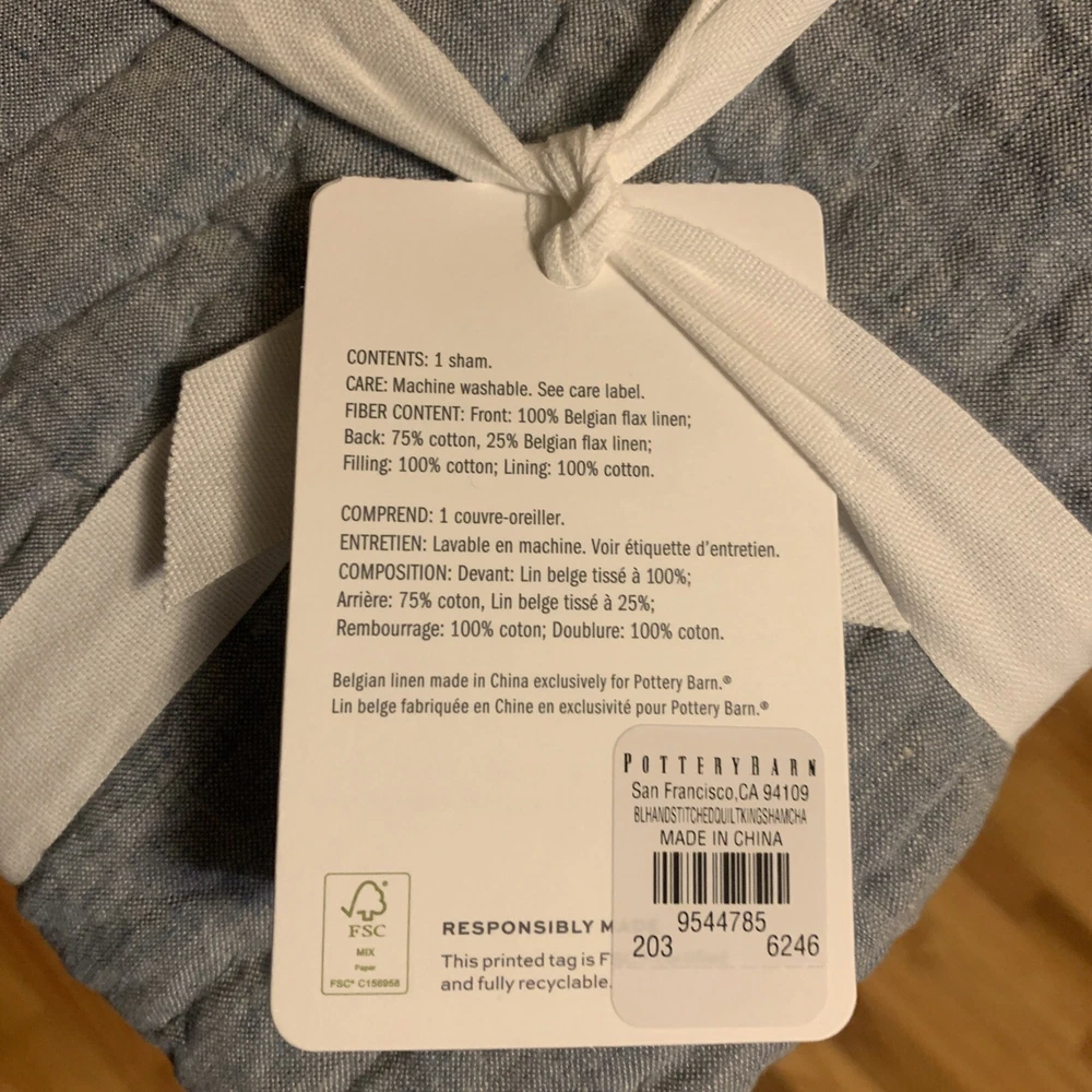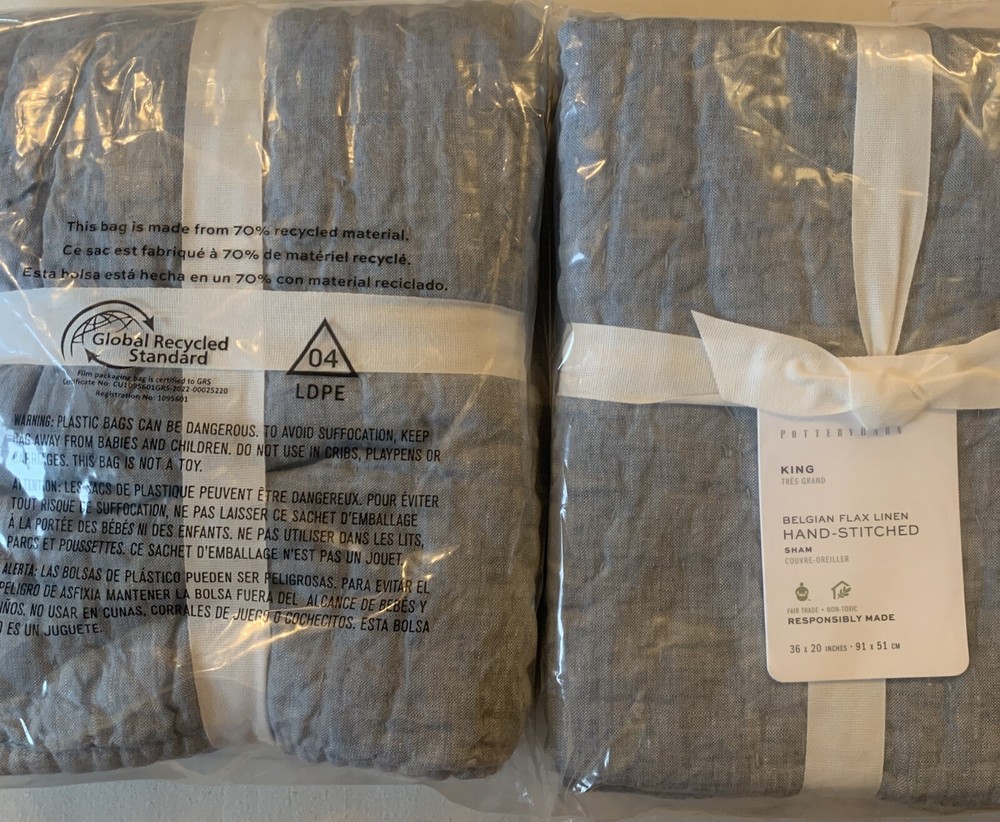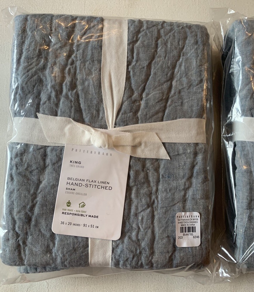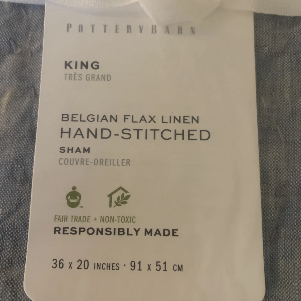 NEW 2 Pottery Barn Belgian Flax Linen Hand Stitched King Size Quilted SHAM Chambray You will receive 2 pillow shams. The epitome of casual luxury, quilted bedding is crafted of the finest heirloom linen and stitched by hand. Made at a Fair Trade Certified™ factory. Natural fibers, like offer beautiful, unique variations in color, ensuring your bedding is one of a kind. DETAILS Material: Linen is hand woven from 100% Belgian flax; reverse fabric is 75% cotton and 25% linen blend. Fill is 100% cotton. Natural Variation: Color variations are inherent to natural fibers, and slight variations may occur to what is shown online for our Flax color option. Secure Design: Quilted sham features an overlap closure. Place of Manufacture: Imported. CARE INSTRUCTIONS Machine wash in cold water separately on a gentle cycle. Use only non-chlorine bleach, if needed. Line or tumble dry on a low temperature. Warm iron as needed. DIMENSIONS KING Shams: 20" w x 36” l Ships from Oregon Keywords: pottery barn, cozy, casual, cottage, pillow cover, pillow sham, luxe, high quality
