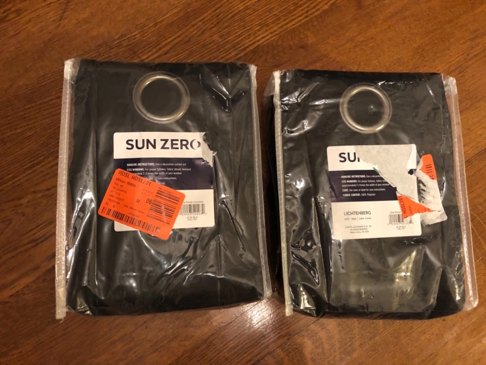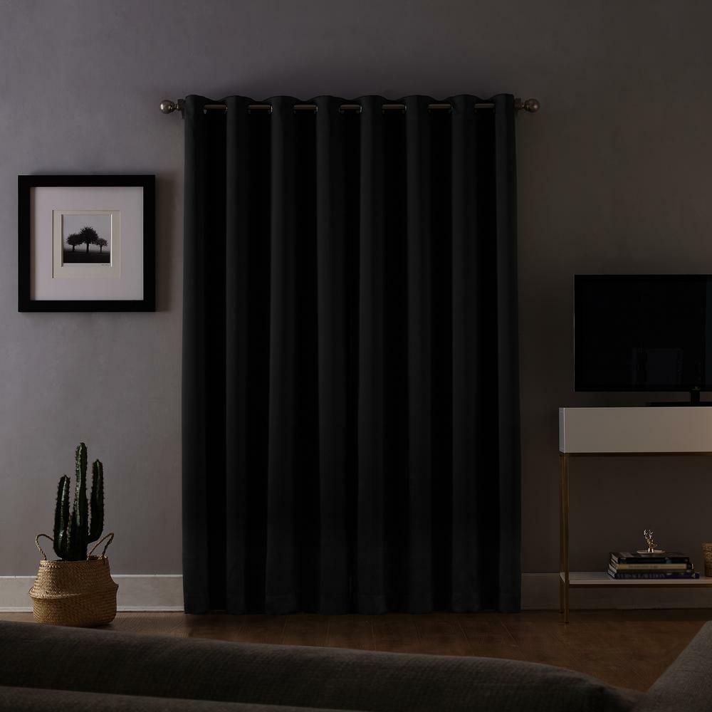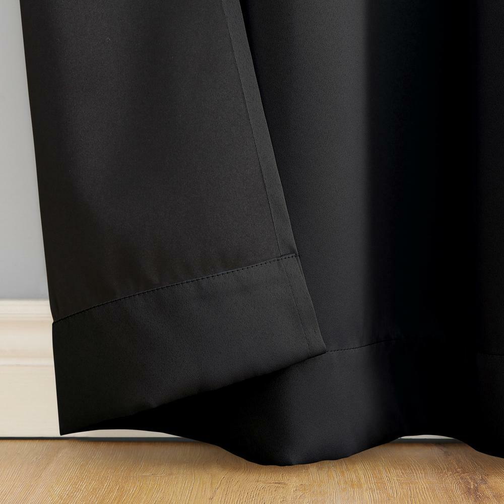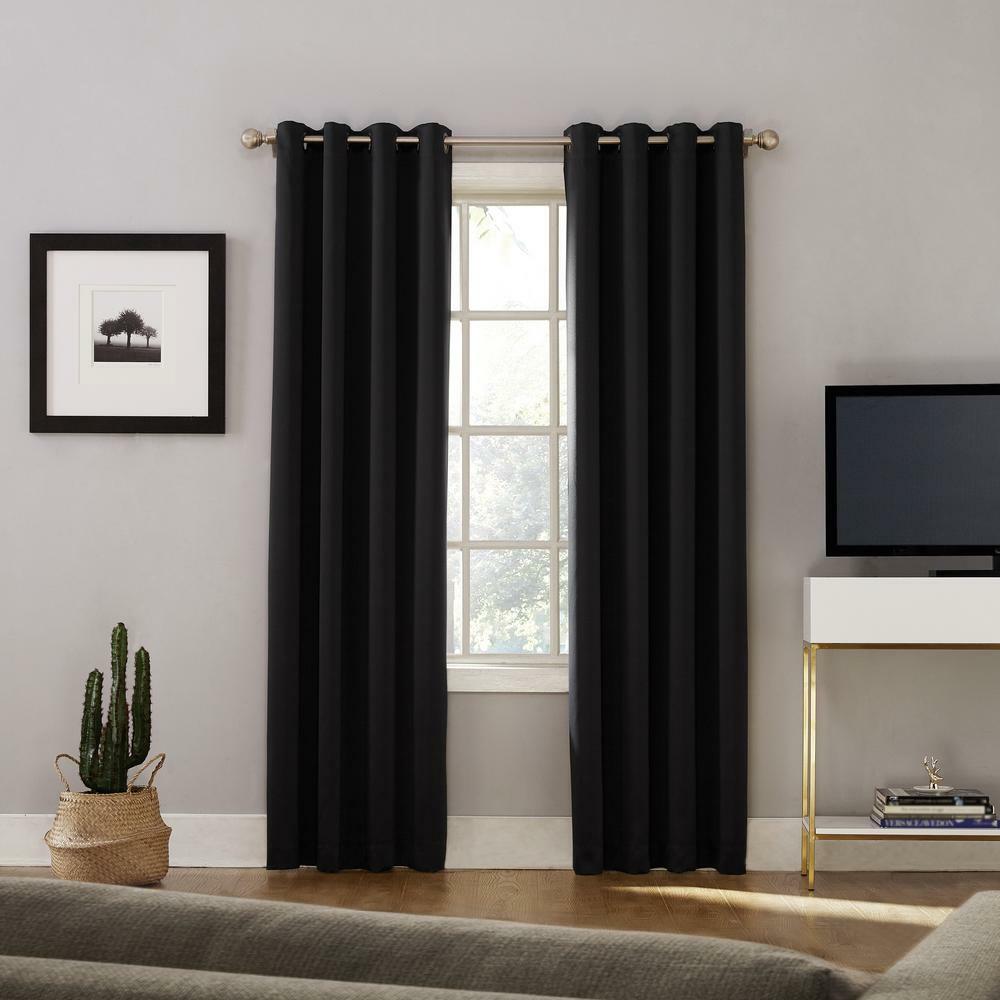 New item, in original package. This box contains two panels. Each package has one panel per package. Sun Zero Oslo Woven Home Theater Grade Blackout Black Grommet Single Curtain Panel - 52 in. W x 95 in. L Sun Zero Oslo Home Theater Grade Extreme Blackout Grommet Curtain Panel provide the ultimate in light blocking technology to keep out even the harshest of light while bringing an elegant urban sophistication to any room of your home. Sun Zero Extreme Blackout technology is laboratory tested to block out 100% of light, reduce outside noise by up to 35%, and decrease energy lost through your windows by up to 50%. Comfort is optimized with thermal properties that help keep summer heat and winter chill out of your home. Hang in your entertainment room to eliminate screen glare and reduce distracting outside noise, or in your bedroom for enhanced privacy and a sounder, more uninterrupted sleep. Machine wash cold on gentle cycle. Use non-chlorine bleach when needed. Tumble dry on low heat, using a cool iron as needed. Extreme blackout technology blocks out 100% of outside light Energy efficient design reduces energy lost through your windows by up to 50% Thermal properties help keep summer heat and winter chill out of your home Noise reduction by up to 35% helps you get a sounder, more uninterrupted sleep Includes 1 single grommet curtain panel made from machine washable material 100% Polyester Machine wash cold on gentle cycle, use non-chlorine bleach when needed, tumble dry on low heat, using a cool iron as needed Specifications Dimensions Product Depth (in.) 10.5 Product Height (in.) 52 Product Length (in.) 95 Product Width (in.) 52 Width (in) x Length (in) 52 x 95 Details Color Family Black Color Family Black Color/Finish Black Deco Style Casual Decor Type Window Treatment Fabric surface N/A Features Heat Control,Insulating,Noise Cancelling Hanging Style Grommet Included No Additional Items Included Individual/Set Individual Light Filtering Level Blackout Material Polyester Material Polyester (100%) Pattern Type Solid Product Weight (lb.) 2.85lb Returnable 90-Day Window Treatment Product Type Drapery Panel