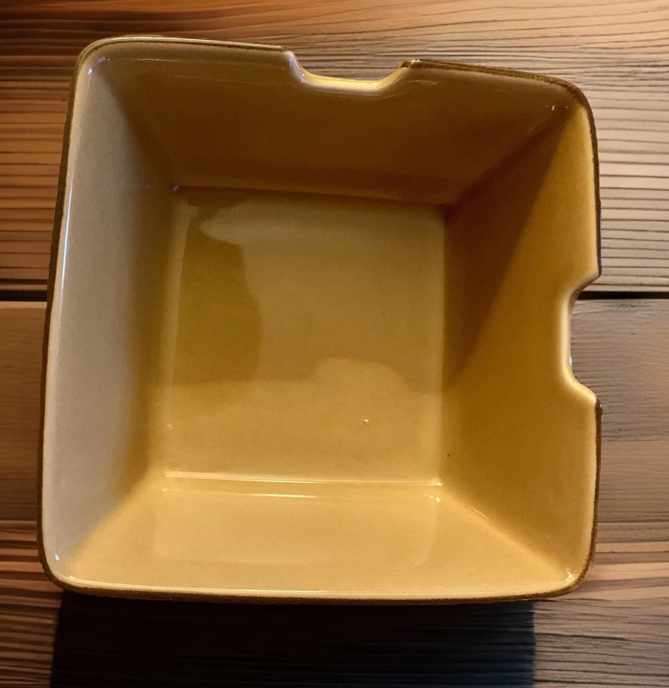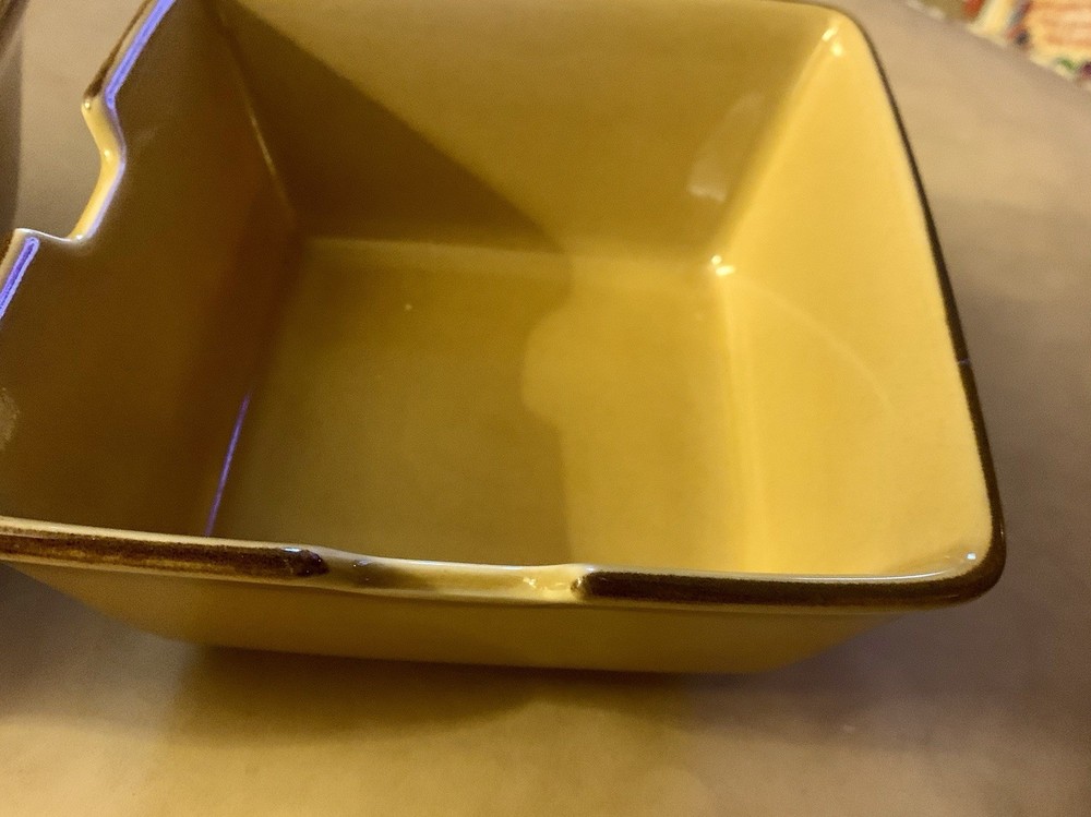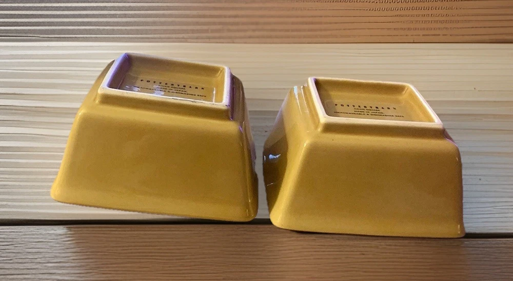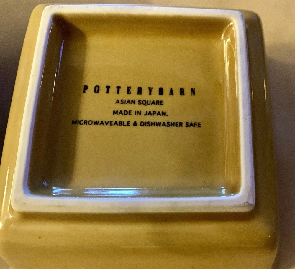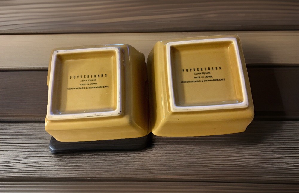 Very nice condition bowls. They look new! They have the cut out on two sides to rest your chopsticks or other utensils. Nice weight and size. There’s a nice brown color contrast on rims. These were from the Pottery Barn.