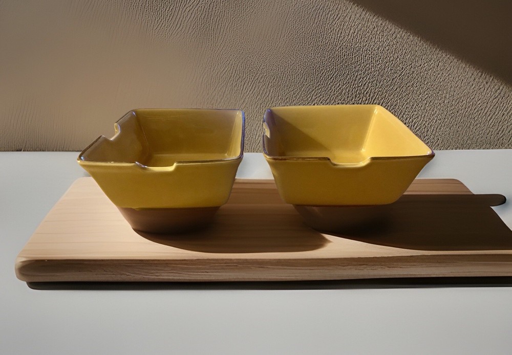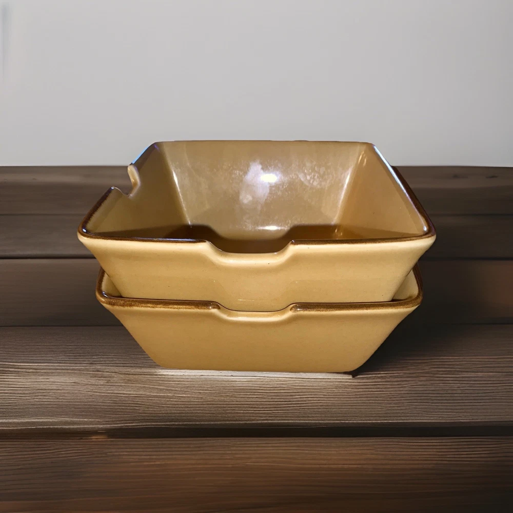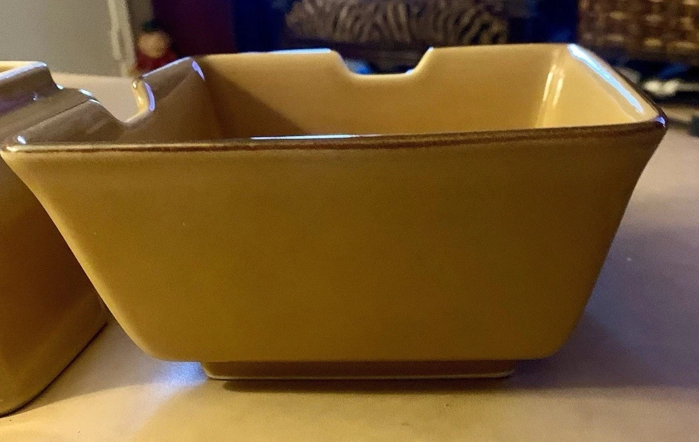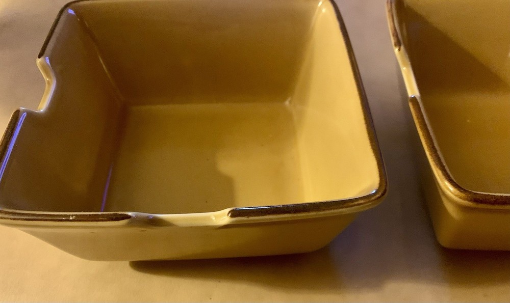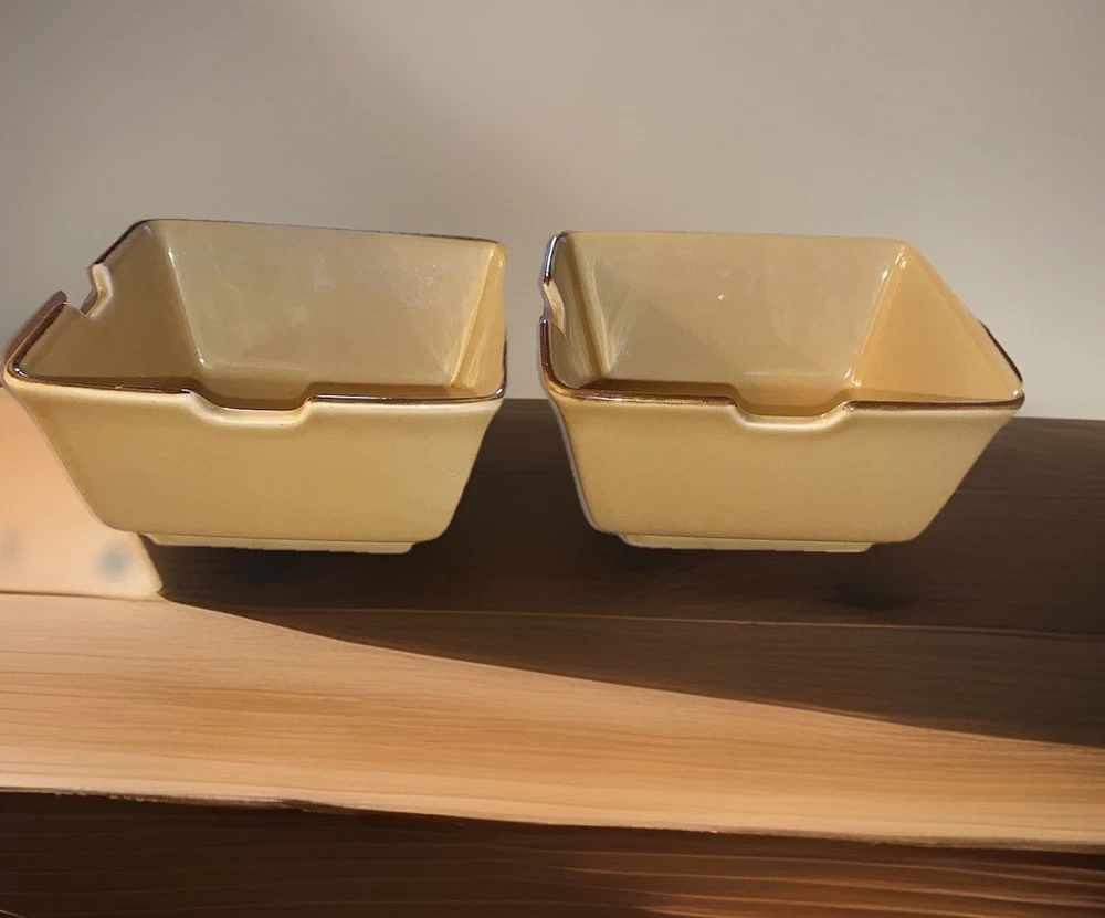 Very nice condition bowls. They look new! They have the cut out on two sides to rest your chopsticks or other utensils. Nice weight and size. There’s a nice brown color contrast on rims. These were fr...