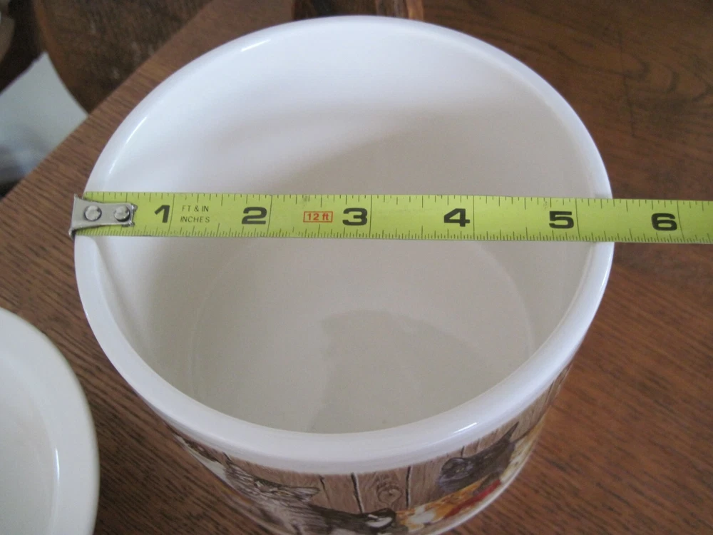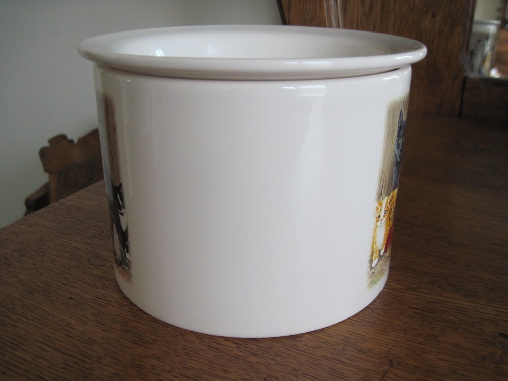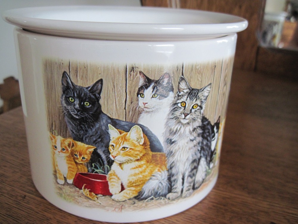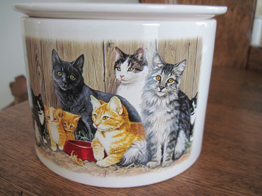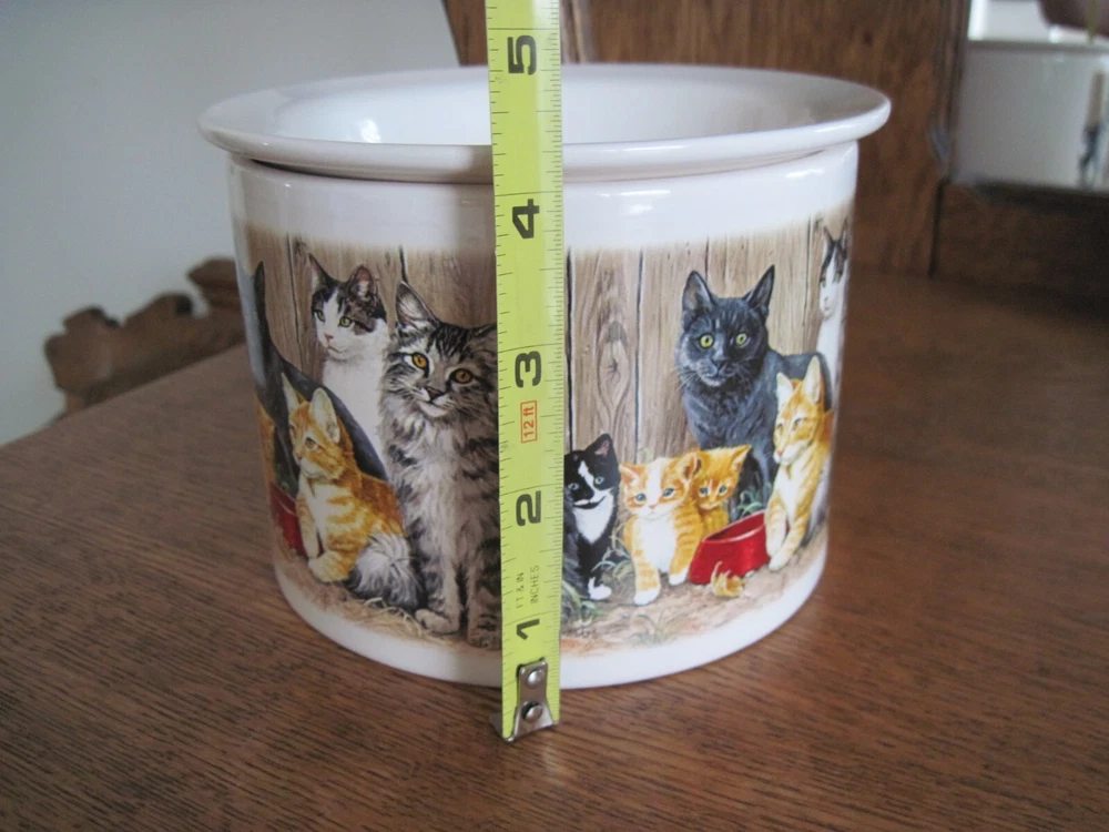 This is a 2-piece set of Ceramic/Porcelain Dip Server to keep your appetizer/dip cool. NOS. The larger section crock measures 5.5 inches in diameter x 4.25 inches tall. Ice cubes or reusable ice cubes are placed in this base. Barn cats displayed on front. The smaller section for the dip/appetizer etc. measures 6 inches x 2 inches. This dish sits inside the larger crock with the ice keeping the food cool for serving. Several little rough edges on rim - magnified in photo.