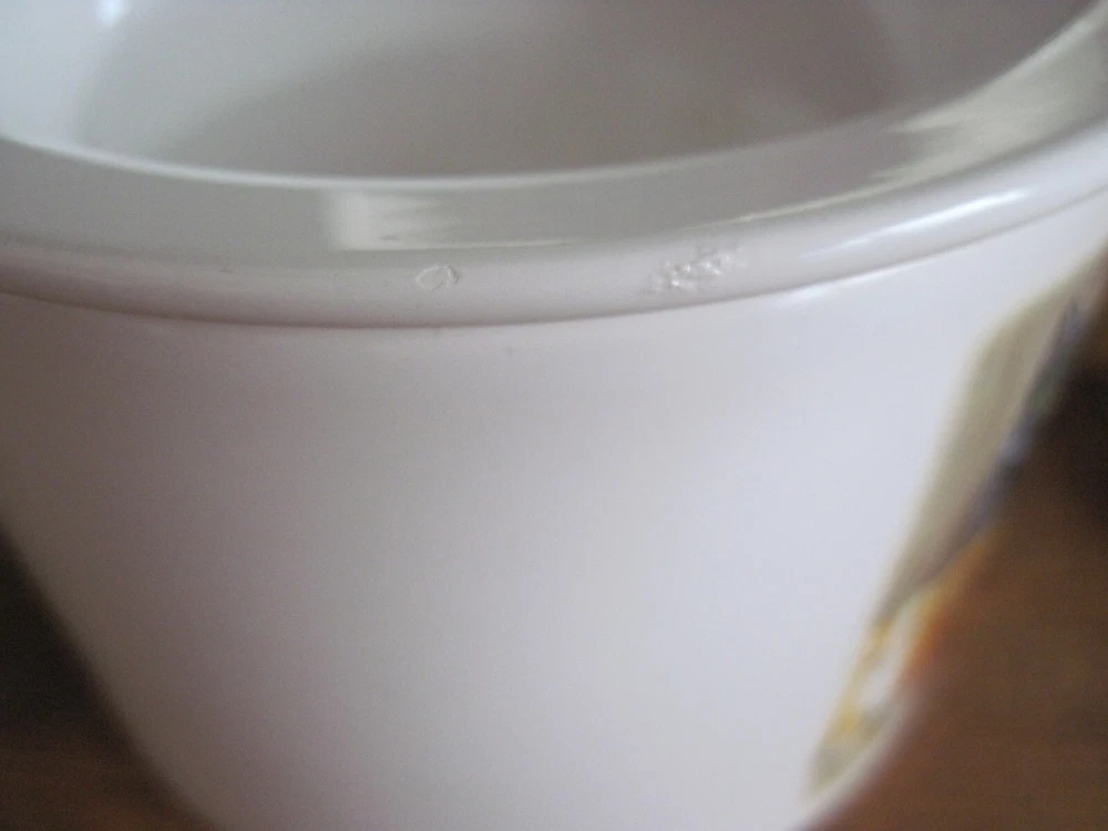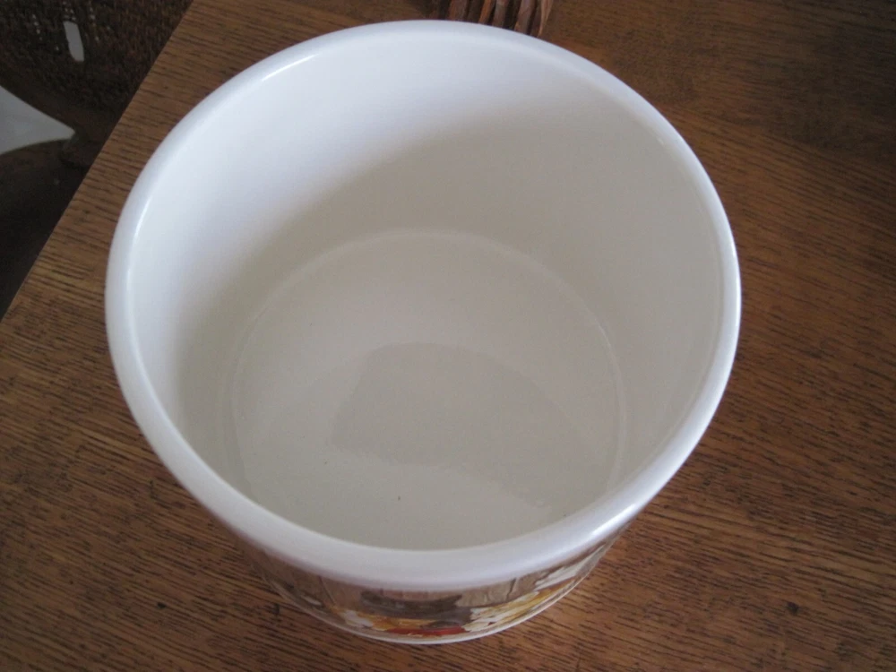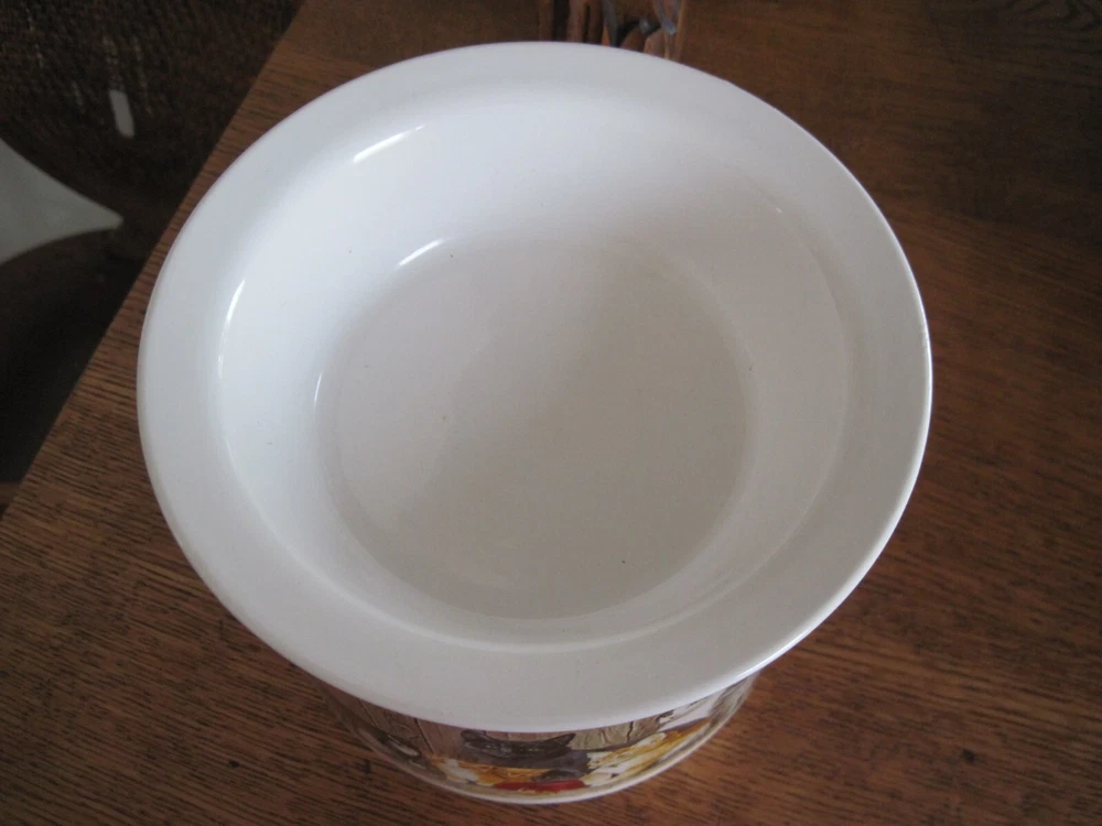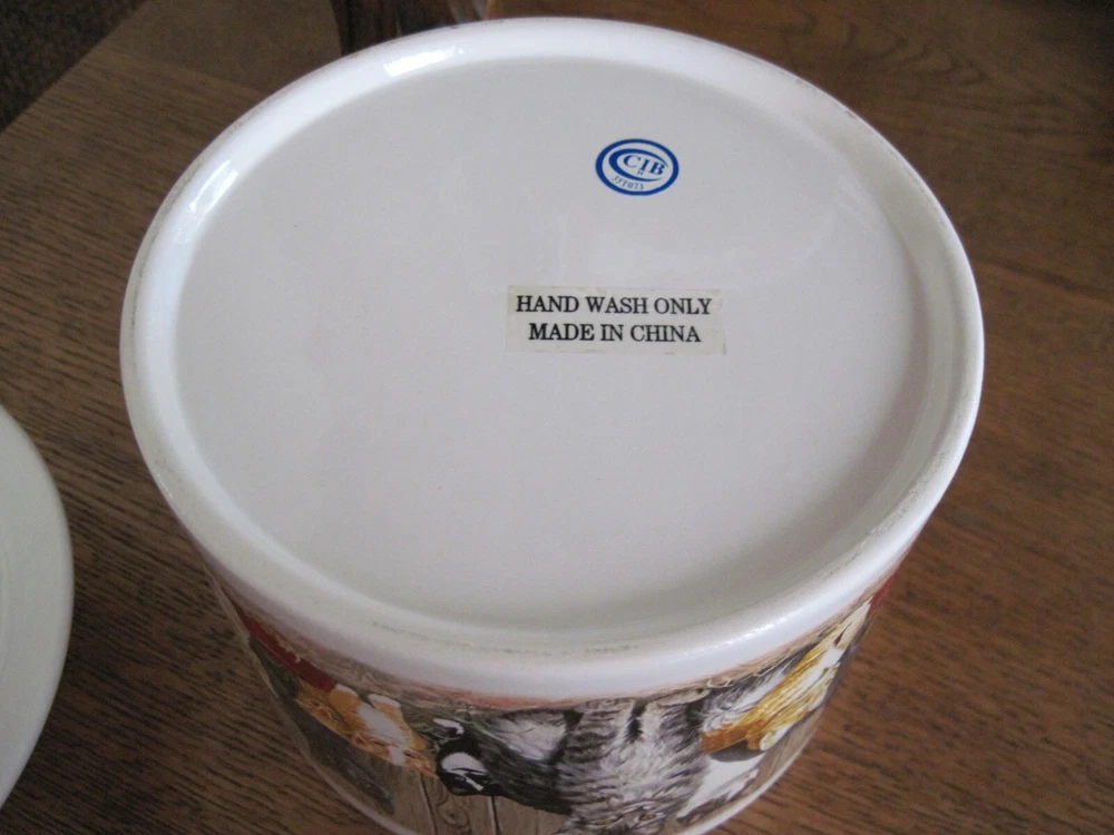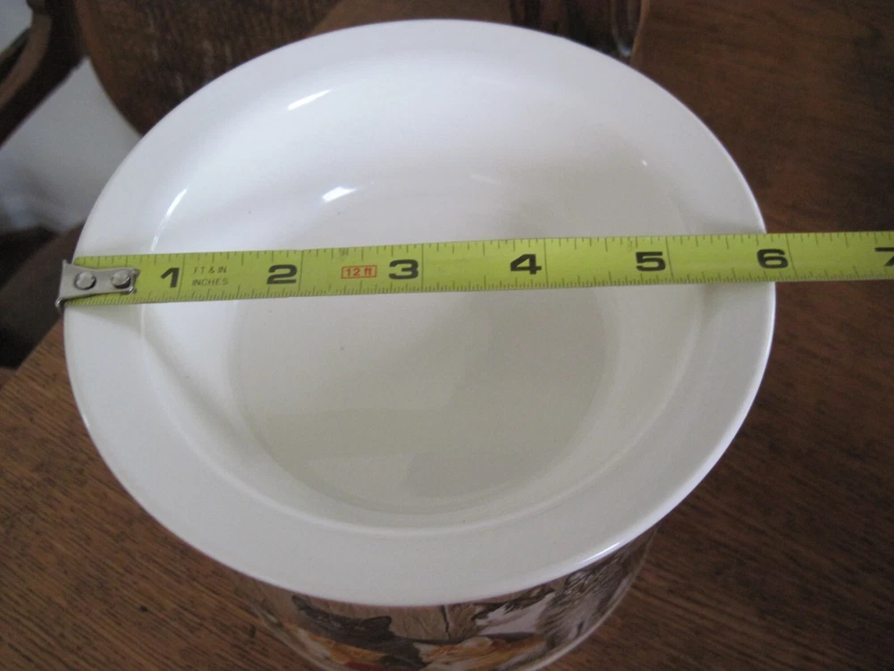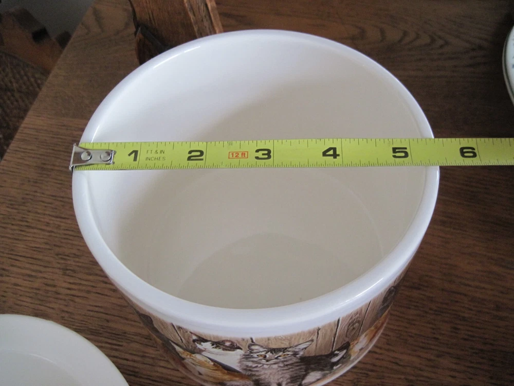 This is a 2-piece set of Ceramic/Porcelain Dip Server to keep your appetizer/dip cool. NOS. The larger section crock measures 5.5 inches in diameter x 4.25 inches tall. Ice cubes or reusable ice cubes are placed in this base. Barn cats displayed on front. The smaller section for the dip/appetizer etc. measures 6 inches x 2 inches. This dish sits inside the larger crock with the ice keeping the food cool for serving. Several little rough edges on rim - magnified in photo.
