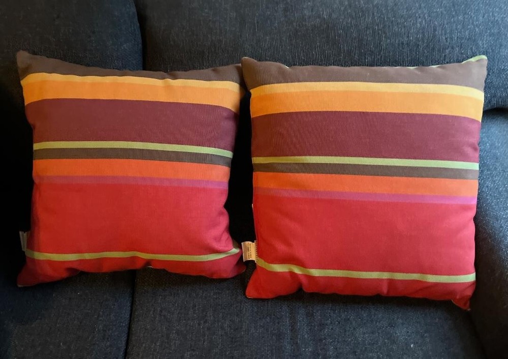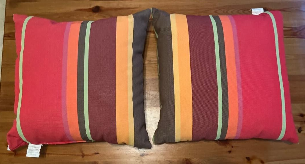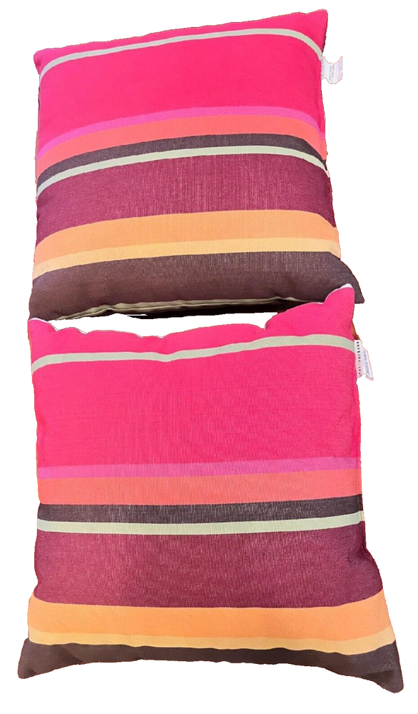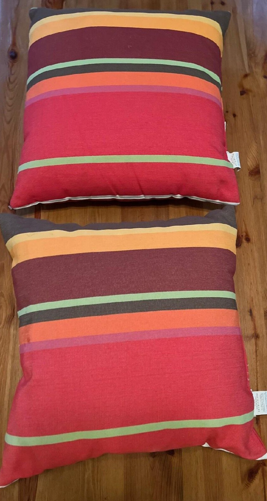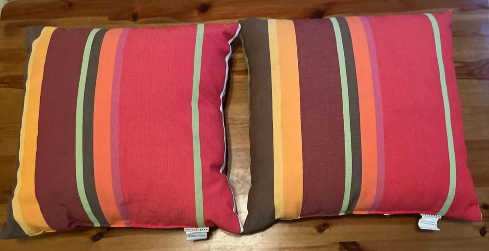 2 Pottery Barn 18" x 18" Striped Color Block Decorative Throw Pillows Made in Taiwan. Square Red, Orange, Brown, Yellow, Green. Needs a little cleaning. Good Condition