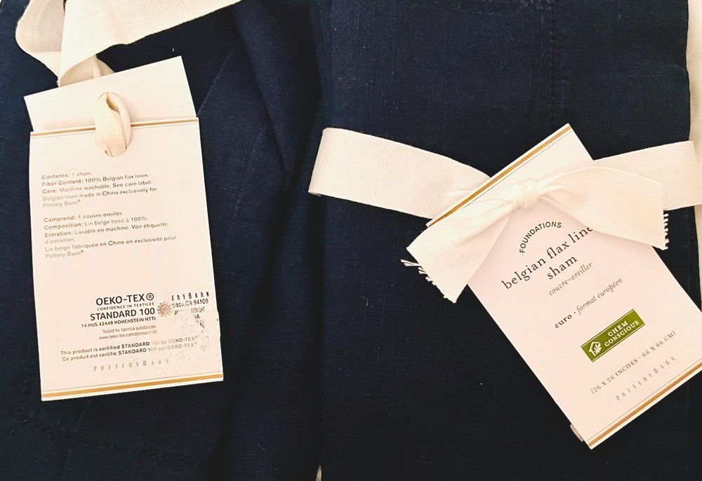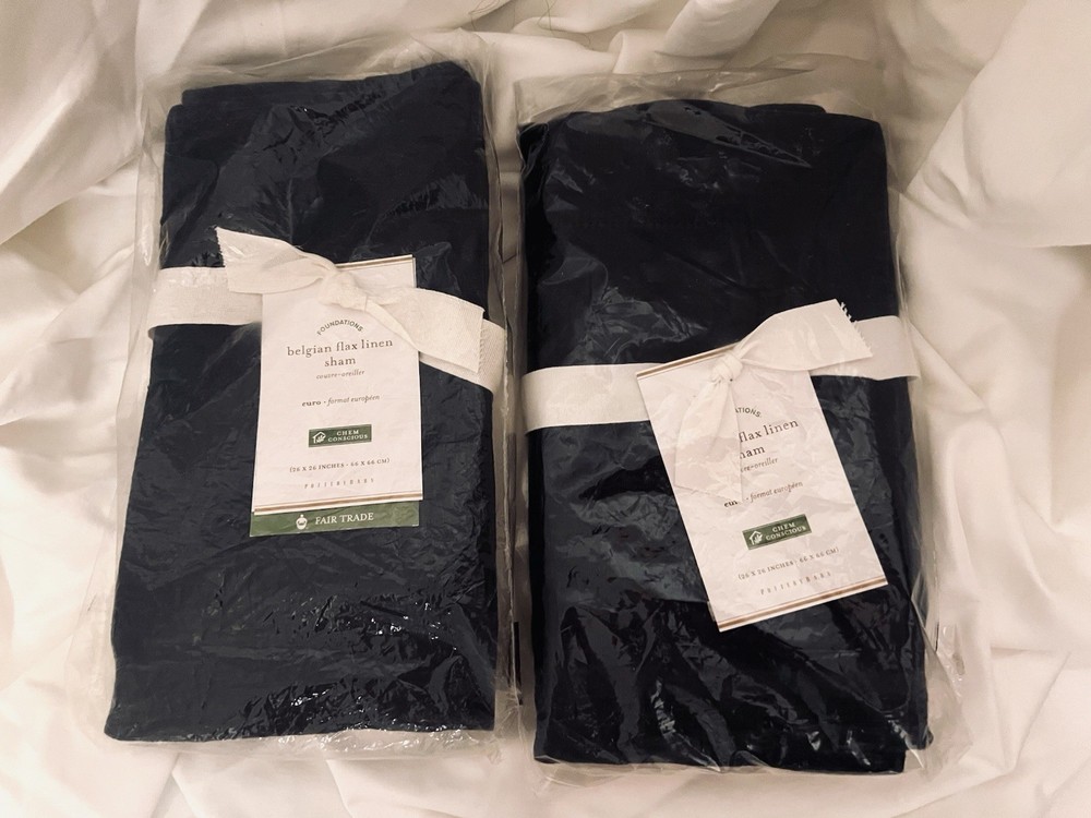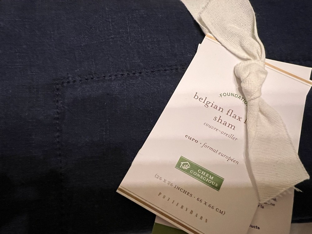 Pottery Barn Belgian Flax Linen Euro Shams in Midnight (Deep Blue)- EUC Quantity: 2 Size: Euro 26" x 26" w/2" Flange (30" x 30" including Flange) Detail: Open stitching boarder Closure: Envelope Back Located At Bottom end Condition: EUC Construction: • Made of 100% Belgium Flax Linen. • Yarn-dyed for long-lasting color. • Shams feature a side envelope closure. • Reverses to the same. • Color variations are inherent to natural fibers, and slight variations may occur to what is shown online for our Flax color option. • OEKO-TEX® STANDARD 100: tested for 1000+ harmful substances. • Imported. Care: • Machine wash in cold water; gentle cycle. Items were used for display/staging purposes. Please refer to stock photos of 'washed' linen look. Items have pressed and include original tags. Free of rips, tears , holes.