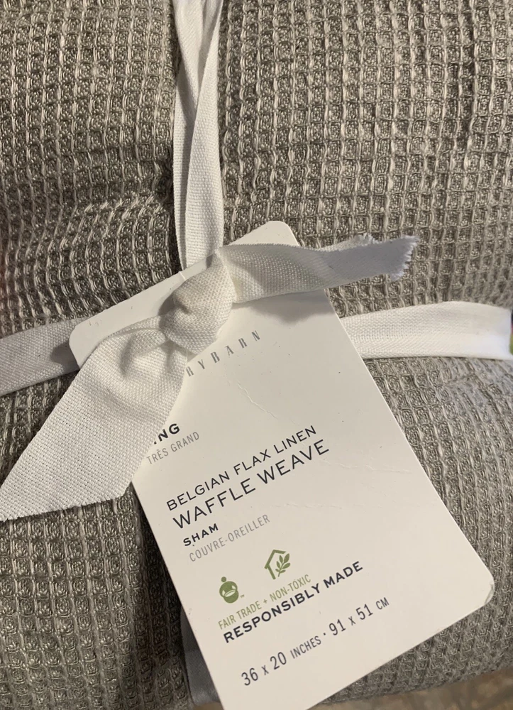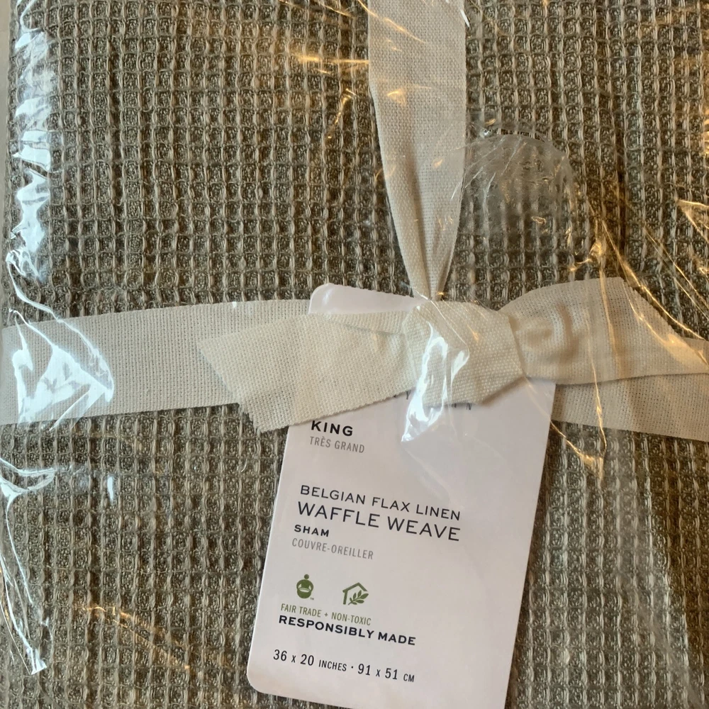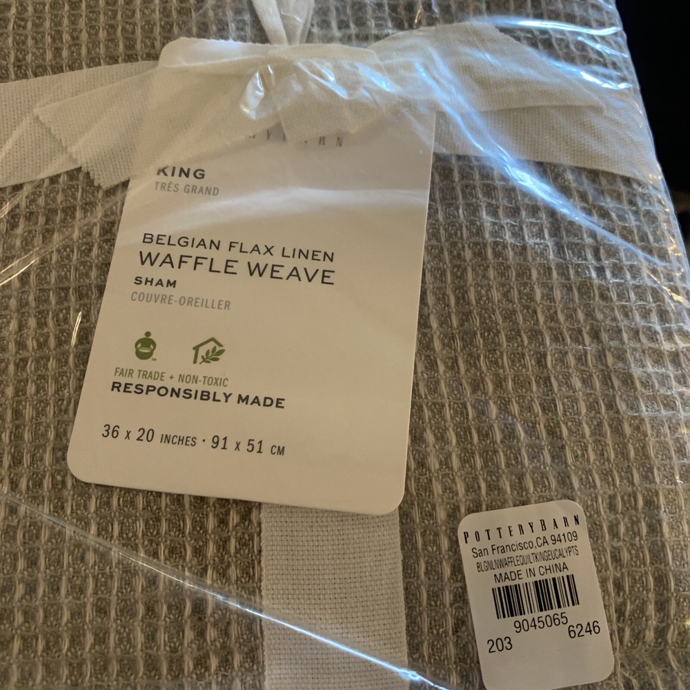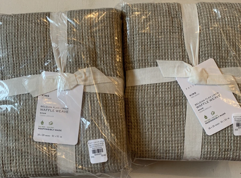 2 Pottery Barn Belgian Flax Linen WAFFLE WEAVE KING Quilted Pillow Shams with piped edge EUCALYPTUS New Front: 100% Belgian flax linen Back: 100% cotton Edge piping: 100% cotton Lining: 100% cotton Fill: 100% polyester Note: Color may have been renamed “bamboo” now Quilted shams with piped edging. 20” x 36” King size in EUCALYPTUS color - greenish taupe color Overlapping envelope closure *packaging may have been opened for the purpose of taking photos Woven from the world's finest European flax. It's prewashed for incredible softness and has a lived-in look and feel that only gets better with time. Natural fiber offers beautiful, unique variations in color ensuring your bedding is one of a kind. DETAILS Material: Made from 100% European Flax linen Front. Reverses to 100% cotton. Secure Design: Sham features an envelope closure. Natural Variation: Color variations are inherent to natural fibers and slight variations may occur. Certification and Standards: OEKO-TEX® STANDARD 100 certified, tested for 1000+ harmful substances (14.HUS.42449 HOHENSTEIN HTTI). Made in a Fair Trade Certified™ factory, empowering workers who made it. Place of Manufacture: Imported. CARE INSTRUCTIONS Machine wash in cold water; gentle cycle. Only non-chlorine bleach when needed. Tumble dry on low heat; remove promptly. Warm iron as needed. Ships from Oregon Keywords: eucalyptus, bamboo, quilted, quilt