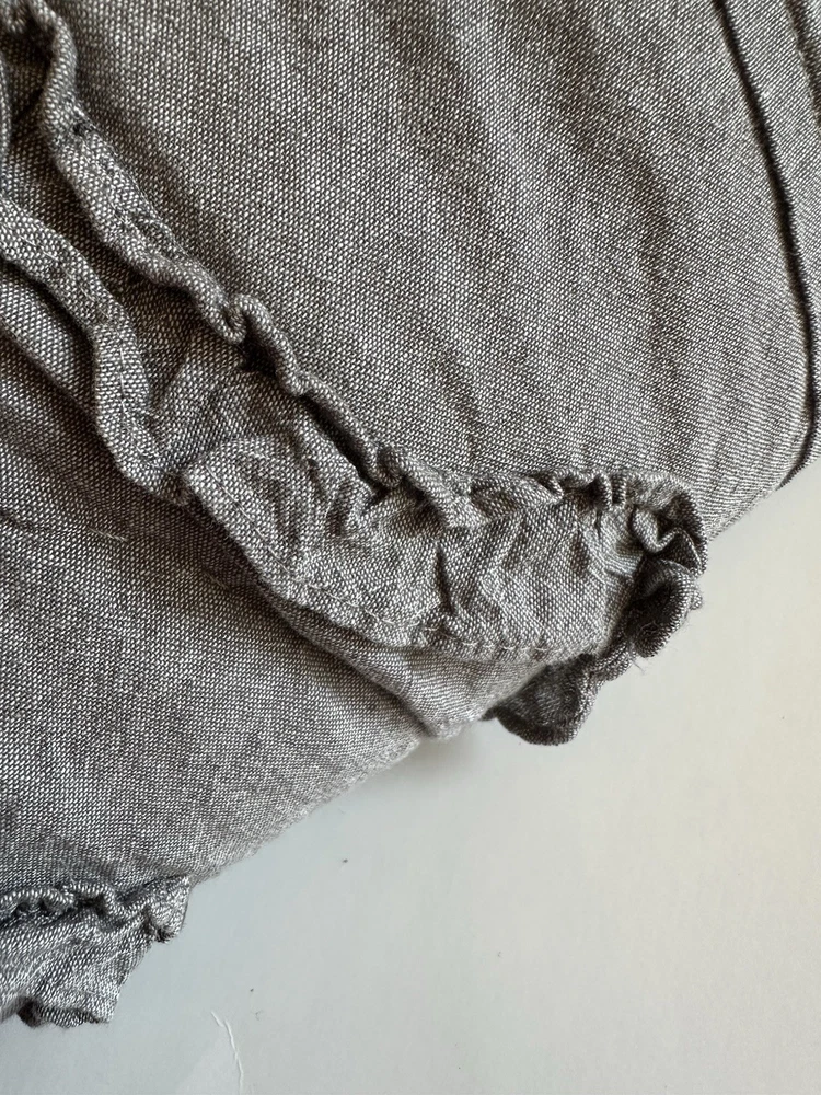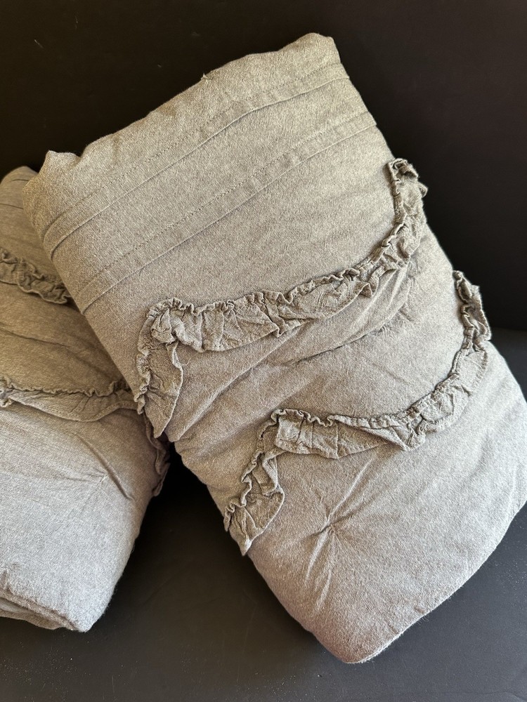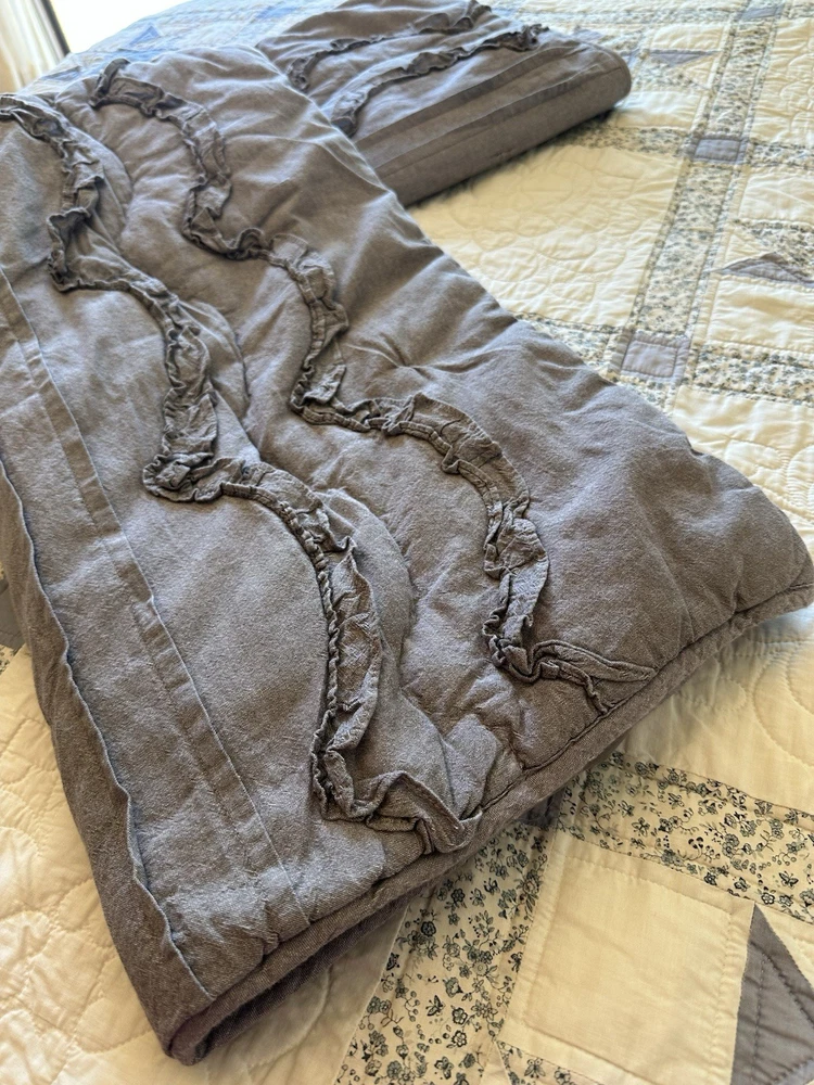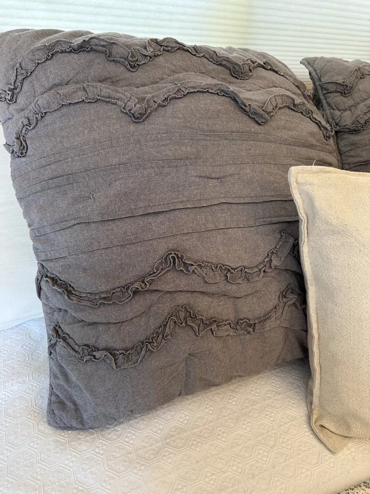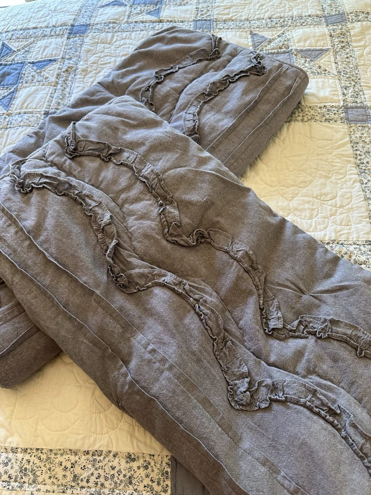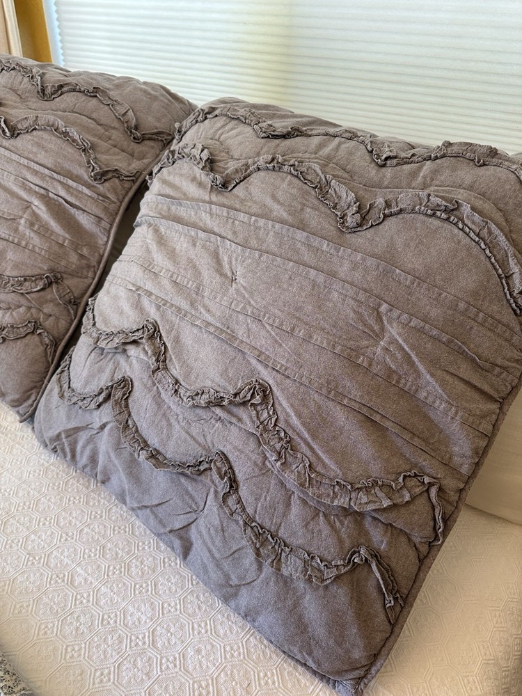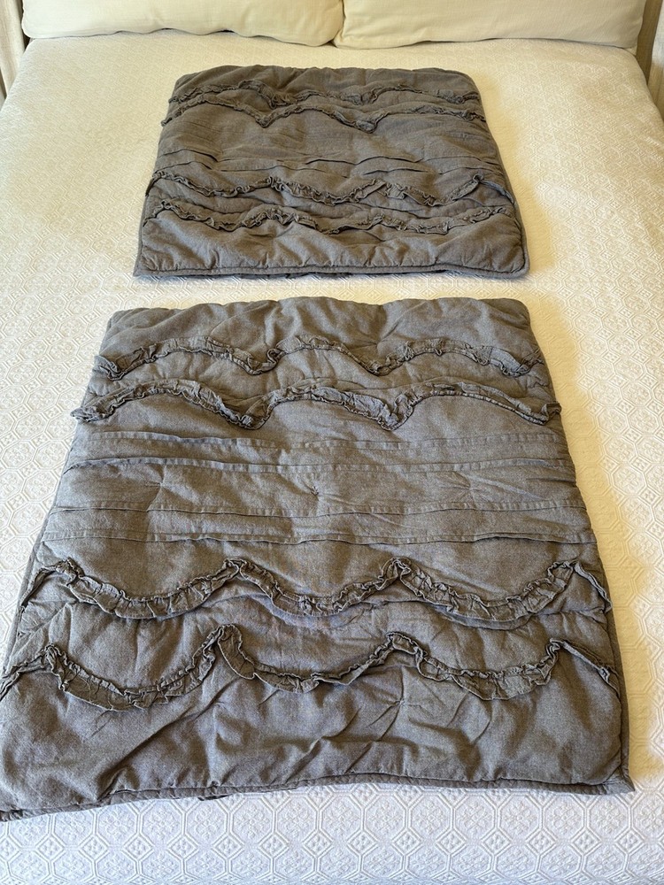 Pottery Barn Teen-Emily & Meritt Scallop Ruffle Euro Shams Ruffles and scallop patterns combines chic texture with relaxed chambray for a versatile look. Imagined exclusively for PBteen by celebrity stylists and fashion designers Emily Current and Meritt Elliott, it captures their classic and rebellious aesthetic. SET/2 EURO Pillow Shams-26 x 26" Color-Chambray Gray, it also blends well with a washed denim or blue gray. (see the photos with the quilt). Overall very versatile shams to layer with other solids or patterns. Material-100% Cotton . Filling 100% polyester. 40% recycled polyester Condition: Good, clean, gently used condition. Freshly laundered and pressed.