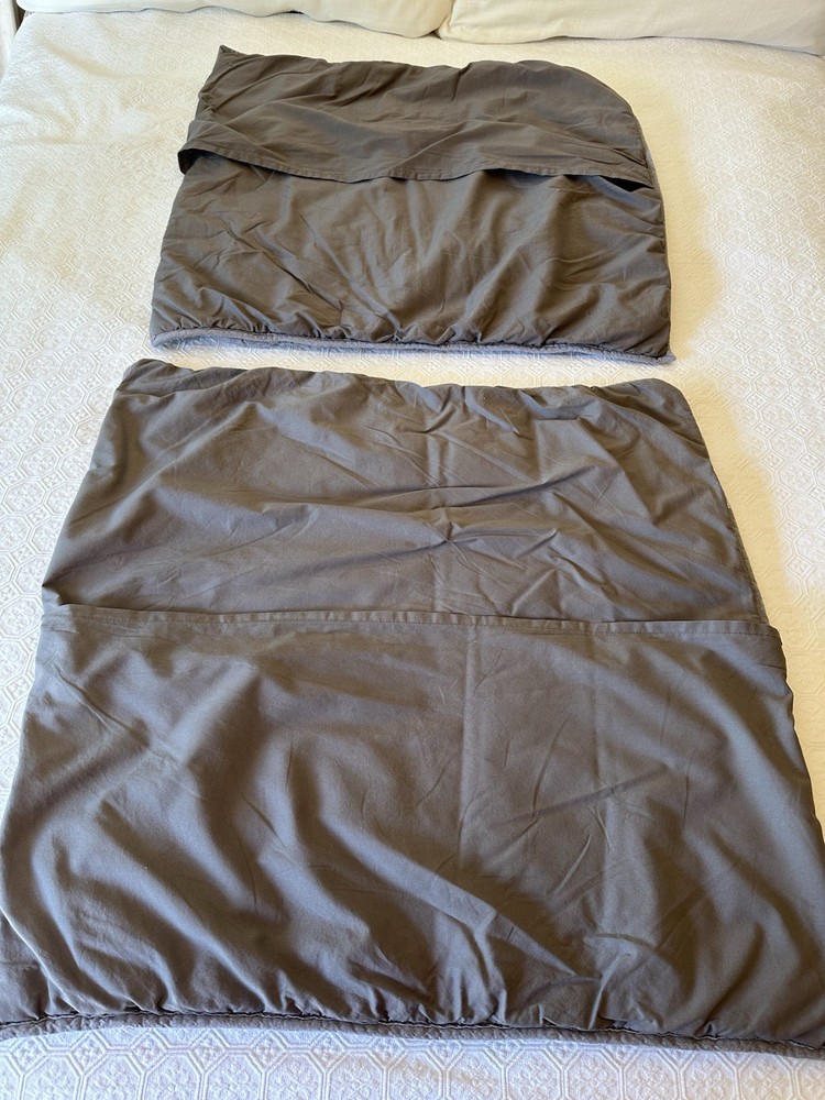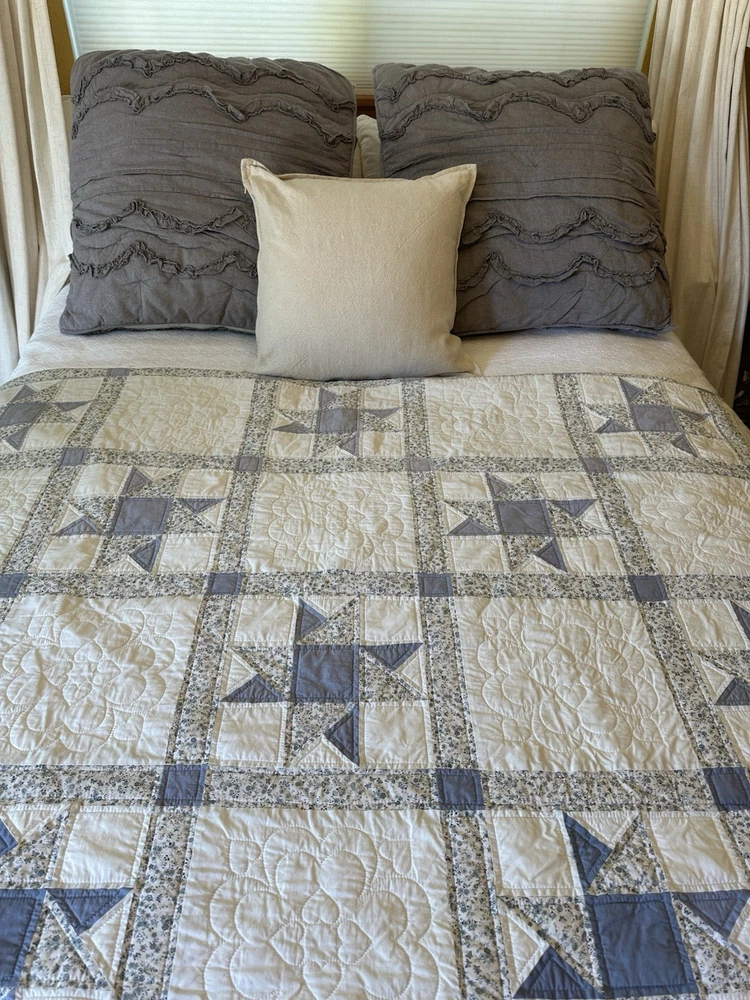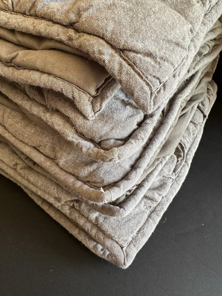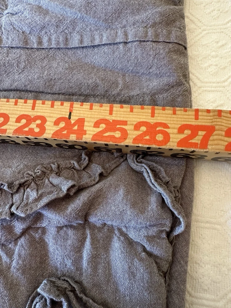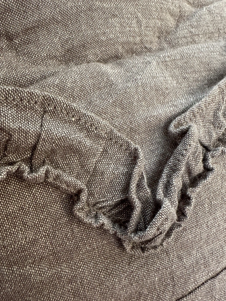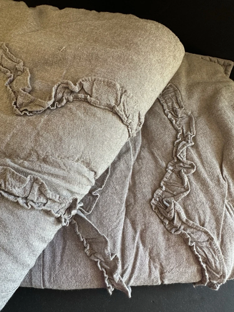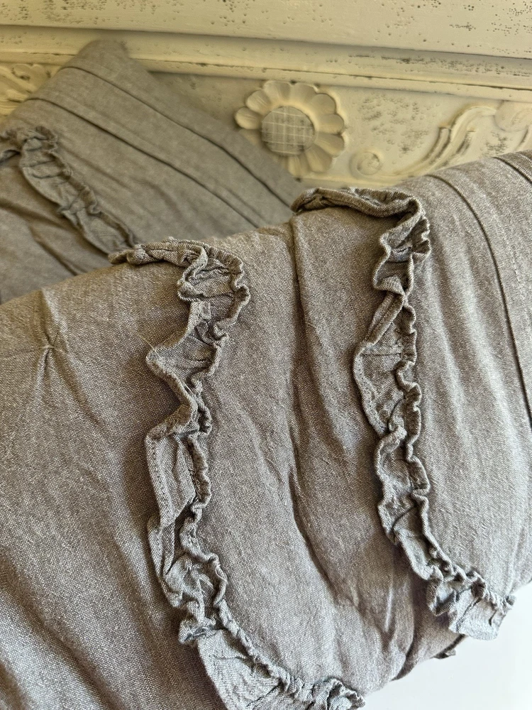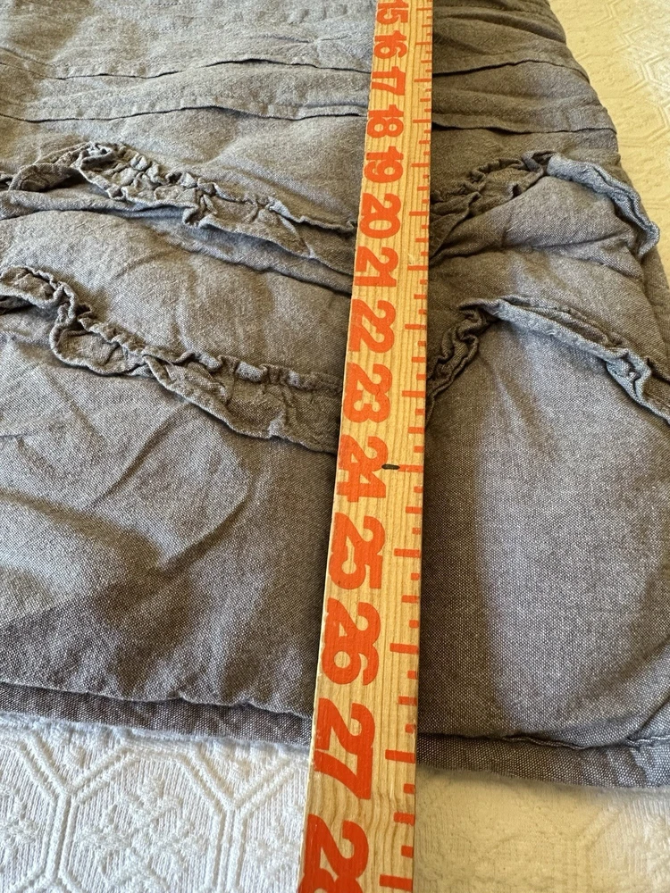 Pottery Barn Teen-Emily & Meritt Scallop Ruffle Euro Shams Ruffles and scallop patterns combines chic texture with relaxed chambray for a versatile look. Imagined exclusively for PBteen by celebrity stylists and fashion designers Emily Current and Meritt Elliott, it captures their classic and rebellious aesthetic. SET/2 EURO Pillow Shams-26 x 26" Color-Chambray Gray, it also blends well with a washed denim or blue gray. (see the photos with the quilt). Overall very versatile shams to layer with other solids or patterns. Material-100% Cotton . Filling 100% polyester. 40% recycled polyester Condition: Good, clean, gently used condition. Freshly laundered and pressed.