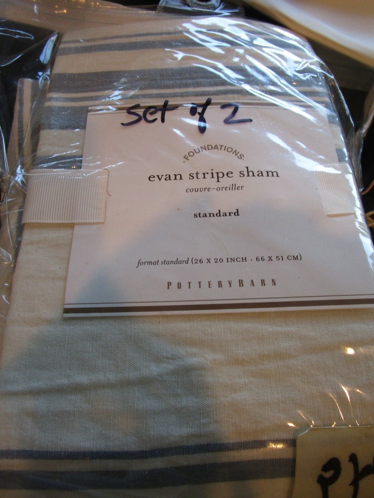 Up For Auction is - 2 Pottery Barn Evan stripe blue standard shams New w tag pet and smoke free...