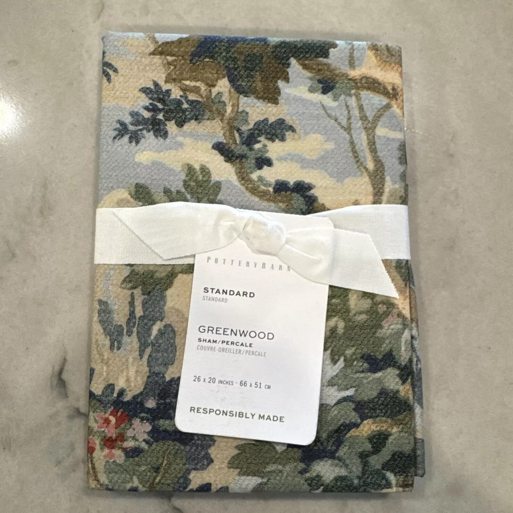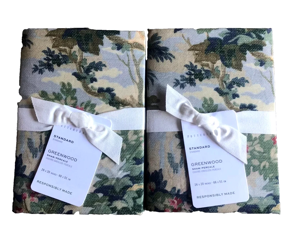 Pottery Barn Greenwood Percale 2 Standard Shams New with Tags PB describes as: A vintage pattern inspired this design, our modern take on traditional toile. With a painterly touch, it brings a lush layer of color to the bedroom. Made of 75% organic cotton and 25% recycled cotton. Shams features an overlap closure. OEKO-TEX® STANDARD 100: tested for 1000+ harmful substances. 14.HUS.42449 HOHENSTEIN HTTI. By choosing our cotton products, you’re supporting our investment in Better Cotton’s mission. This product is sourced via mass balance and therefore may not contain Better Cotton. Inserts are sold separately. Imported. Standard Shams: 26" h x 20" w Machine wash in warm; gentle cycle. Only non-chlorine bleach when needed. Tumble dry on low heat; remove promptly. Warm iron, as needed. Pet & Smoke free Ships within 1 business day. Thank you