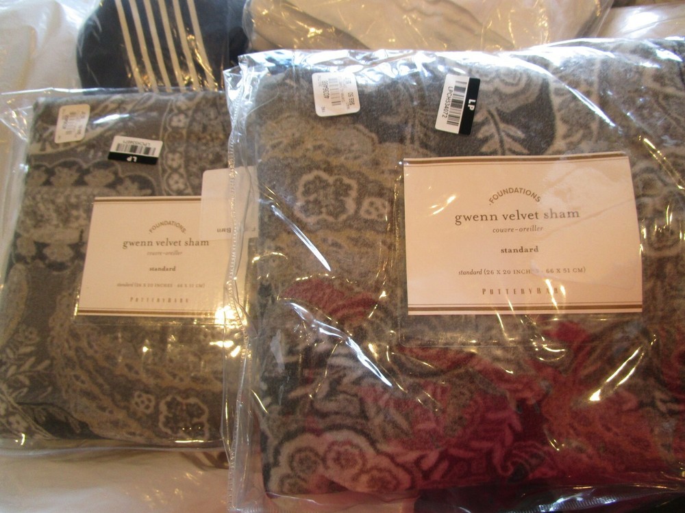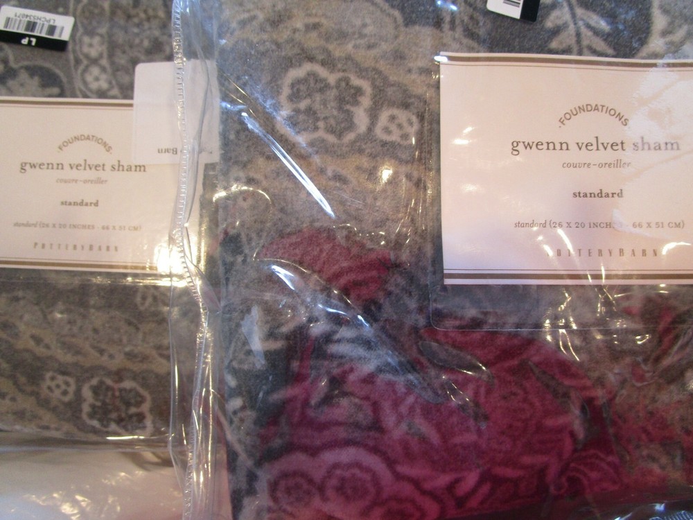 Up For Auction is - 2 Pottery Barn Gwenn velvet standard shams gray New w tag Hand quilted of 100% cotton velvet. Hand tucked. Quilt reverses to solid cotton sateen. Quilted sham has a flap closure. 250-thread count. Smoke and pet free home.