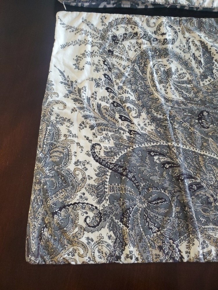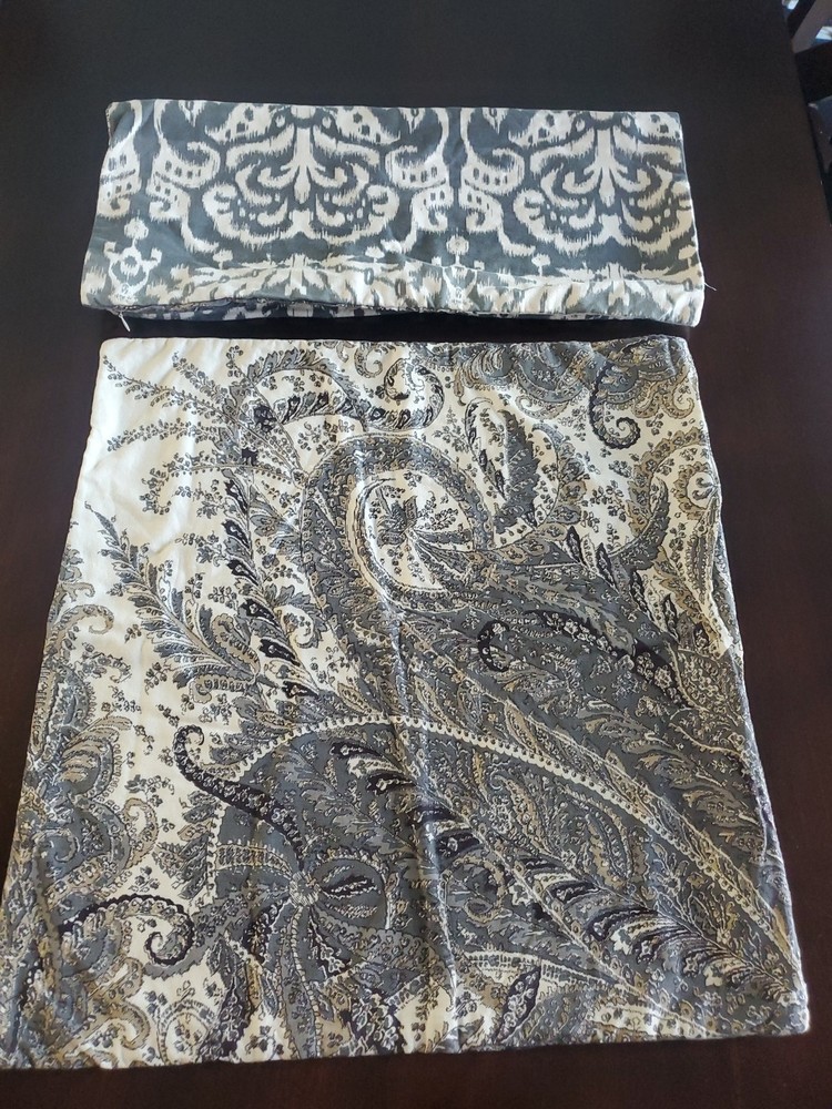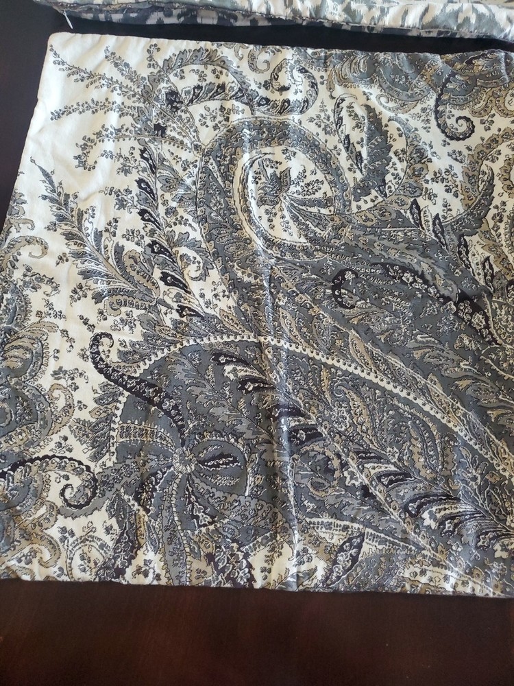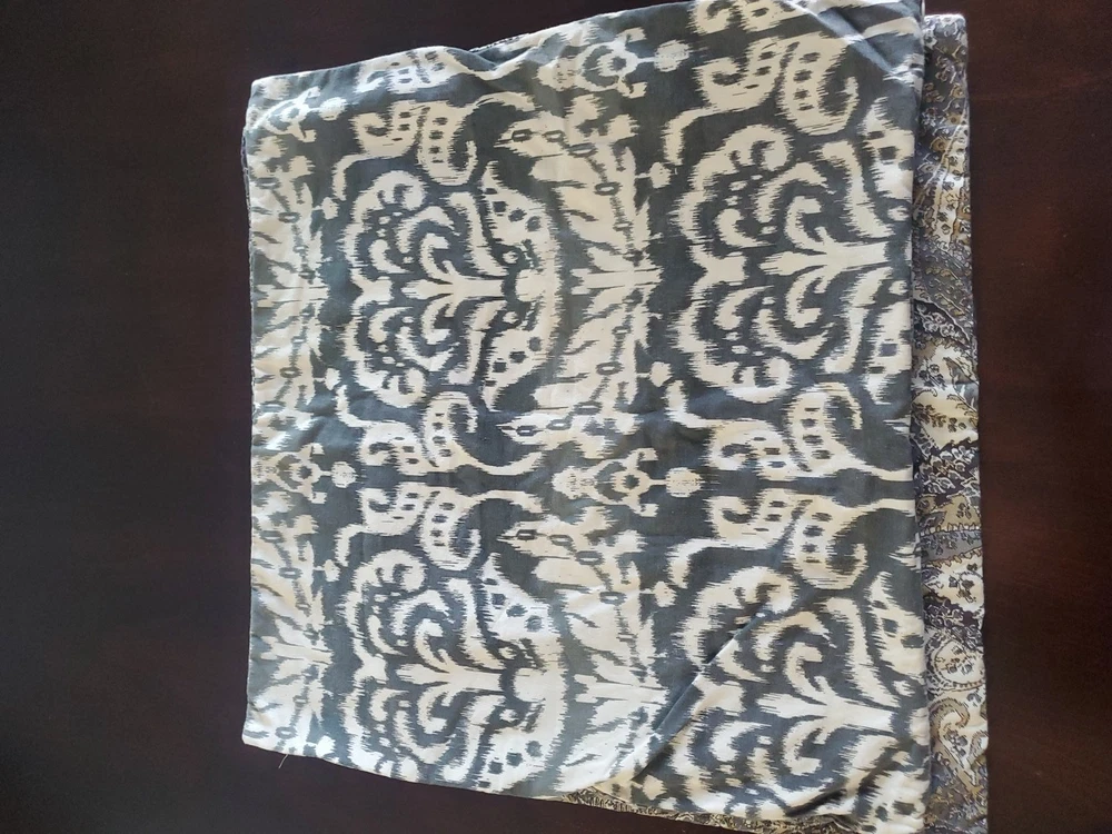 This set includes two Pottery Barn accent pillow covers in a square shape with a size of 24 x 24 inches. The covers feature a reversible design with paisley and ikat patterns in shades of gray and brown. Made of 85% cotton and 15% linen from India, they have a zip closure for easy removal and care instructions for machine washing. Perfect for adding a French Country touch to a bedroom, living room, or sunroom. Preowned item, please see photos as part of the description. Thanks for watching! Please feel free to visit my store for more fun items!