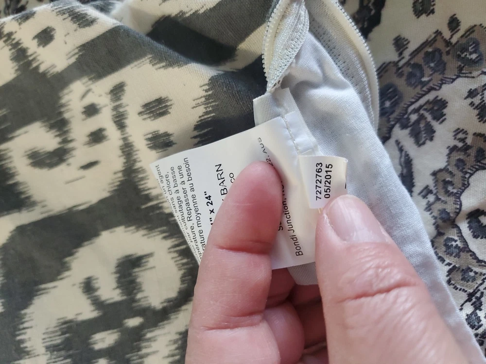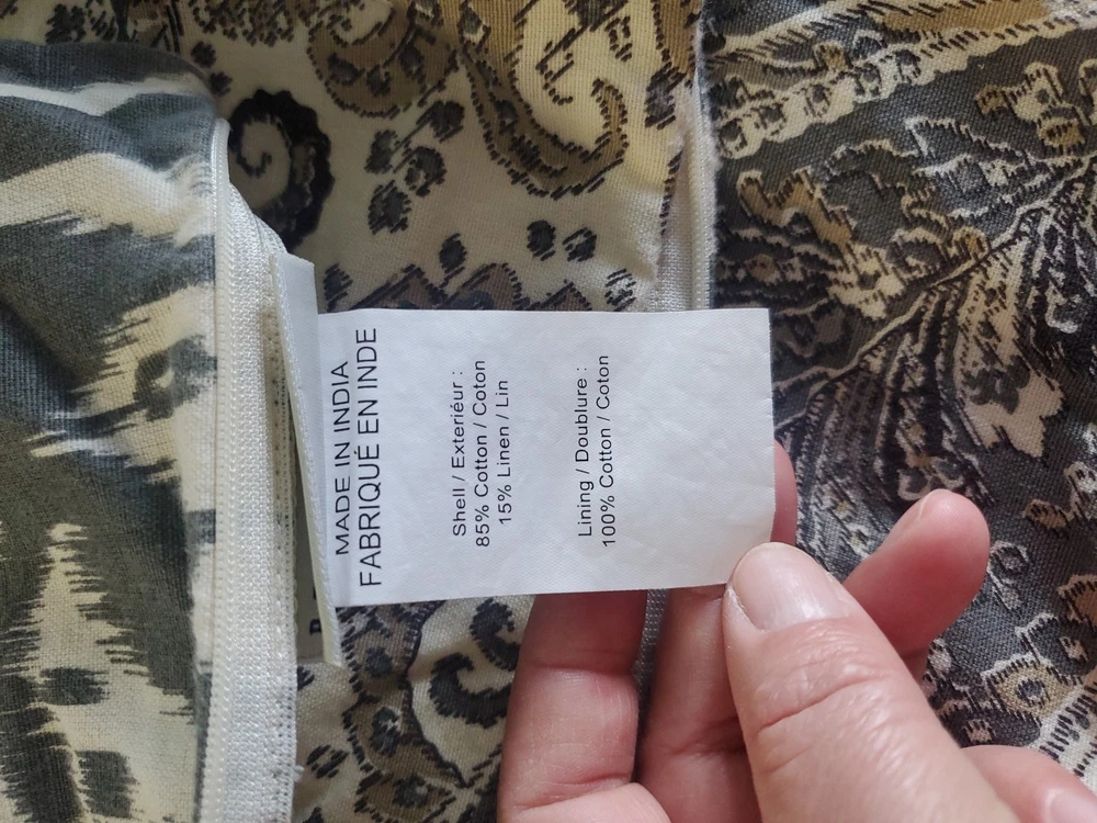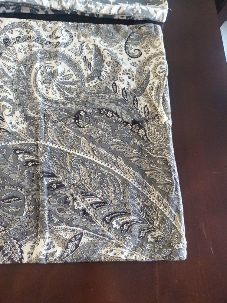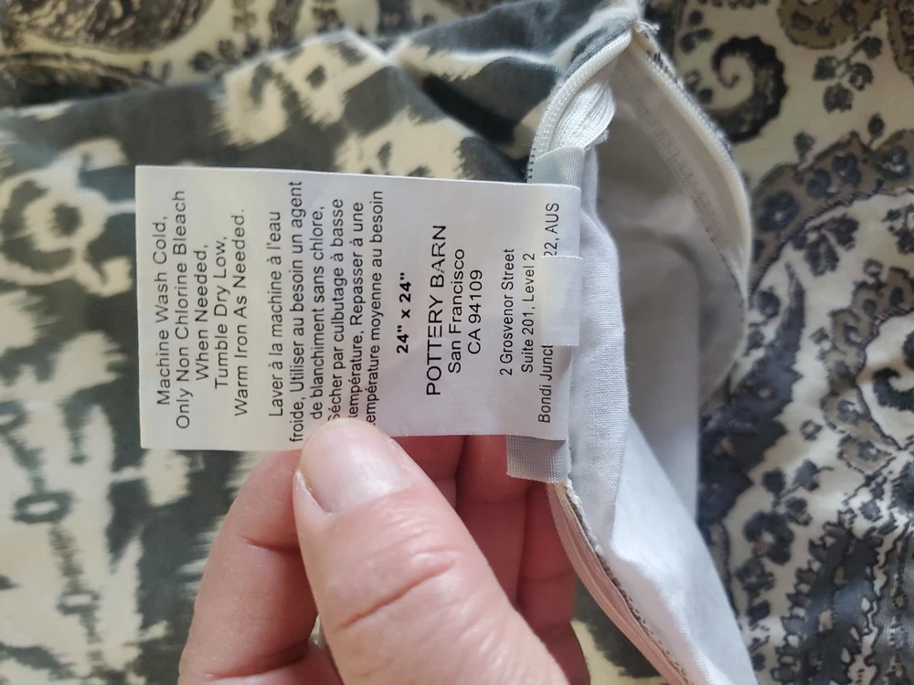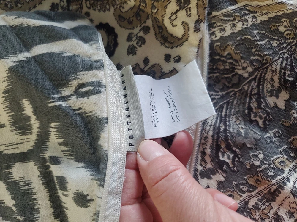 This set includes two Pottery Barn accent pillow covers in a square shape with a size of 24 x 24 inches. The covers feature a reversible design with paisley and ikat patterns in shades of gray and brown. Made of 85% cotton and 15% linen from India, they have a zip closure for easy removal and care instructions for machine washing. Perfect for adding a French Country touch to a bedroom, living room, or sunroom. Preowned item, please see photos as part of the description. Thanks for watching! Please feel free to visit my store for more fun items!
