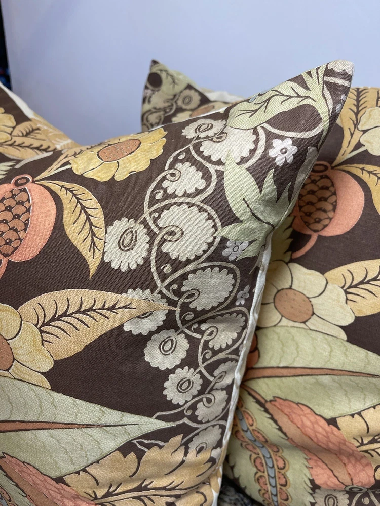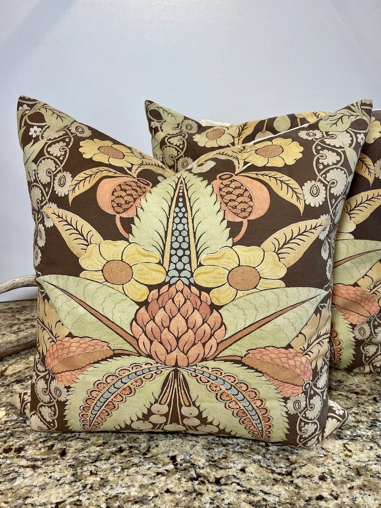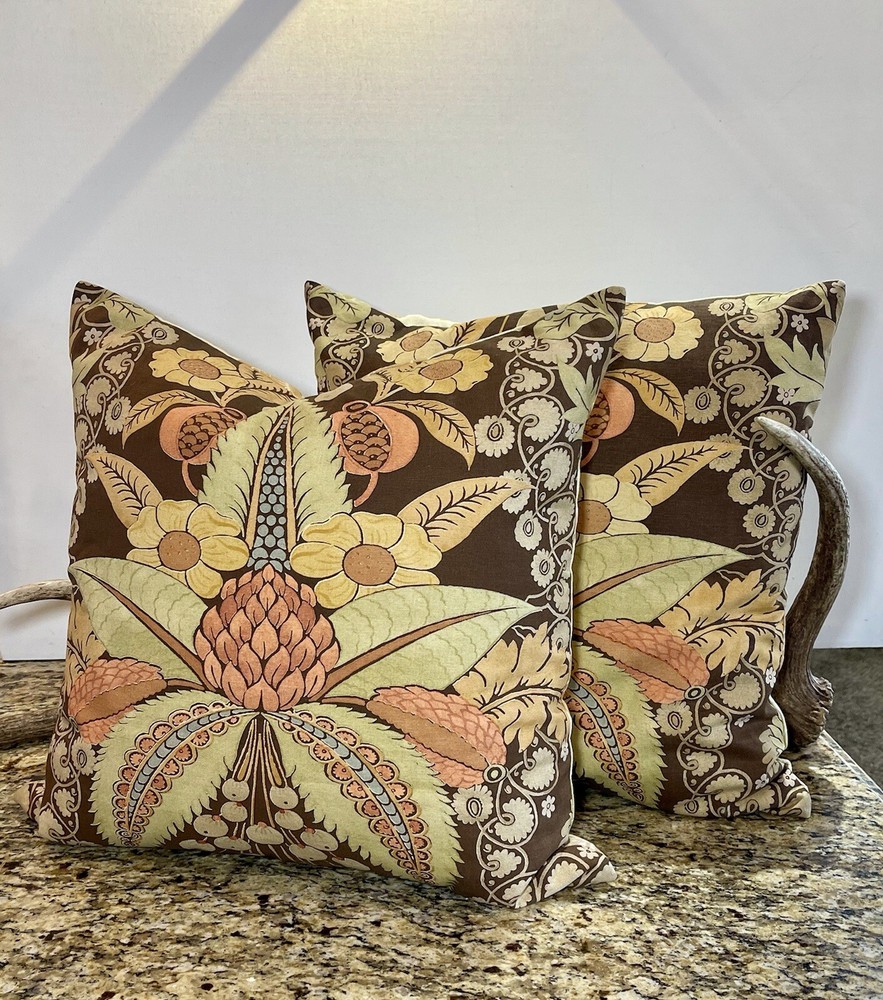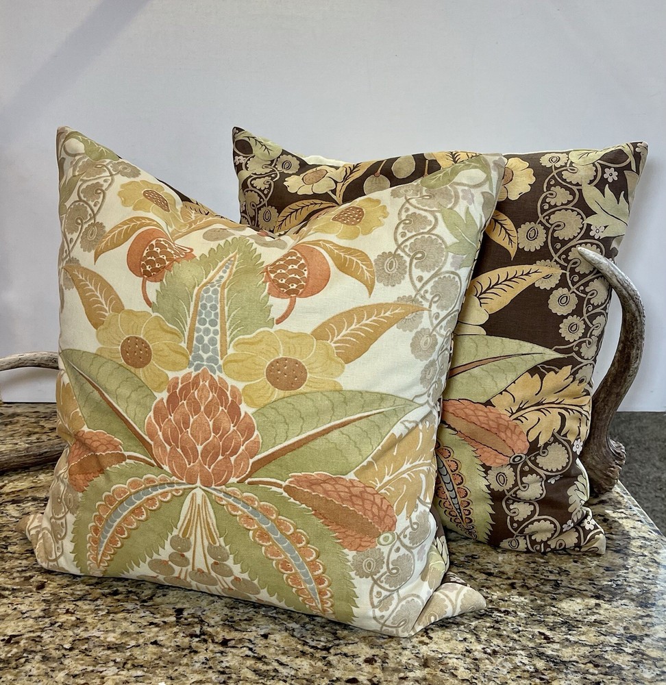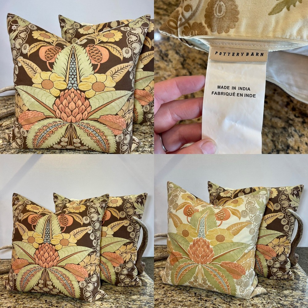 (2) Pottery Barn Reversible Floral Leaf Throw Accent Pillows Browns Inserts 20”. RETIRED PRINT 2013 Set of (2) MATCHING 20”x20” Accent pillows With inserts * Reversible * Good condition! Inserts are not pottery barn 1 insert is duck feathers 1 insert polyester filling