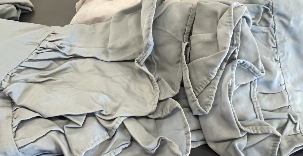 Up For Auction is - 2 Pottery Barn Tencel ruffle euro shams gray New Smoke and pet free home.