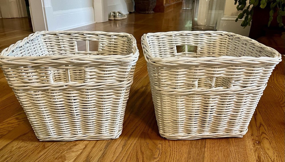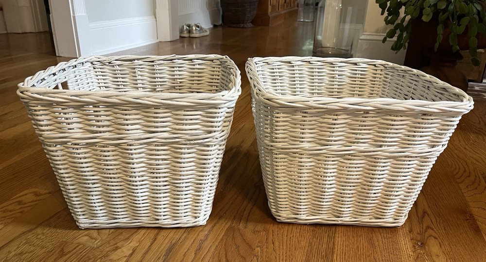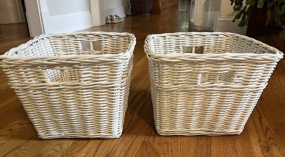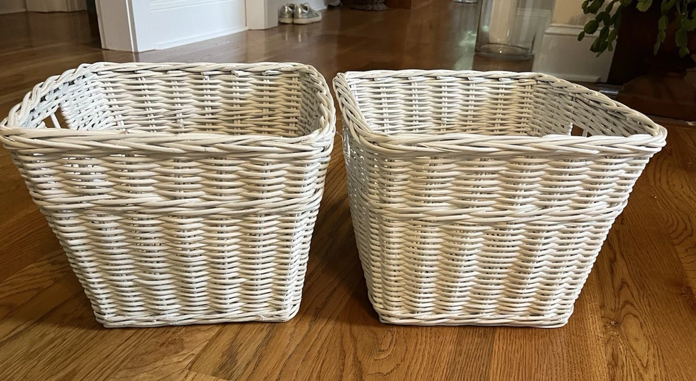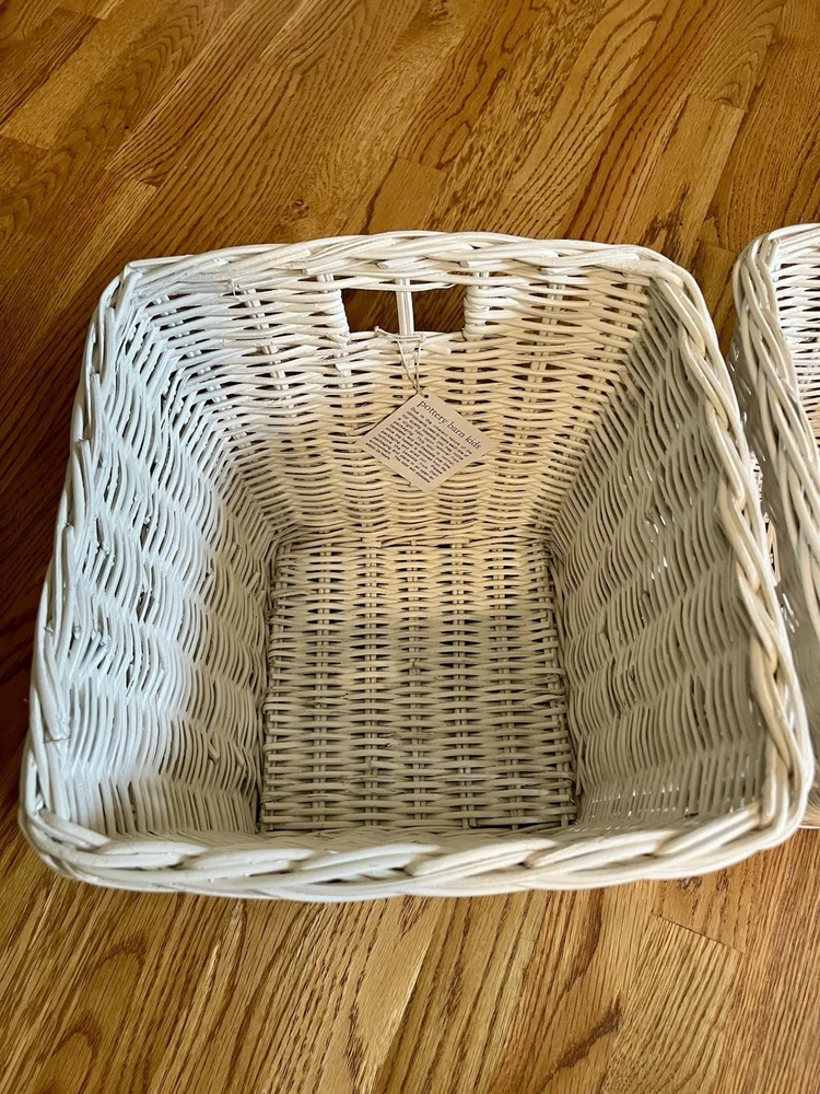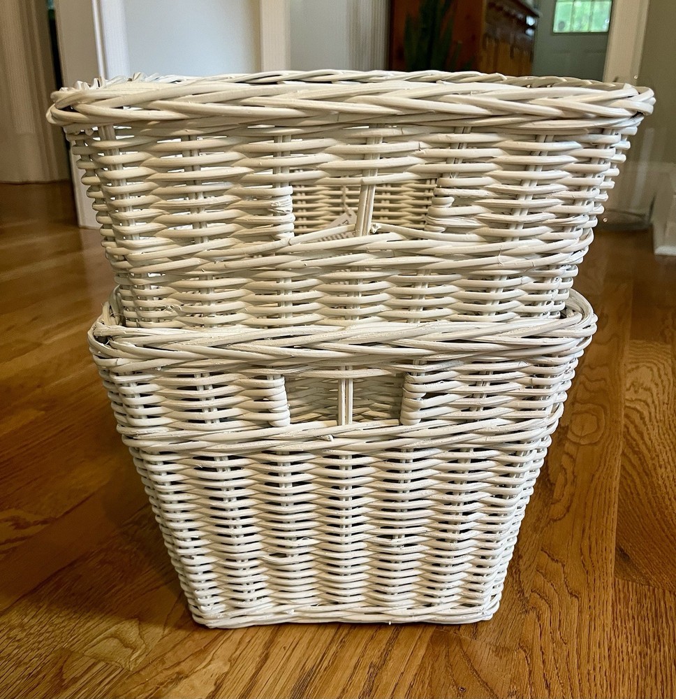 I have a set of 2 preowned white Pottery barn nesting baskets. Discontinued and hard to find. I believe they are a size large or utility size, but please see measurements below… Approximately 12 inches at the top, 9 inches at the bottom, and 9 inches tall. These baskets are made to stack which is handy for storing. They are perfect for storing all the things in baby/kids rooms! They do not come with liners pictured, just the baskets themselves. (I included a couple pics from online, to get more info and ideas.) I may need an add’l day or two to ship, since I will be searching out a good box and packing material, to pack safely. Please see all pictures and ask all questions before bidding. Thanks.
