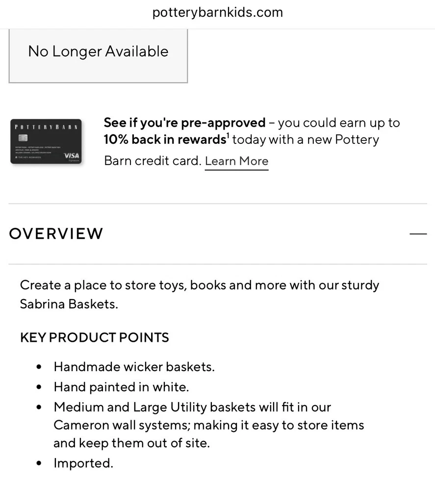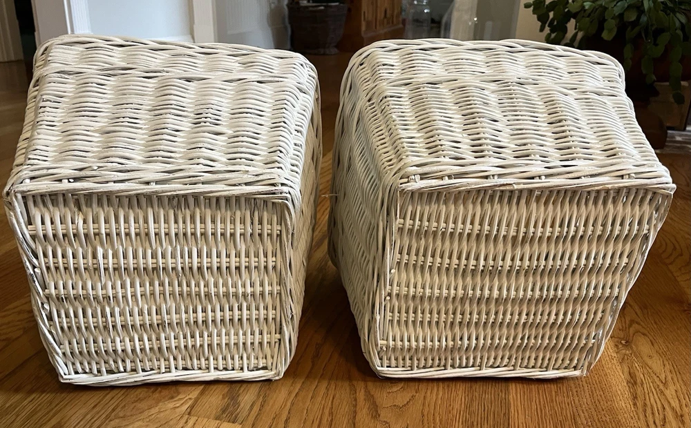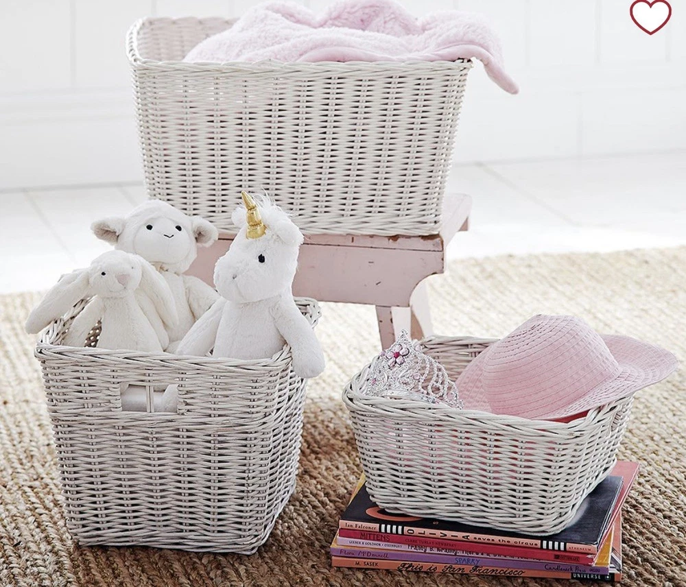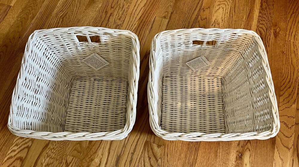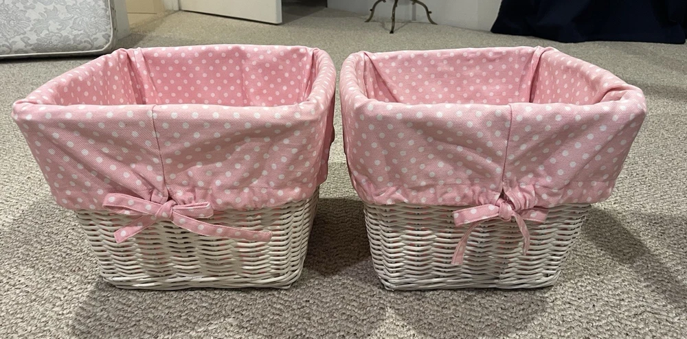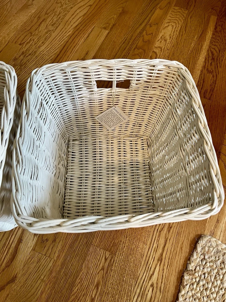 I have a set of 2 preowned white Pottery barn nesting baskets. Discontinued and hard to find. I believe they are a size large or utility size, but please see measurements below… Approximately 12 inches at the top, 9 inches at the bottom, and 9 inches tall. These baskets are made to stack which is handy for storing. They are perfect for storing all the things in baby/kids rooms! They do not come with liners pictured, just the baskets themselves. (I included a couple pics from online, to get more info and ideas.) I may need an add’l day or two to ship, since I will be searching out a good box and packing material, to pack safely. Please see all pictures and ask all questions before bidding. Thanks.