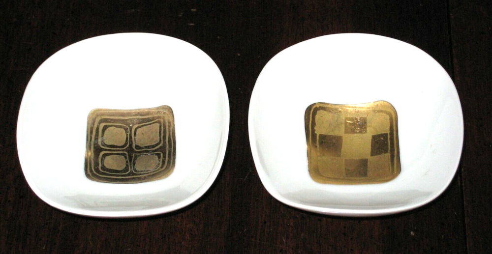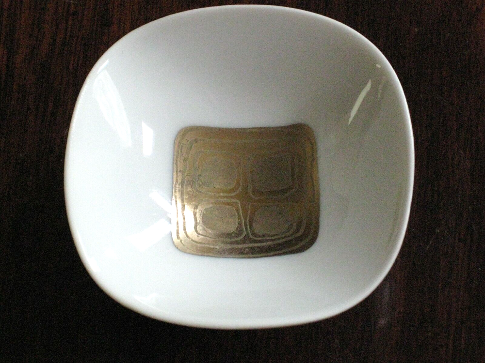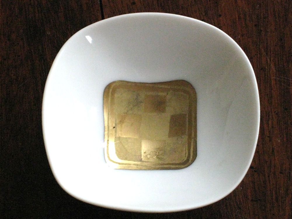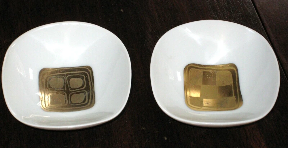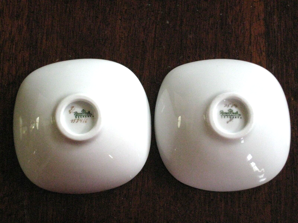 This is a pair of two square, footed Rosenthal - Continental China DIP BOWLS 3" #7584 (Studio Line, Giftware). They are described as Studio Line, Quatre Couleurs, B Wiinblad and numbered 7584. They measure 3" top diameter X 1" tall, are discontinued and circa 1969. They were produced using the finest porcelain, are footed with a wavy, rounded square shape and decorated with gold geometric shapes in the middle. The bowls have no chips or cracks but there is scratching and wear to the gold shapes in the middle. Please examine my pictures carefully as they are the best descriptors. Any questions, please email. Thanks!