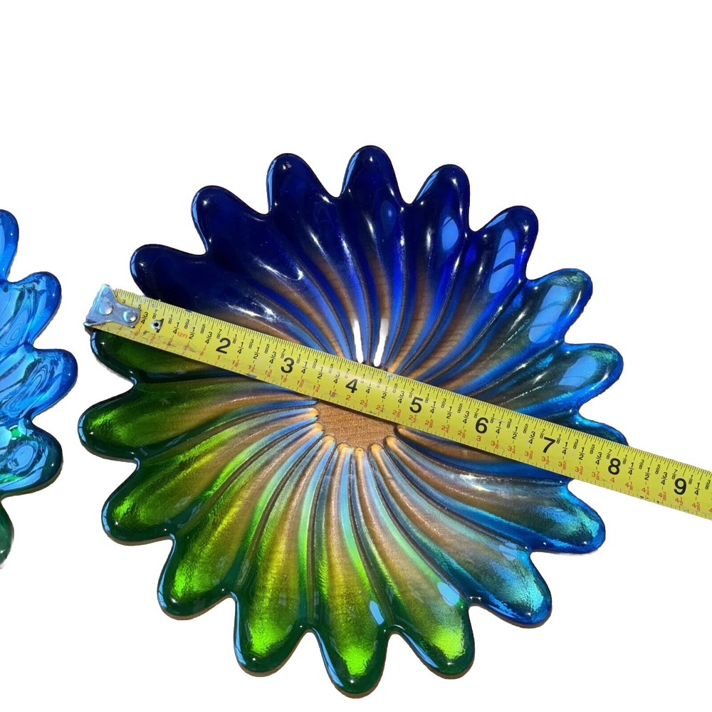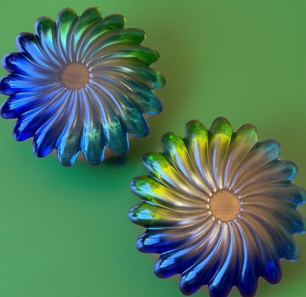 This is a Colorful Decorative Dish which transitions from Blue to Green Ombre in a petal design by Studio Nova of Germany. Solaris is a very neat colorful swirl pattern and was produced around the 1980’s. the top side has a gloss finish the underside has a very discernible frosted / buff finish The late 20th century was Studio Nova's prime. Very heavy. The Dish Measures: 8 ¼ ” diameter 1 ½ ” high Condition: Very good vintage pre-owned condition No cracks, nicks, chips, or repairs No Scratches
