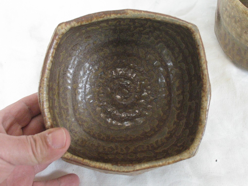 Robert Briscoe squared serving bowl with a wonderful surface textured glaze with an incised design on all four sided. They are in excellent condition and has no issues. One measures 6" x 3 3/4" h The second is 6" x 4" If any question let me know