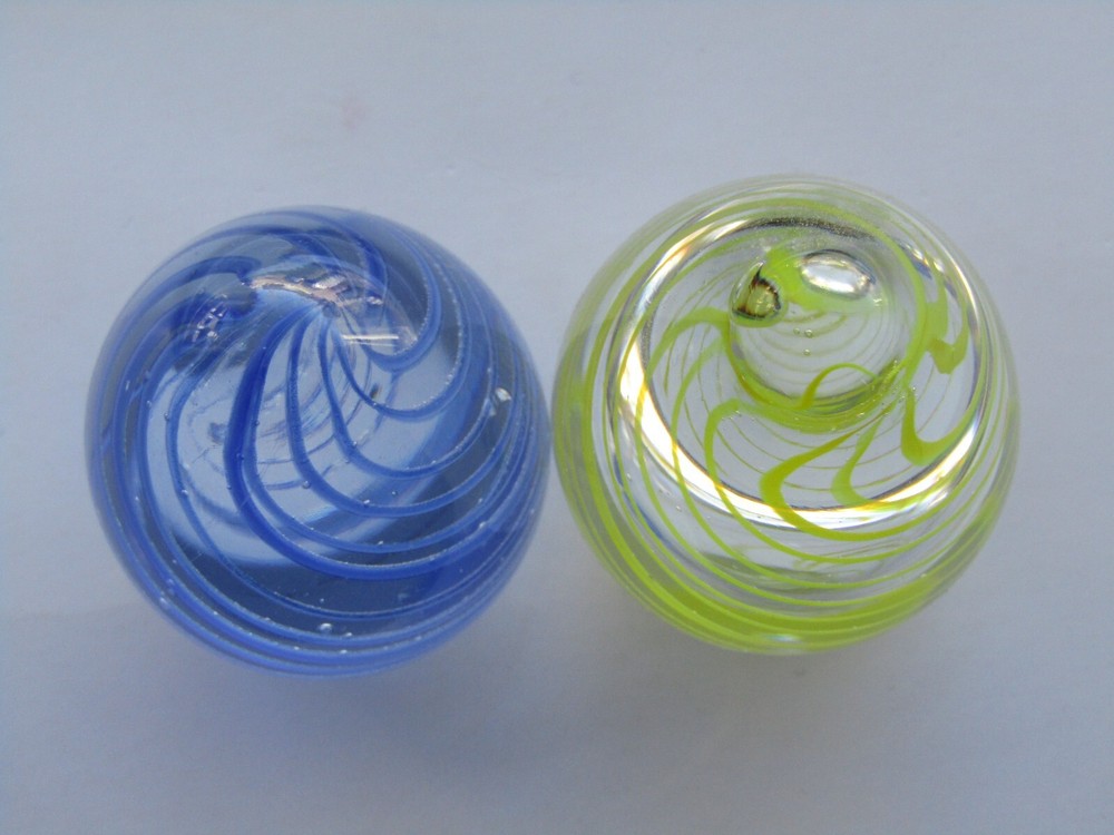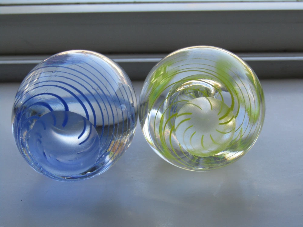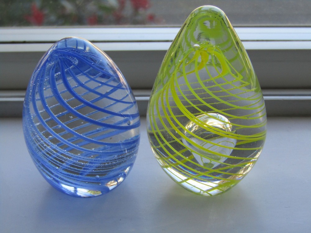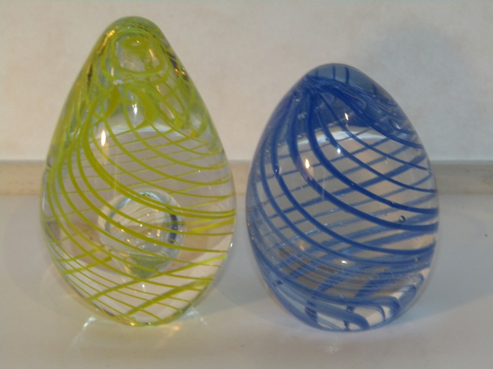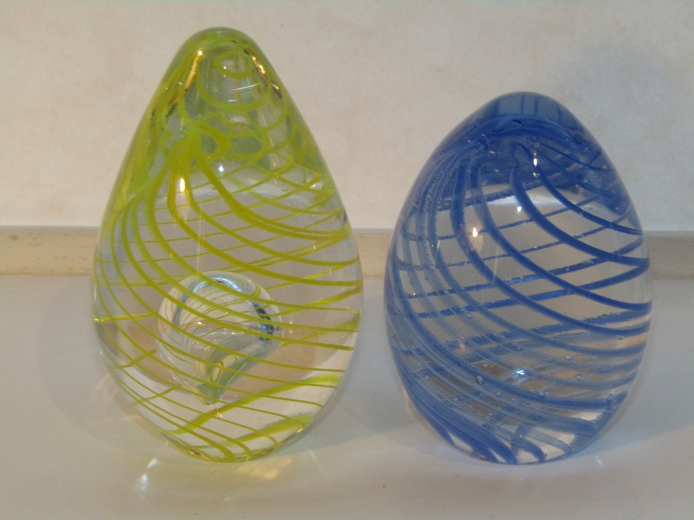 Add a touch of elegance to your collection with these two (2) vintage Murano-style Venetian glass paperweights. The stunning swirl pattern (one in blue and one in yellow) is complemented by spirals, making it a perfect addition to any desk or display. This hand-blown glass egg paperweight is a one-of-a-kind original, featuring the classic production style of hand blown art glass. The intricate design of these paperweights will impress any collector, and its vintage status makes it a rare find. Whether you're adding to your collection or looking for a statement piece, they are sure to impress. The yellow swirl egg stands approximately 3 1/8" tall X 1 7/8" in diameter at the widest part & weighs 7.8 oz. The blue swirl egg stands approximately 2 3/4" tall X 1 7/8" in diameter at it's widest section & weighs 7.4 oz.