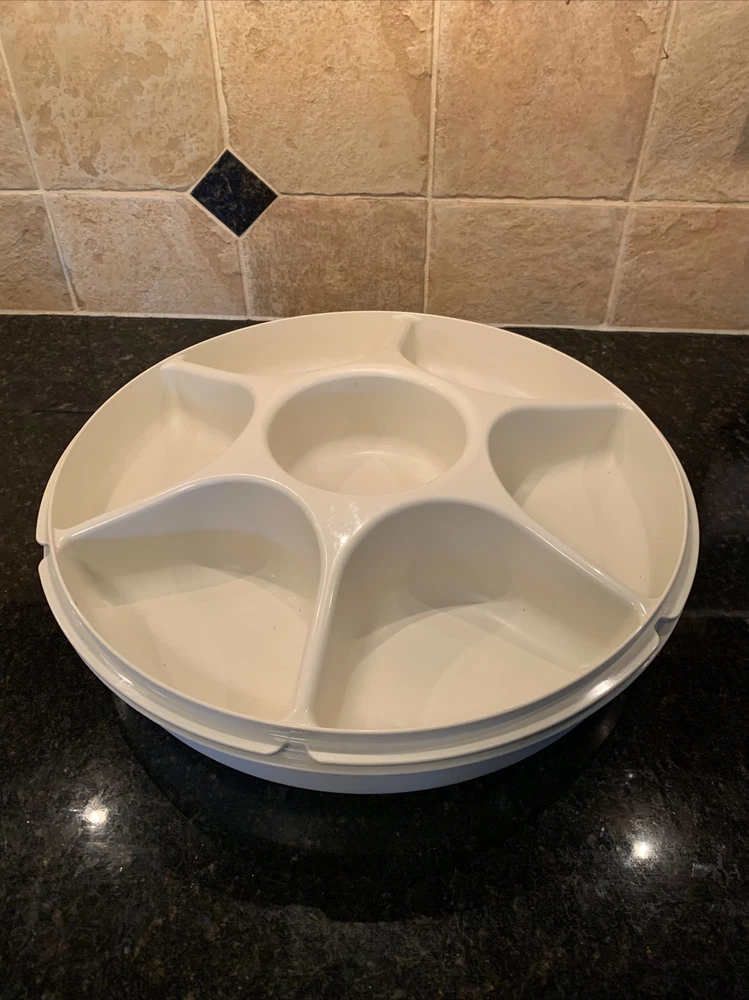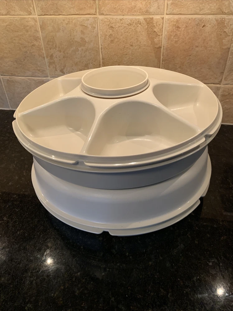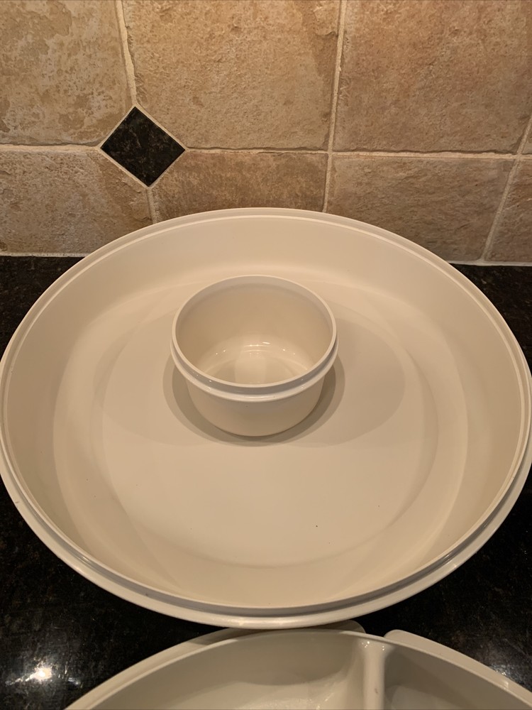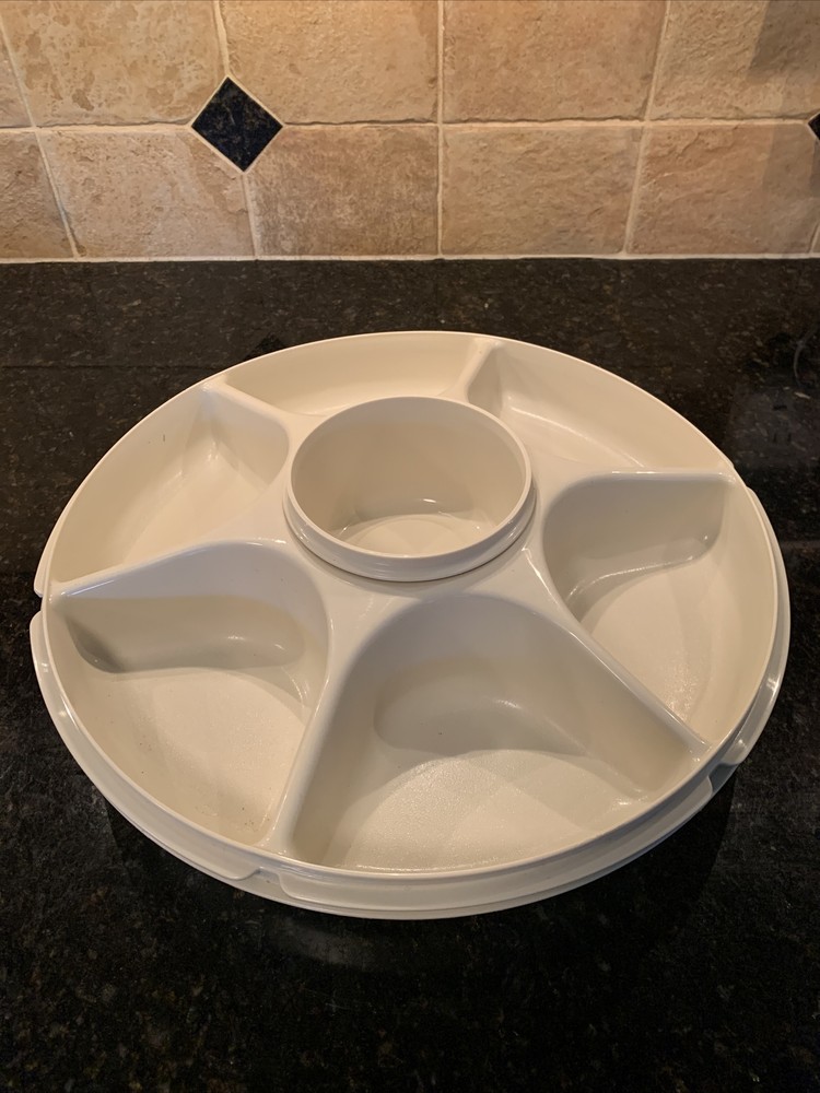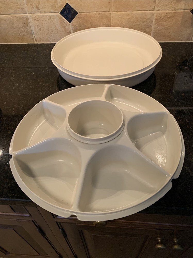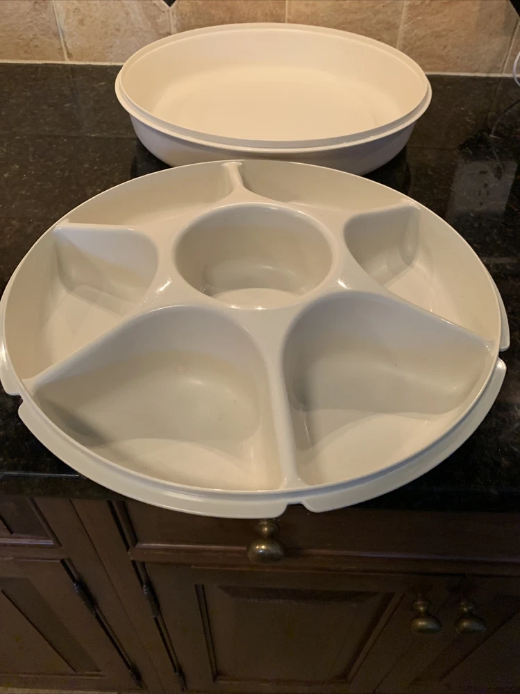2x Vintage Almond Tupperware Vegetable Dip Snack Serving Tray with Lid 1665-2. Please notice that one of the trays it’s missing the pull out container in the center.