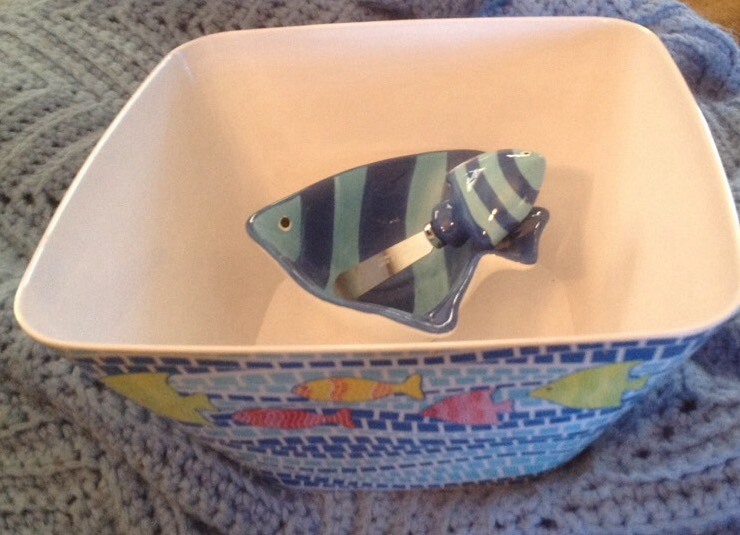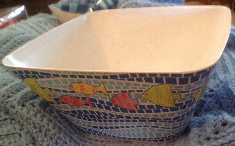 Here is a three piece set of a large snack bowl with a cute smaller bowl and spreader for your next luau or tropical themed party. The small bowl and spreader are ceramic, about 3 inches tall and 6" across at the widest part. The spreader is 5" long, ceramic with a stainless steel blade. The large snack bowl is plastic or melamine. It's 9.5" across and 5" tall. It is not microwaveable and needs to be hand washed. You are buying one large bowl and one small bowl with spreader, as shown. Check my store for other tropical themed items, I have several items such as salt and pepper shakers, snack bowls, placemats and even hula skirts. If you want more than one item, I will make you a great deal of combined shipping and even a price break if you ask.
