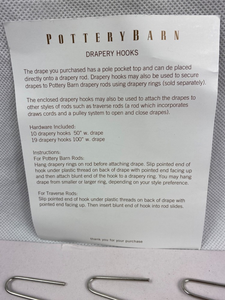 Set of 20, Pottery Barn drapery / curtain hooks. Pottery Barn does not sell these separately! The silver metal slide hooks have a hard to find mounting design, making them easy to install on PB drapes. Satisfaction is guaranteed. Order with confidence! Ships same day, or sometimes the next day depending upon time of day of order. I strive to mail out quickly! If you order more than one set, I will ship extra sets for free.