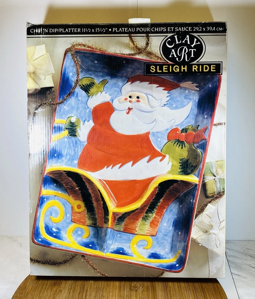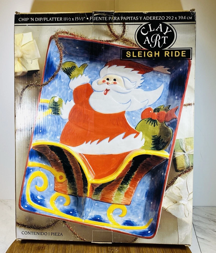 2001 Vintage Colorful Christmas Clay Art "Sleigh Ride" Chip 'N Dip Platter. Condition is New. Shipped with USPS Ground Advantage.