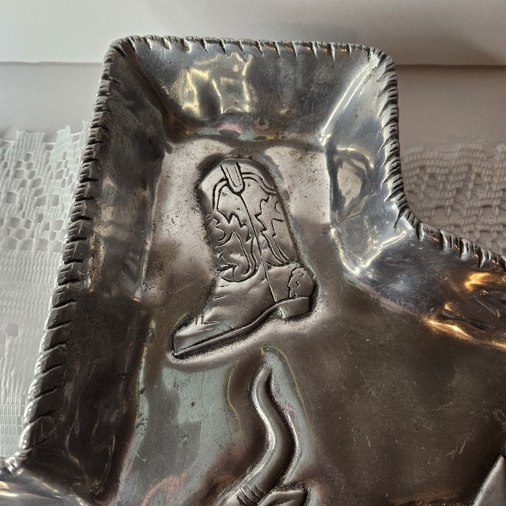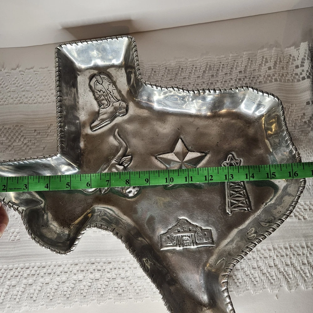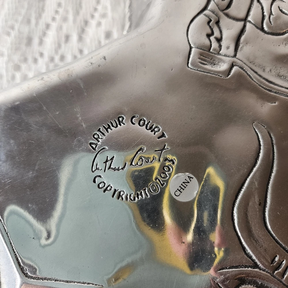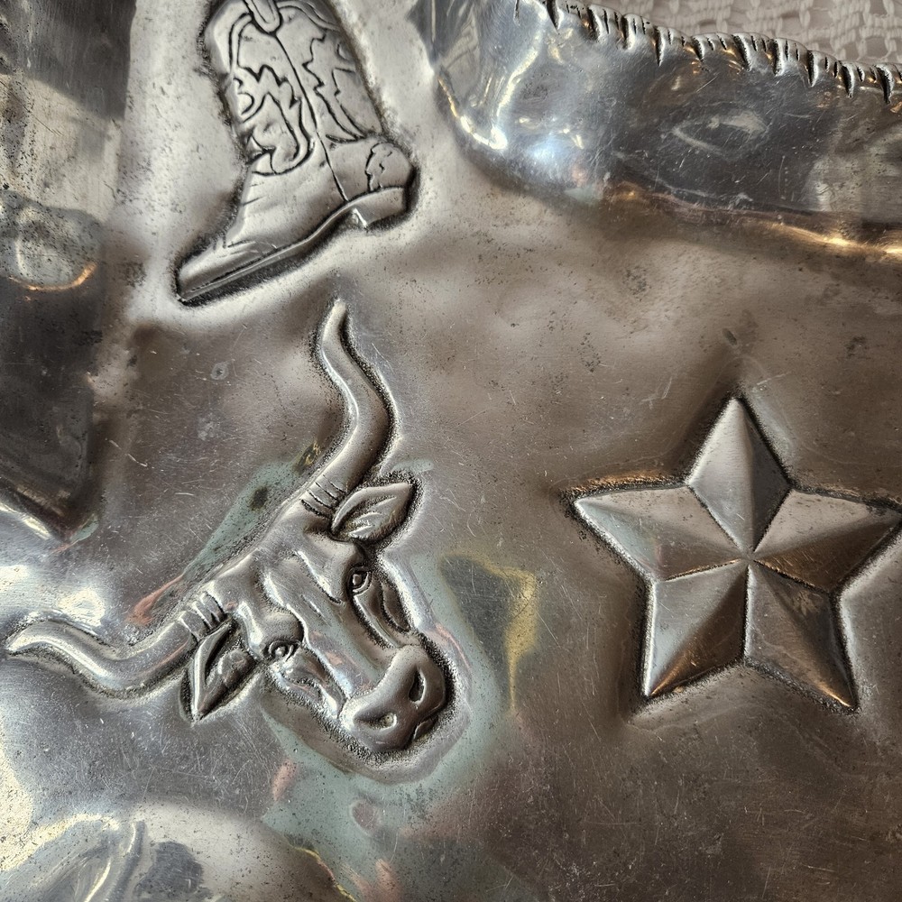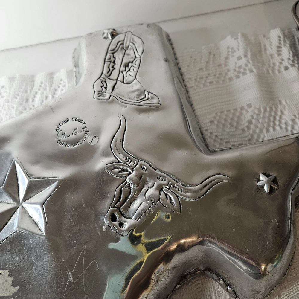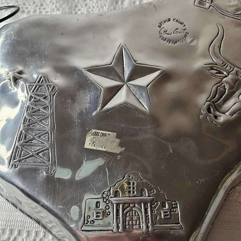 Add a touch of Texan charm to your next party with this 2003 Arthur Court chip and dip tray. The large, silver aluminum tray features a novelty shape of the state of Texas and is perfect for serving up your favorite snacks. The glossy finish and intricate design make this an original and stylish addition to any collection. Crafted in the United States in 2003, this vintage tray is a licensed reproduction of an original Arthur Court design. With one spacious compartment and a width of 16 inches, it is ideal for storing and serving a variety of treats. Don't miss out on your chance to own this unique and functional piece of Texas-inspired serving ware.