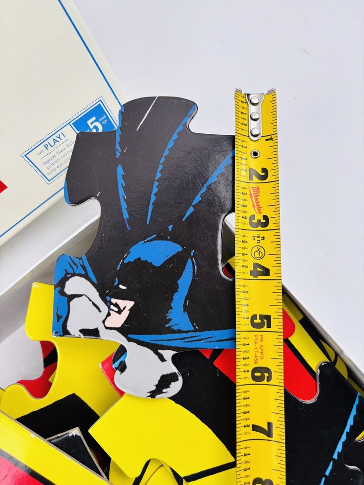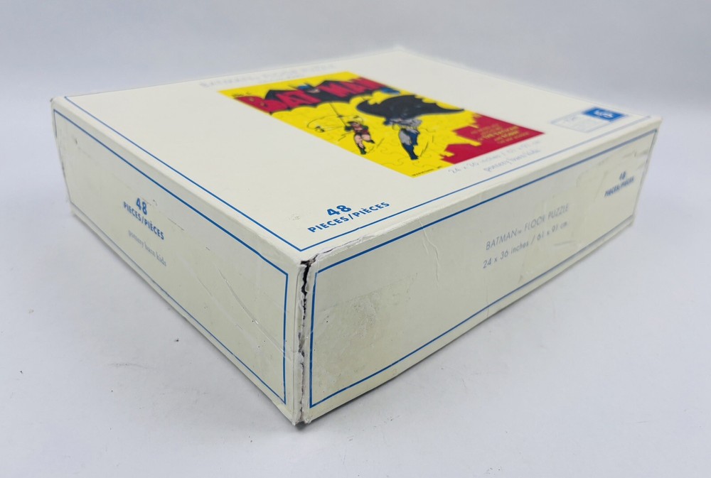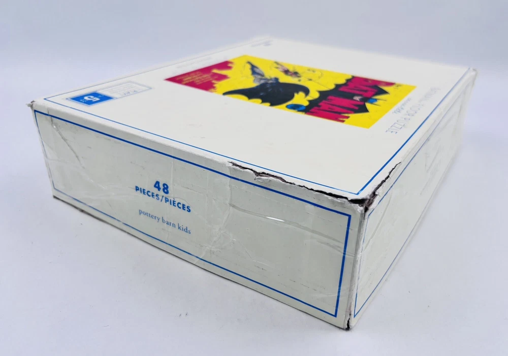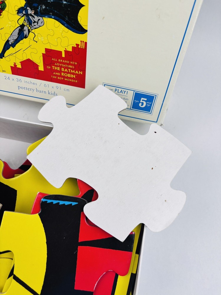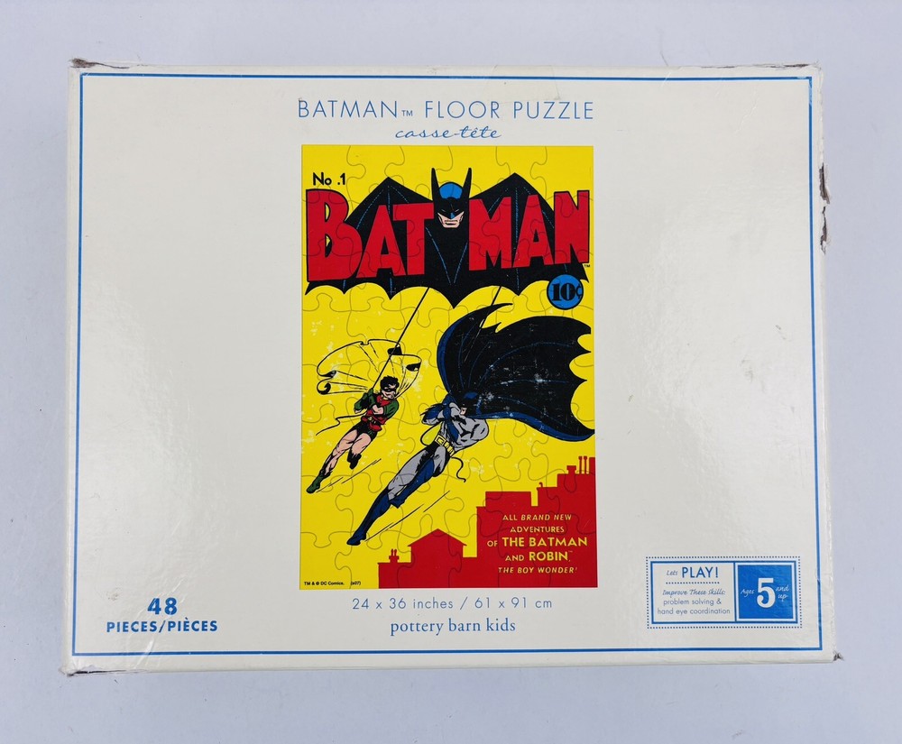 This is a 2010 Pottery Barn Kids Batman Floor Puzzle featuring a colorful Comics & Mangas theme. It contains 48 extra large interlocking pieces made of cardboard. The puzzle measures 24"x36" when completed and is suitable for children aged 8-11. It comes from a smoke-free household and is complete. The box has moderate shelf wear, and has been taped together.