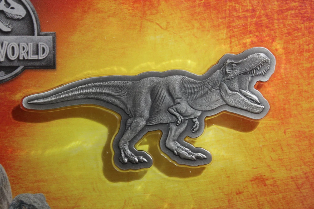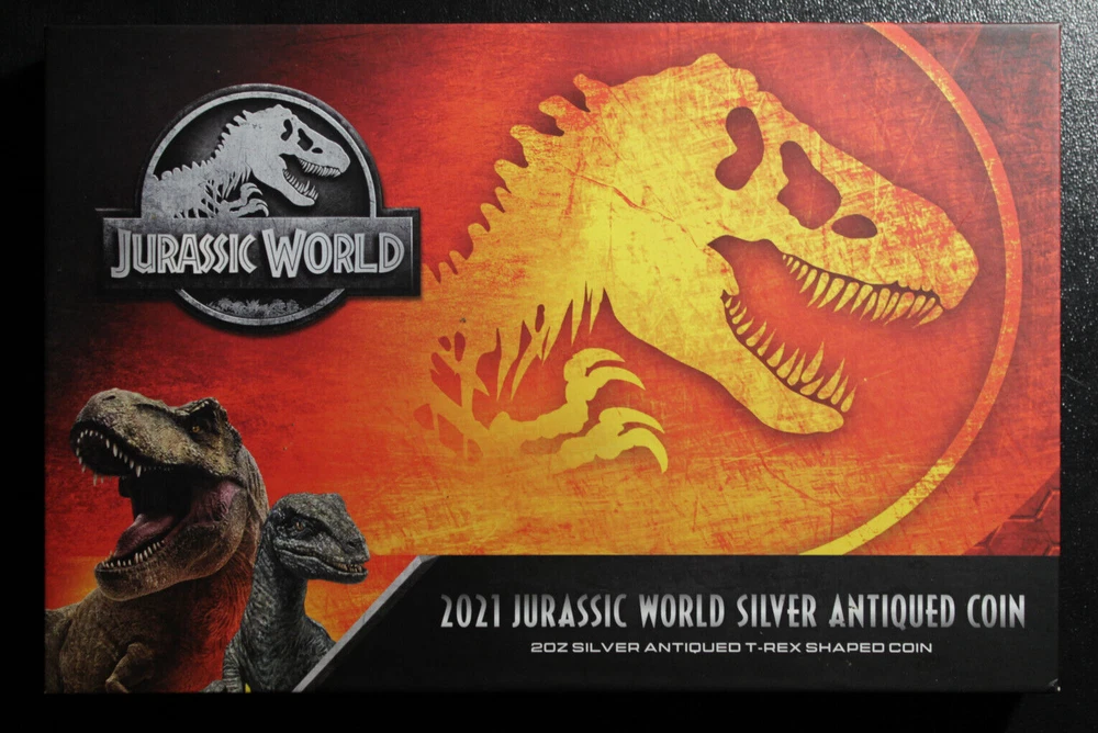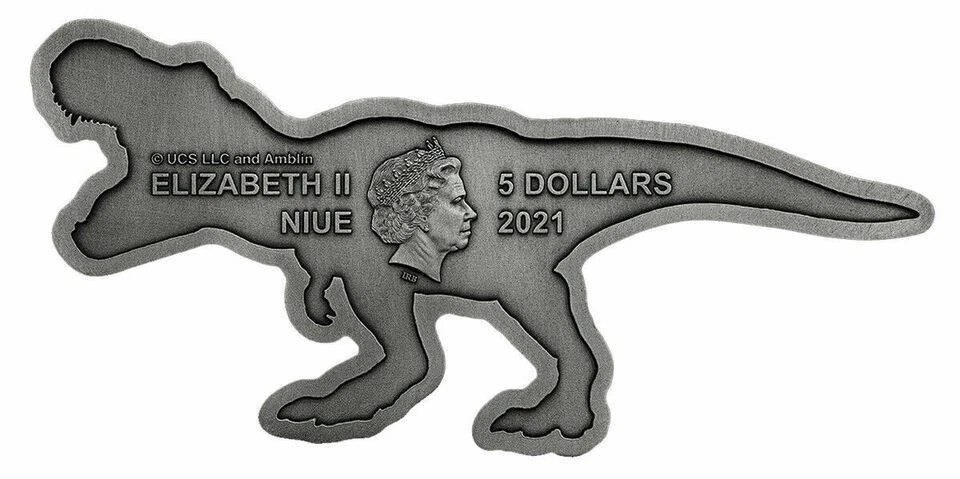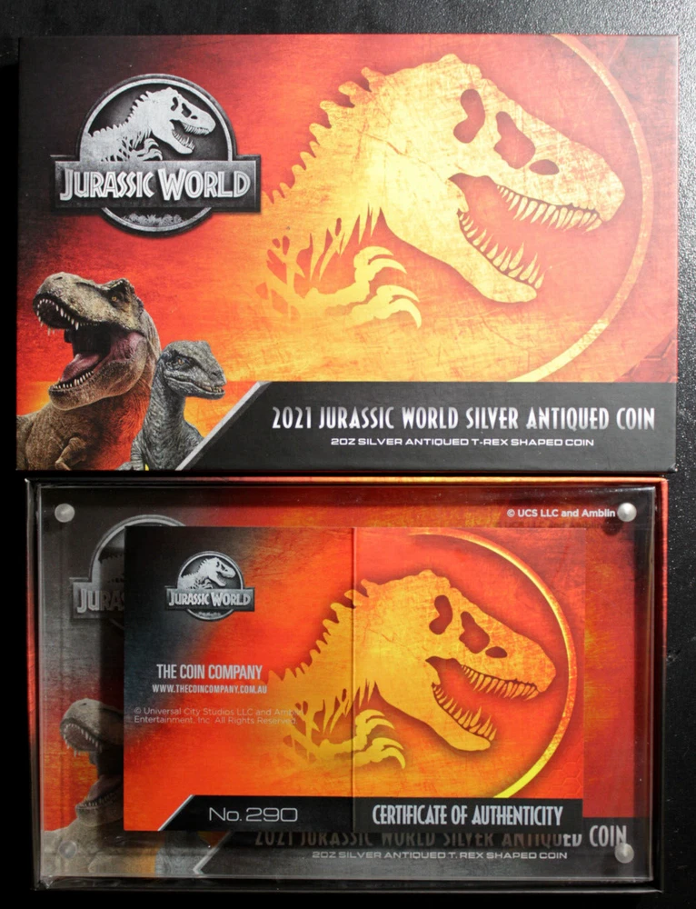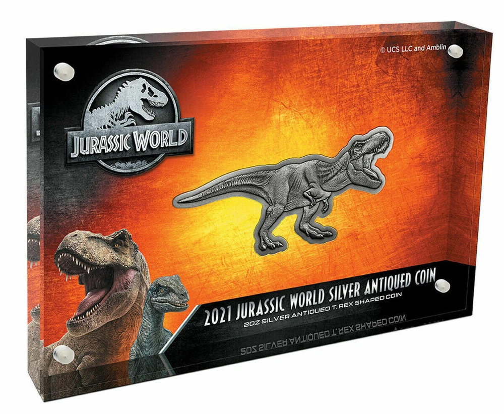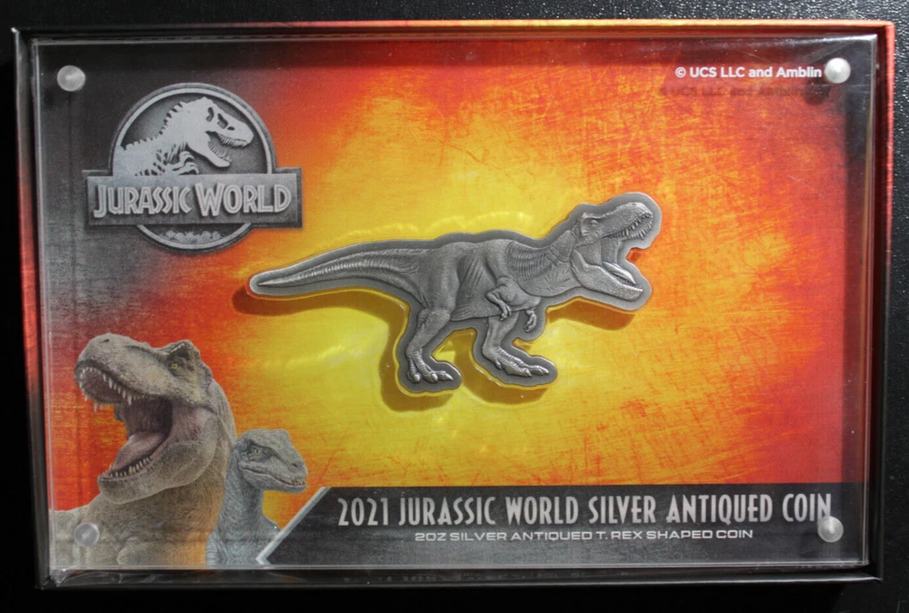 PLEASE NOTE: THIS IS #290 OF ONLY 600 MINTED, WE ALSO HAVE FOR SALE #290 OF THE 2021 JURASSIC WORLD 2 OZ SILVER HIGH RELIEF CRACKED ANTIQUED COIN IF YOU WANT A MATCHING SERIAL NUMBER PAIR!!! 2021 Niue Jurassic World T-Rex Shaped 2oz Silver Antiqued This brand new officially licensed 2021 Niue Jurassic World T-Rex Shaped 2oz Silver antiqued coins joins a wide array of uniquely-shaped, highly collectible bullion coins currently on the market. The popularity of shaped coins has been on the rise for some time now. That popularity is based in part on how their shapes allow for an expansion of the selected themes taking on something of a new life. And that is certainly true when considering the subject of dinosaurs, such as this new Jurassic World ™ T-Rex Shaped coin. Highlights 2021 Niue Jurassic World T-Rex Shaped 2oz Silver Antiqued. Officially licensed Jurassic World ™ collectible bullion coin. Limited total mintage of no more than 600 for global distribution. Contains: 2 troy oz of .999 fine silver. Coins are struck in the unique shape of a T-Rex. Obverse: Displays the Ian Rank-Broadley portrait of Her Majesty Queen Elizabeth II. Inscriptions include the copyright info and "ELIZABETH II . NIUE . 5 DOLLARS . 2021. Reverse: Features the shaped-coin revealing a full-body profile of T-Rex in a full roar, exposing his powerful jaws and razor-sharp teeth. Face Value: 5 Dollars (NZD). Careful, He Bites! We'll, at least he looks like he would bite...This incredibly produced 2021 Niue Jurassic World T-Rex Shaped 2oz Silver Antiqued Coin is just what you are looking for to expand your T-Rex collection. Officially licensed by © Universal Studios (UCS LLC) and Amblin, this highly-detailed T-Rex shaped coin is part of the powerful Jurassic World ™ franchise. This shaped-coin is issued as a legal tender offering by the South Pacific island country of Niue. The obverse displays the Ian Rank-Broadley distinctive portrait of Her Majesty Queen Elizabeth II. Inscriptions include the copyright info and "ELIZABETH II . NIUE . 5 DOLLARS . 2021. The reverse features in the fiercest of detail the shaped-coin revealing a full-body profile of T-Rex in a full roar! His powerful jaws and razor-sharp teeth are certainly to be avoided at all costs. By the use of various engraved texturing and careful, hand-application of the antiquing, every nuance of the his massive muscular body is highlighted. You will be quite pleased with this unusual offering. Low Mintage - Unique Collectible This Highly-Collectible 2021 Niue Jurassic World T-Rex Shaped 2oz Silver Antiqued coin has a limited mintage of only 600 coins. Each coin arrives in a very colorful illustrated acrylic presentation block. Also included is a Certificate of Authenticity.