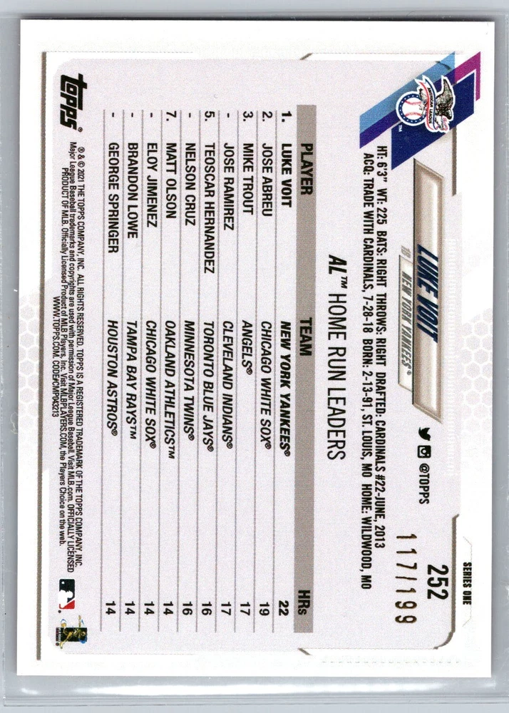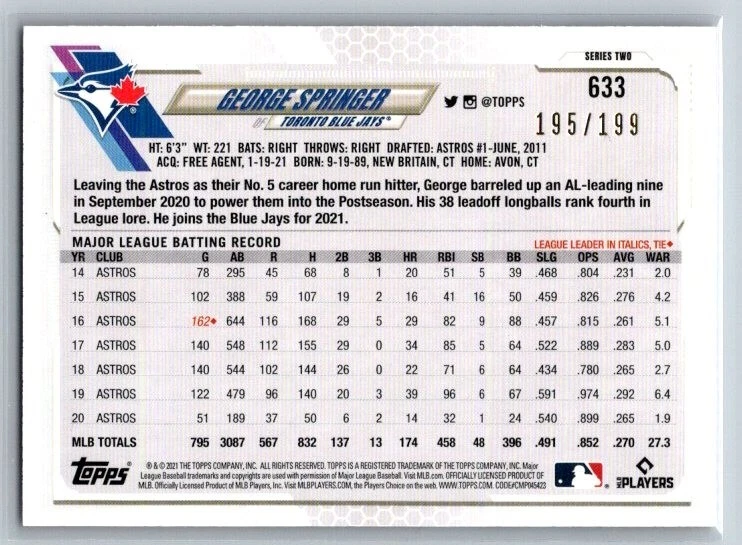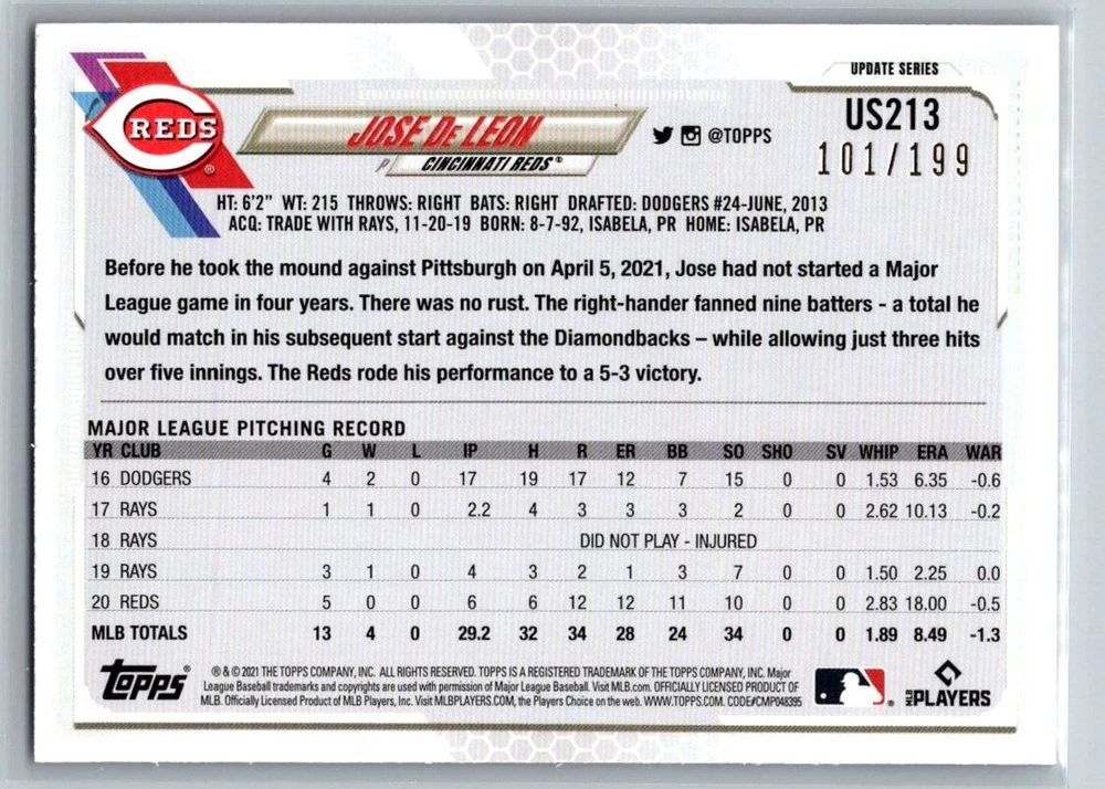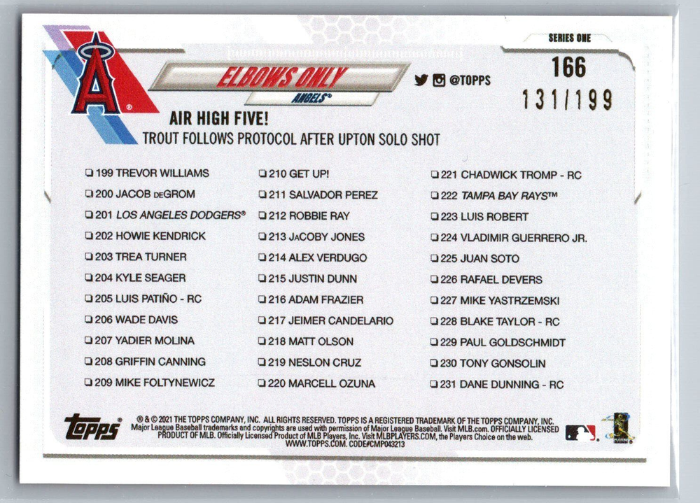 2021 Topps Series 1/2 Red Foil Parallel Cards /199 **Any lines that appear on the images are just a product of the scanner used to upload images, they are not on the actual card. Some card back images my appear to be black and white only, this is just from the scanner used to upload images. All cards are in Excellent Condition or better.** Combined shipping available Ships eBay Standard Shipping unless your combined order is too large, I will then use USPS and send you an invoice AS IS. NO RETURNS.