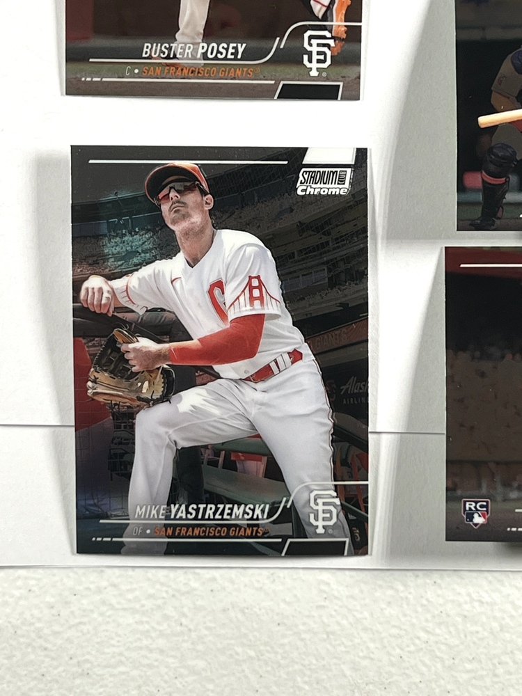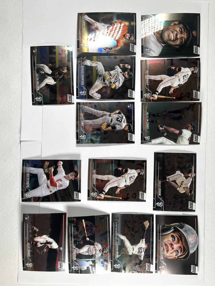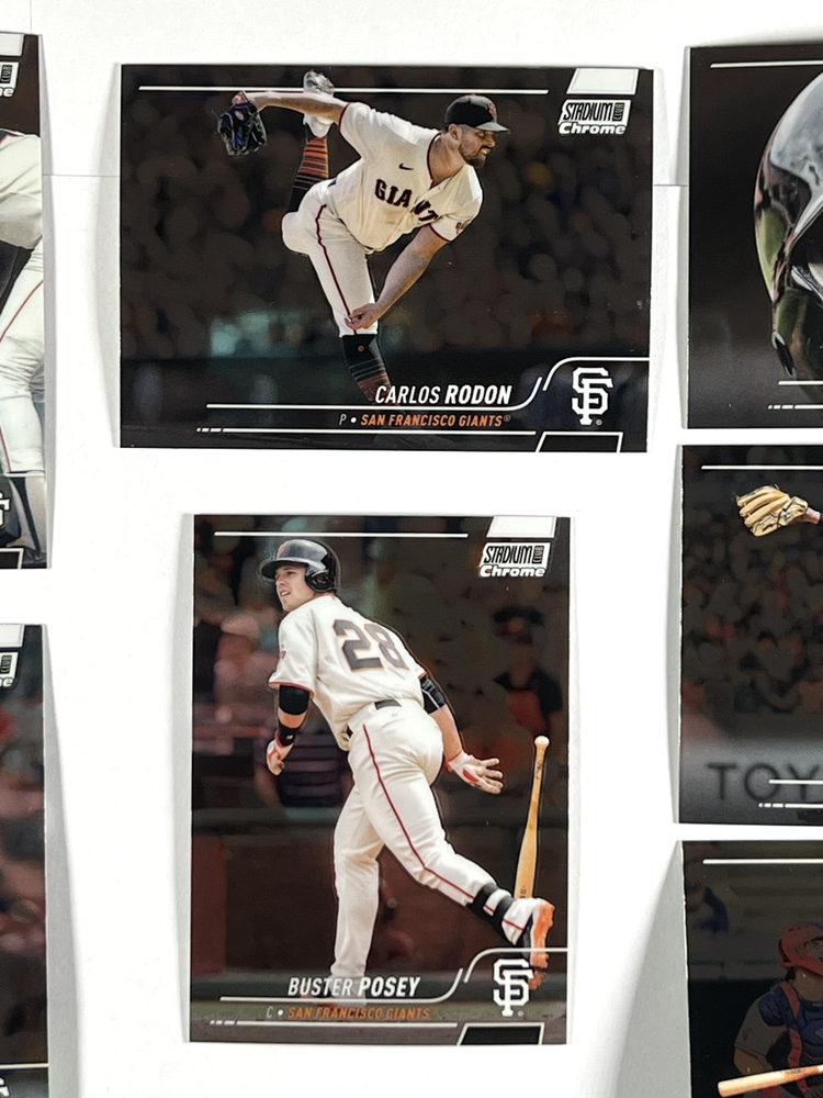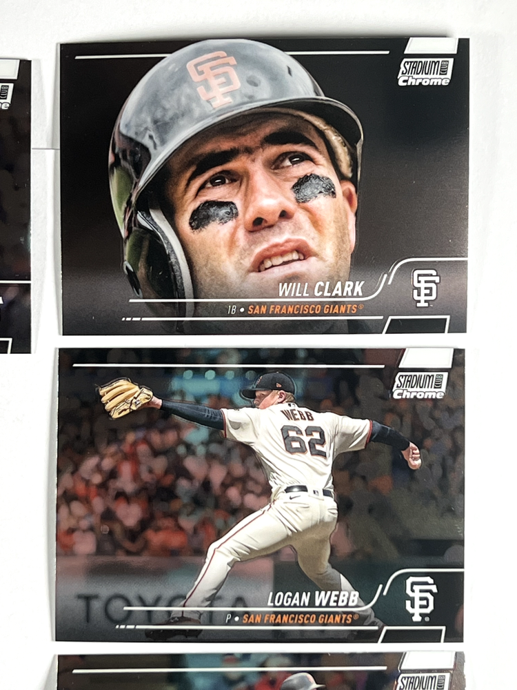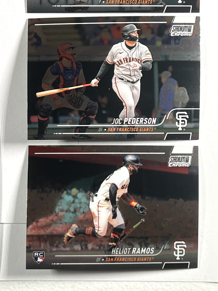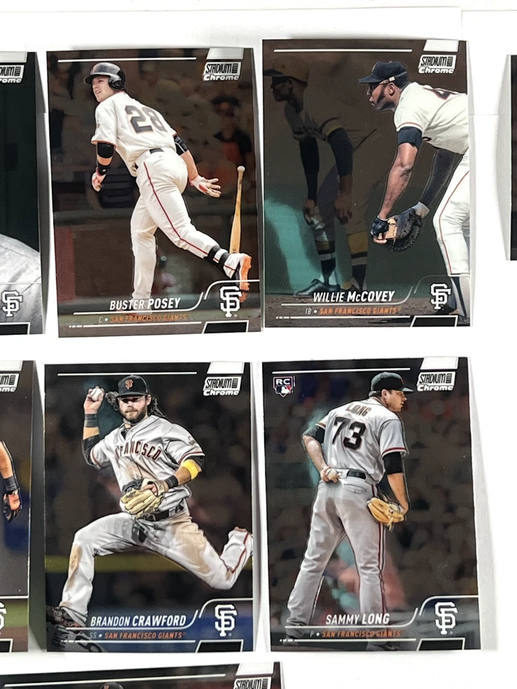2022 Topps Stadium Club Chrome San Francisco Giants Base 13 Card Team Set You will receive one of each of the following: Buster Posey Carlos Rodon Sammy Long Colton Welker Heliot Ramos Crawford Lamonte Wade Logan Webb Joc Pederson Mike Yazstremski Will Clark Willie McCovey Willie Mays