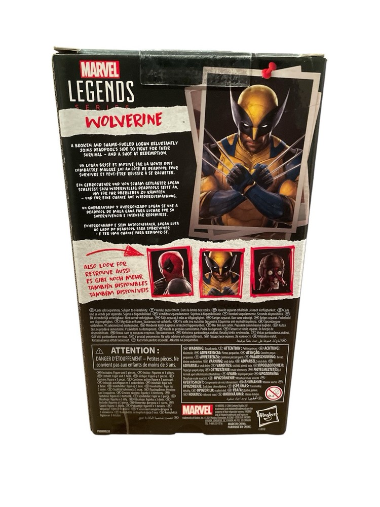 The 2024 Marvel Legends Deadpool & Wolverine action figure features Wolverine in a 1:12 scale, standing 6 inches tall. This transforming figure is inspired by the X-MEN TV show and the X-Men franchise. It is made of plastic and manufactured by Marvel in China. The item is part of the DEADPOOL AND WOLVERINE series and is a part of the Marvel Legends line. The figure is sealed and showcases Hugh Jackman's portrayal of Wolverine.