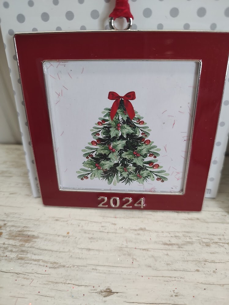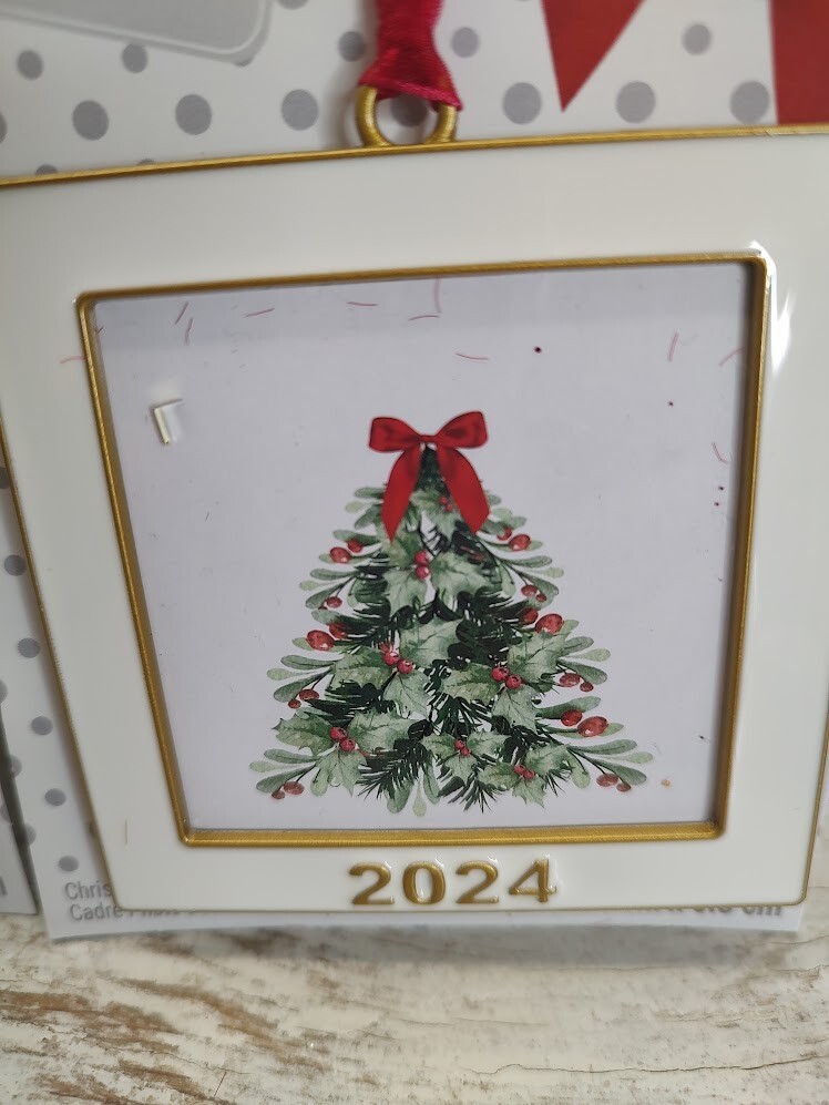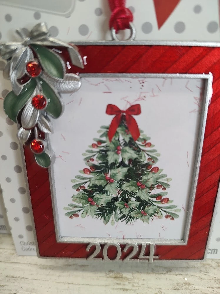 2024 ornament frame is perfect to display your favorite picture. You can hang it on your tree or mantelpiece to complement your Christmas décor. 2.5” x 2.5” (6.3cm x 6.3cm) image size. 3.11” x 3.39” x 0.31” (7.9cm x 8.6cm x 0.8cm) overall size. Red polyester ribbon for hanging. Metal, paperboard and plastic.