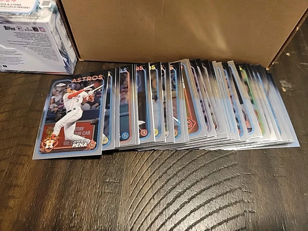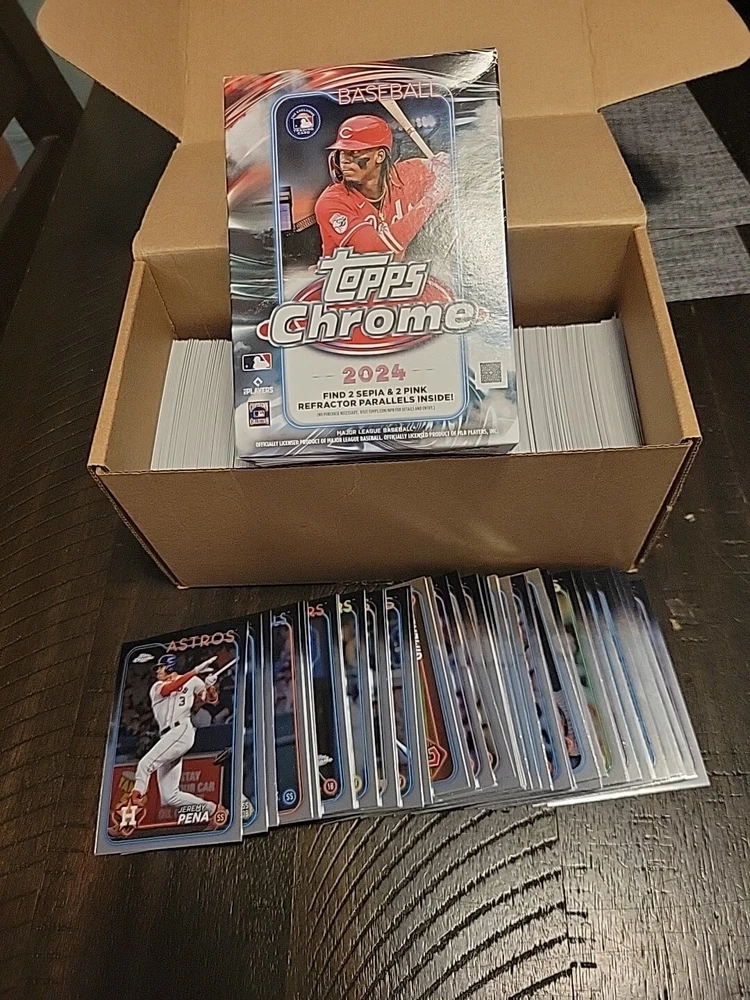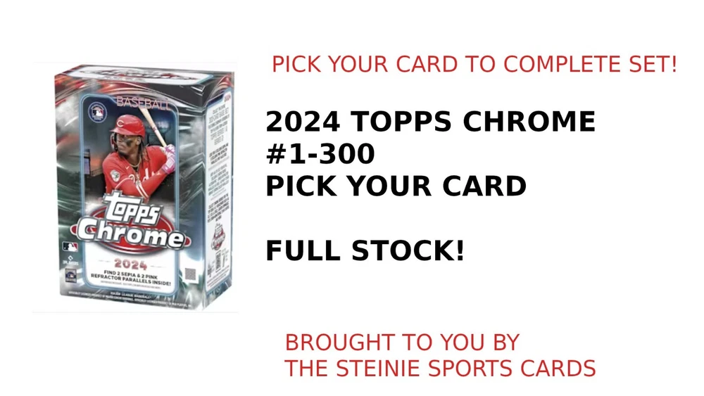 UPDATED 9/16 WITH NEW STOCK! 2024 Topps Chrome Baseball Base Cards #1-300 You Pick to Complete Your Set! 1 Shohei Ohtani, Los Angeles Dodgers 2 Colt Keith, Detroit Tigers RC 3 Corbin Burnes, Baltimore Orioles 4 Freddie Freeman, Los Angeles Dodgers 5 Lawrence Butler, Oakland Athletics RC 6 Eury Pérez, Miami Marlins 7 MJ Melendez, Kansas City Royals 8 Tristan Gray, Tampa Bay Rays RC 9 Ozzie Albies, Atlanta Braves 10 Byron Buxton, Minnesota Twins 11 Alex Verdugo, New York Yankees 12 Manny Machado, San Diego Padres 13 Seiya Suzuki, Chicago Cubs 14 J.P. Crawford, Seattle Mariners 15 Gavin Williams, Cleveland Guardians RC 16 Pete Crow-Armstrong, Chicago Cubs RC 17 Brett Baty, New York Mets 18 Yoshinobu Yamamoto, Los Angeles Dodgers RC 19 AJ Smith-Shawver, Atlanta Braves RC 20 Connor Phillips, Cincinnati Reds RC 21 Gabriel Moreno, Arizona Diamondbacks 22 Wade Meckler, San Francisco Giants RC 23 Matt Olson, Atlanta Braves 24 William Contreras, Milwaukee Brewers 25 Zack Wheeler, Philadelphia Phillies 26 Spencer Horwitz, Toronto Blue Jays RC 27 Bo Bichette, Toronto Blue Jays 28 Ronny Mauricio, New York Mets RC 29 José Tena, Cleveland Guardians RC 30 Steven Kwan, Cleveland Guardians 31 Kodai Senga, New York Mets 32 Xander Bogaerts, San Diego Padres 33 Andrew Benintendi, Chicago White Sox 34 Alika Williams, Pittsburgh Pirates RC 35 Ketel Marte, Arizona Diamondbacks 36 Gunnar Henderson, Baltimore Orioles 37 Max Scherzer, Texas Rangers 38 Triston Casas, Boston Red Sox 39 Sal Frelick, Milwaukee Brewers (RC) 40 Reese Olson, Detroit Tigers RC 41 Osleivis Basabe, Tampa Bay Rays RC 42 Jackson Rutledge, Washington Nationals RC 43 Paul Blackburn, Oakland Athletics 44 Elly De La Cruz, Cincinnati Reds RC 45 Grant Hartwig, New York Mets RC 46 Dane Myers, Miami Marlins RC 47 Chris Murphy, Boston Red Sox RC 48 Matt McLain, Cincinnati Reds 49 David Hamilton, Boston Red Sox RC 50 Aaron Judge, New York Yankees 51 Mickey Moniak, Los Angeles Angels 52 Michael Harris II, Atlanta Braves 53 Alex Bregman, Houston Astros 54 Tyler Glasnow, Los Angeles Dodgers 55 Quinn Priester, Pittsburgh Pirates RC 56 Jack Flaherty, Detroit Tigers 57 Teoscar Hernández, Los Angeles Dodgers 58 Jose Altuve, Houston Astros 59 Lourdes Gurriel Jr., Arizona Diamondbacks 60 David Bednar, Pittsburgh Pirates 61 Anthony Rendon, Los Angeles Angels 62 Bryce Harper, Philadelphia Phillies 63 Masataka Yoshida, Boston Red Sox 64 Keibert Ruiz, Washington Nationals 65 Christian Encarnacion-Strand, Cincinnati Reds RC 66 Lane Thomas, Washington Nationals 67 Jordan Wicks, Chicago Cubs RC 68 James Outman, Los Angeles Dodgers 69 Kyle Bradish, Baltimore Orioles 70 Jazz Chisholm Jr., Miami Marlins 71 Kyle Schwarber, Philadelphia Phillies 72 Nick Gonzales, Pittsburgh Pirates RC 73 Spencer Torkelson, Detroit Tigers 74 Jonathan Ornelas, Texas Rangers RC 75 Bryce Jarvis, Arizona Diamondbacks RC 76 Isaiah Campbell, Boston Red Sox RC 77 Slade Cecconi, Arizona Diamondbacks RC 78 Vladimir Guerrero Jr., Toronto Blue Jays 79 Jared Triolo, Pittsburgh Pirates RC 80 Adley Rutschman, Baltimore Orioles 81 Matt Chapman, San Francisco Giants 82 Cedric Mullins, Baltimore Orioles 83 Taj Bradley, Tampa Bay Rays 84 Austin Riley, Atlanta Braves 85 Drew Millas, Washington Nationals RC 86 Luis Robert Jr., Chicago White Sox 87 Mike Yastrzemski, San Francisco Giants 88 Jackson Holliday, Baltimore Orioles RC 89 Jasson Domínguez, New York Yankees (RC) 90 Paul Goldschmidt, St. Louis Cardinals 91 Joe Boyle, Oakland Athletics RC 92 Jacob Amaya, Miami Marlins RC 93 Rafael Devers, Boston Red Sox 94 MacKenzie Gore, Washington Nationals 95 Irving Lopez, St. Louis Cardinals RC 96 Jared Jones, Pittsburgh Pirates RC 97 Nolan Gorman, St. Louis Cardinals 98 Oneil Cruz, Pittsburgh Pirates 99 Hunter Goodman, Colorado Rockies RC 100 Corey Seager, Texas Rangers 101 Riley Greene, Detroit Tigers 102 Marcus Semien, Texas Rangers 103 Devin Williams, Milwaukee Brewers 104 Spencer Steer, Cincinnati Reds 105 Ezequiel Tovar, Colorado Rockies 106 Robbie Ray, San Francisco Giants 107 Yandy Díaz, Tampa Bay Rays 108 Jake Burger, Miami Marlins 109 Javier Báez, Detroit Tigers 110 Clayton Kershaw, Los Angeles Dodgers 111 Jack Leiter, Texas Rangers RC 112 Kyle Tucker, Houston Astros 113 Brayan Rocchio, Cleveland Guardians 114 Adolis García, Texas Rangers 115 José Rodríguez, Chicago White Sox RC 116 Yuki Matsui, San Diego Padres RC 117 Salvador Perez, Kansas City Royals 118 Ceddanne Rafaela, Boston Red Sox RC 119 Cal Raleigh, Seattle Mariners 120 Bobby Witt Jr., Kansas City Royals 121 Shota Imanaga, Chicago Cubs RC 122 Wyatt Langford, Texas Rangers RC 123 Zach Neto, Los Angeles Angels 124 Andrew McCutchen, Pittsburgh Pirates 125 Eloy Jiménez, Chicago White Sox 126 Willy Adames, Milwaukee Brewers 127 Anthony Rizzo, New York Yankees 128 Ryan Pepiot, Tampa Bay Rays 129 Luis Castillo, Seattle Mariners 130 Yennier Cano, Baltimore Orioles 131 Tyler Fitzgerald, San Francisco Giants RC 132 Luken Baker, St. Louis Cardinals RC 133 Dominic Canzone, Seattle Mariners RC 134 George Springer, Toronto Blue Jays 135 Shane McClanahan, Tampa Bay Rays 136 Evan Carter, Texas Rangers RC 137 Francisco Lindor, New York Mets 138 Sandy Alcantara, Miami Marlins 139 Brenton Doyle, Colorado Rockies 140 Daulton Varsho, Toronto Blue Jays 141 Nico Hoerner, Chicago Cubs 142 Heston Kjerstad, Baltimore Orioles RC 143 Sonny Gray, St. Louis Cardinals 144 Chris Sale, Atlanta Braves 145 Jordyn Adams, Los Angeles Angels RC 146 Bryan Reynolds, Pittsburgh Pirates 147 Zac Gallen, Arizona Diamondbacks 148 Tyler Cropley, Kansas City Royals RC 149 Shane Bieber, Cleveland Guardians 150 Juan Soto, New York Yankees 151 Kyren Paris, Los Angeles Angels RC 152 Edouard Julien, Minnesota Twins 153 Randy Arozarena, Tampa Bay Rays 154 Andrew Abbott, Cincinnati Reds RC 155 Zach Remillard, Chicago White Sox RC 156 Carlos Correa, Minnesota Twins 157 Charlie Blackmon, Colorado Rockies 158 Bo Naylor, Cleveland Guardians 159 Justin Martinez, Arizona Diamondbacks RC 160 Yoendr