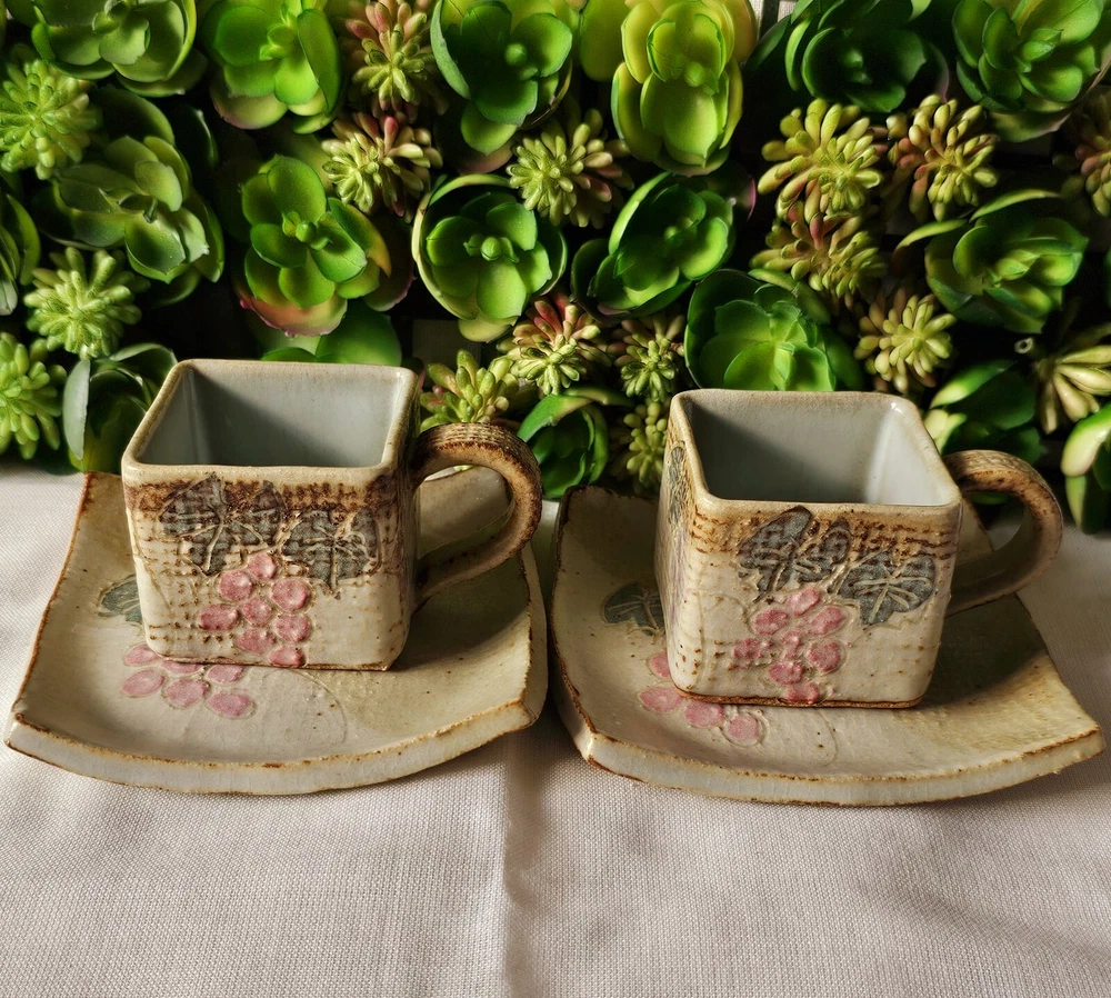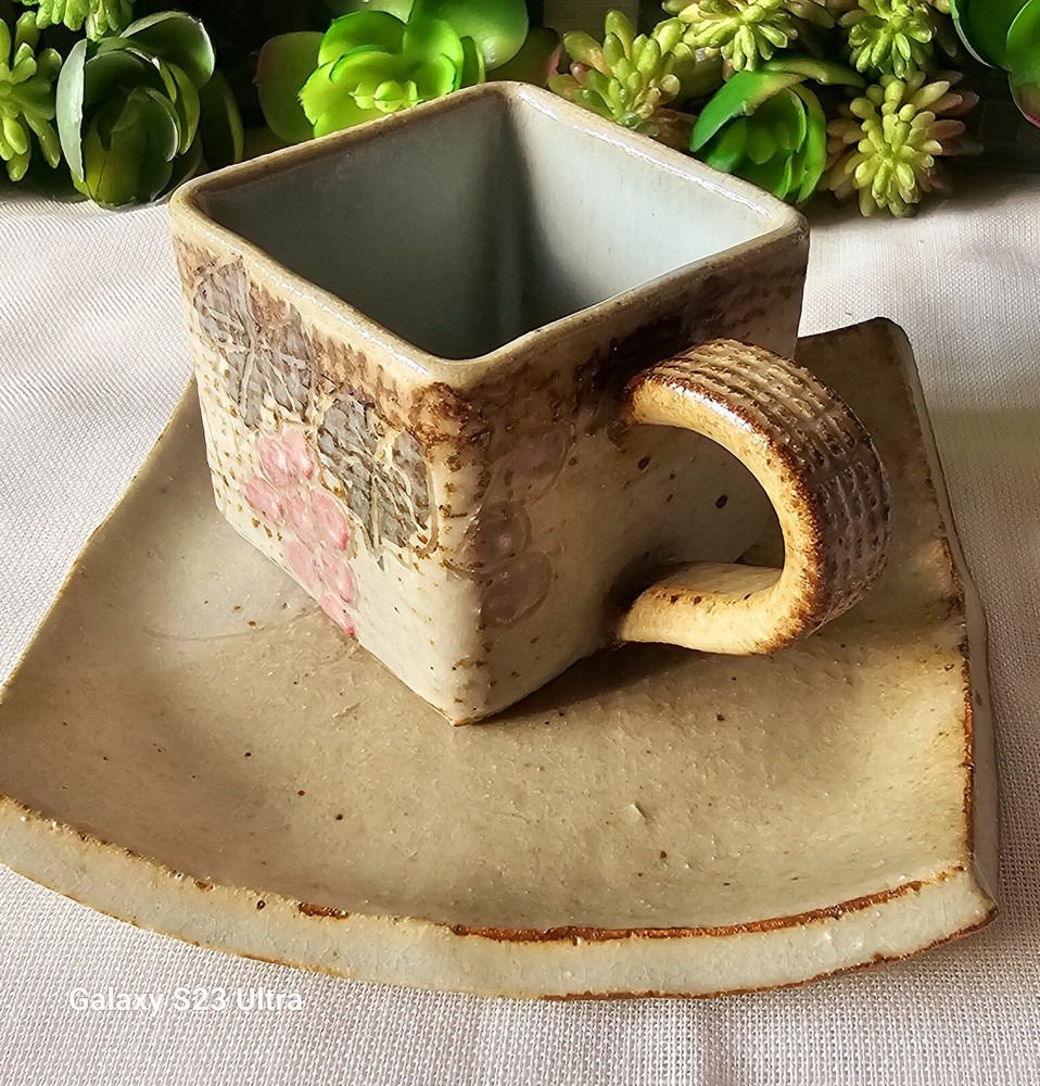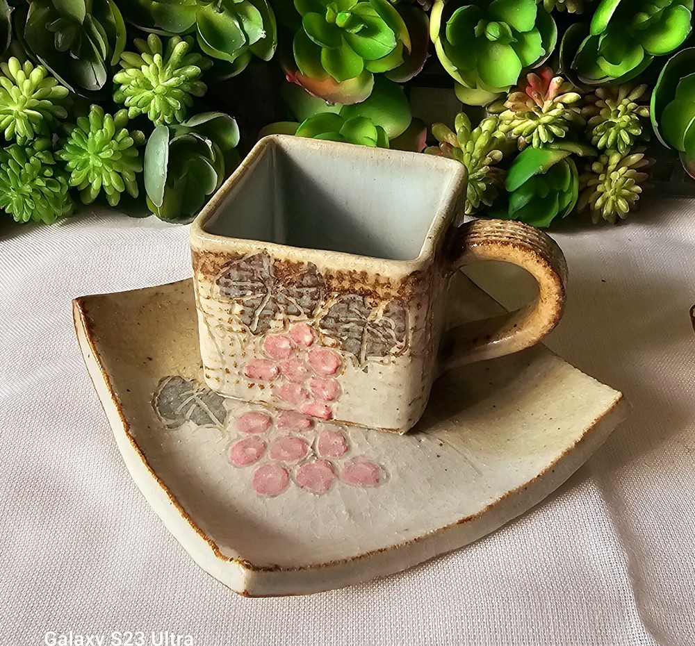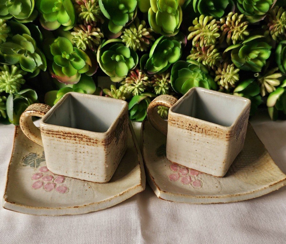 Add a touch of elegance to your coffee routine with this rare set of studio art pottery demitasse cups and saucers. The square-shaped cups feature a beautiful brown earth-tone color with a pink floral pattern that adds a touch of charm to any occasion. The handles on the cups make it easy to hold and enjoy your hot or cold beverage. These handmade cups are perfect for all occasions, whether it's a morning pick-me-up or an afternoon break. The set includes 2 cups and 2 saucers, each with a unique design that showcases the art of handmade pottery. The cups are perfect for collectors, and the set is an original, not a licensed reproduction. Enjoy your coffee or tea in style with this exquisite set.