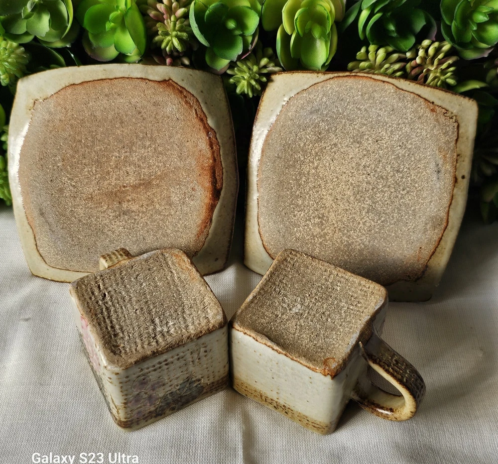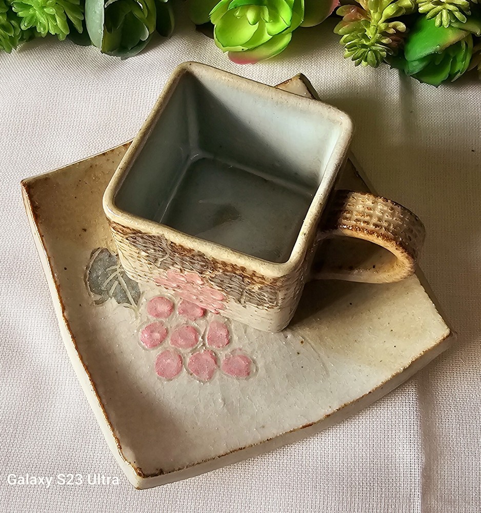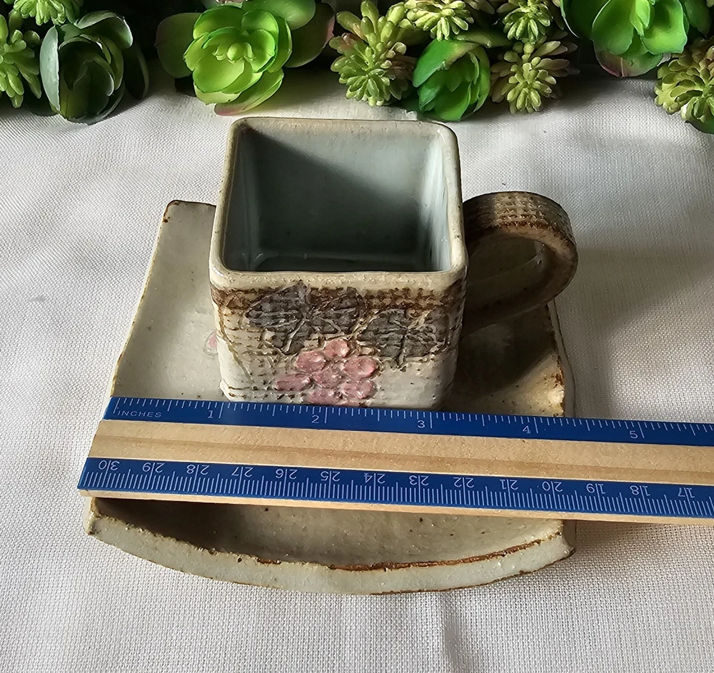 Add a touch of elegance to your coffee routine with this rare set of studio art pottery demitasse cups and saucers. The square-shaped cups feature a beautiful brown earth-tone color with a pink floral pattern that adds a touch of charm to any occasion. The handles on the cups make it easy to hold and enjoy your hot or cold beverage. These handmade cups are perfect for all occasions, whether it's a morning pick-me-up or an afternoon break. The set includes 2 cups and 2 saucers, each with a unique design that showcases the art of handmade pottery. The cups are perfect for collectors, and the set is an original, not a licensed reproduction. Enjoy your coffee or tea in style with this exquisite set.