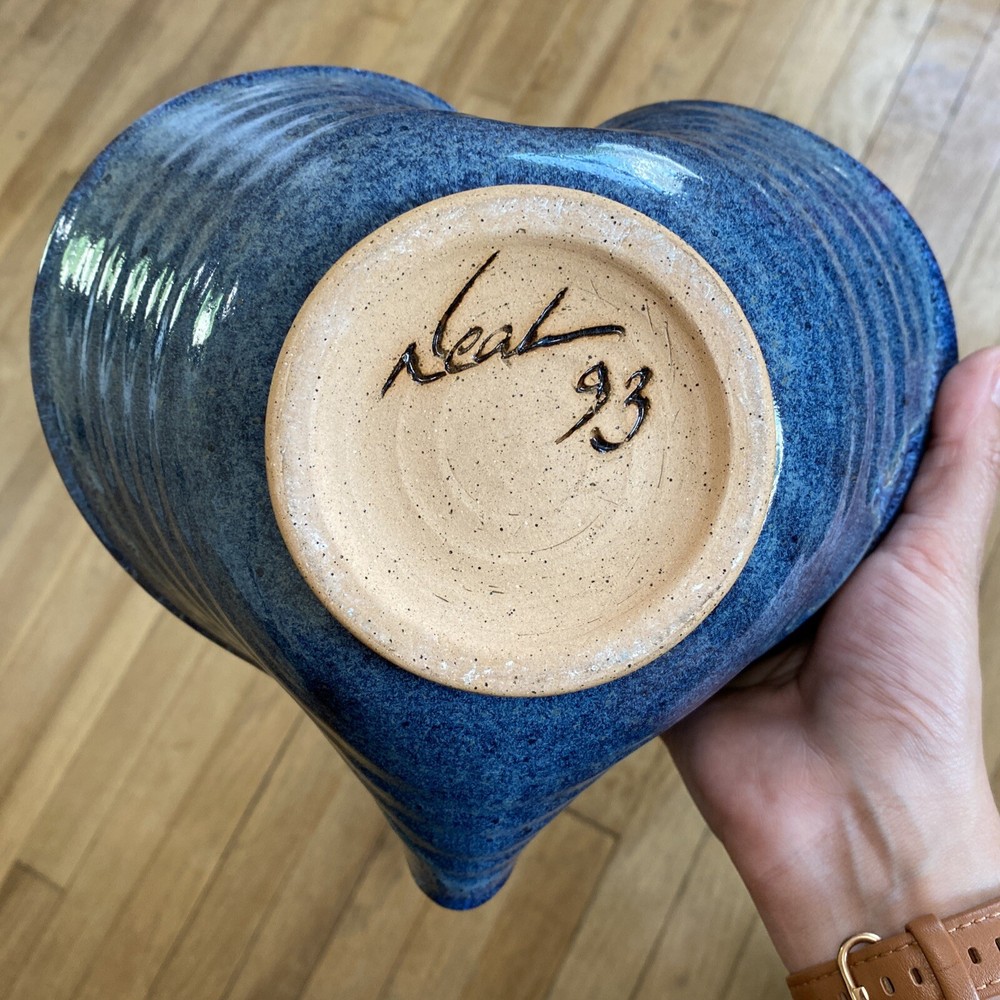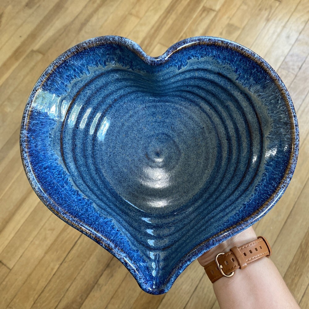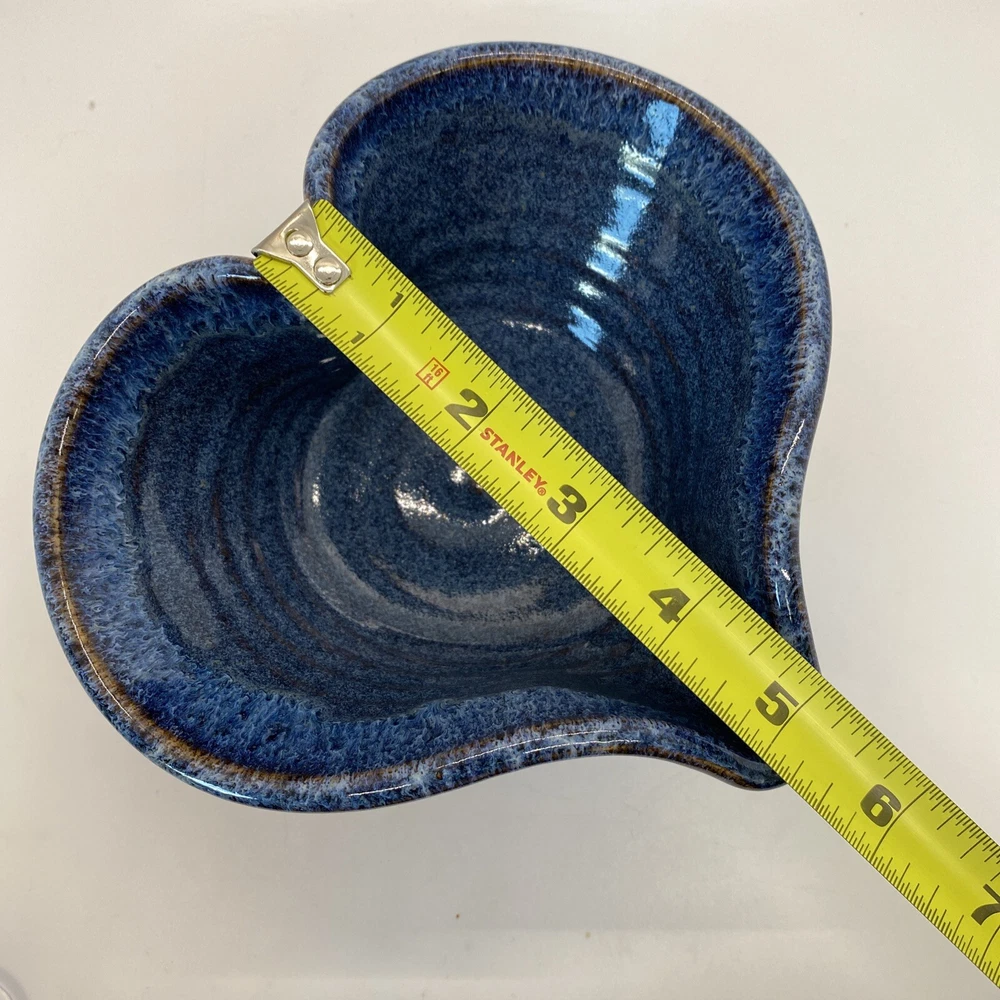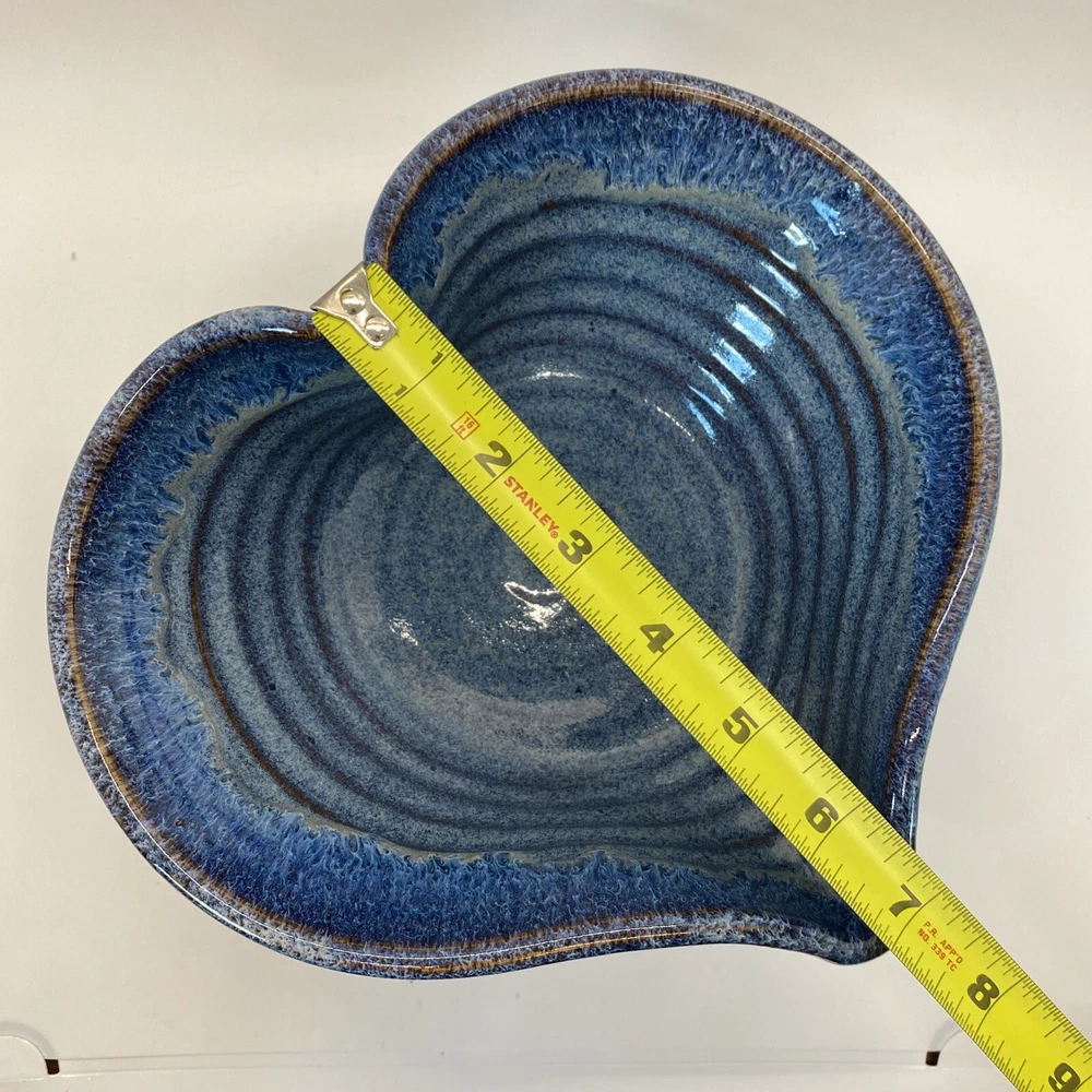 Set includes 3 bowls… one larger serving bowl and two smaller bowls that are similar in size. They are not exactly the same because they are hand made.. beautiful drip glaze. Please see all photos. (3) Greg Neal Heart Shaped Stoneware Art Pottery 1993 Blue Drip Glaze.