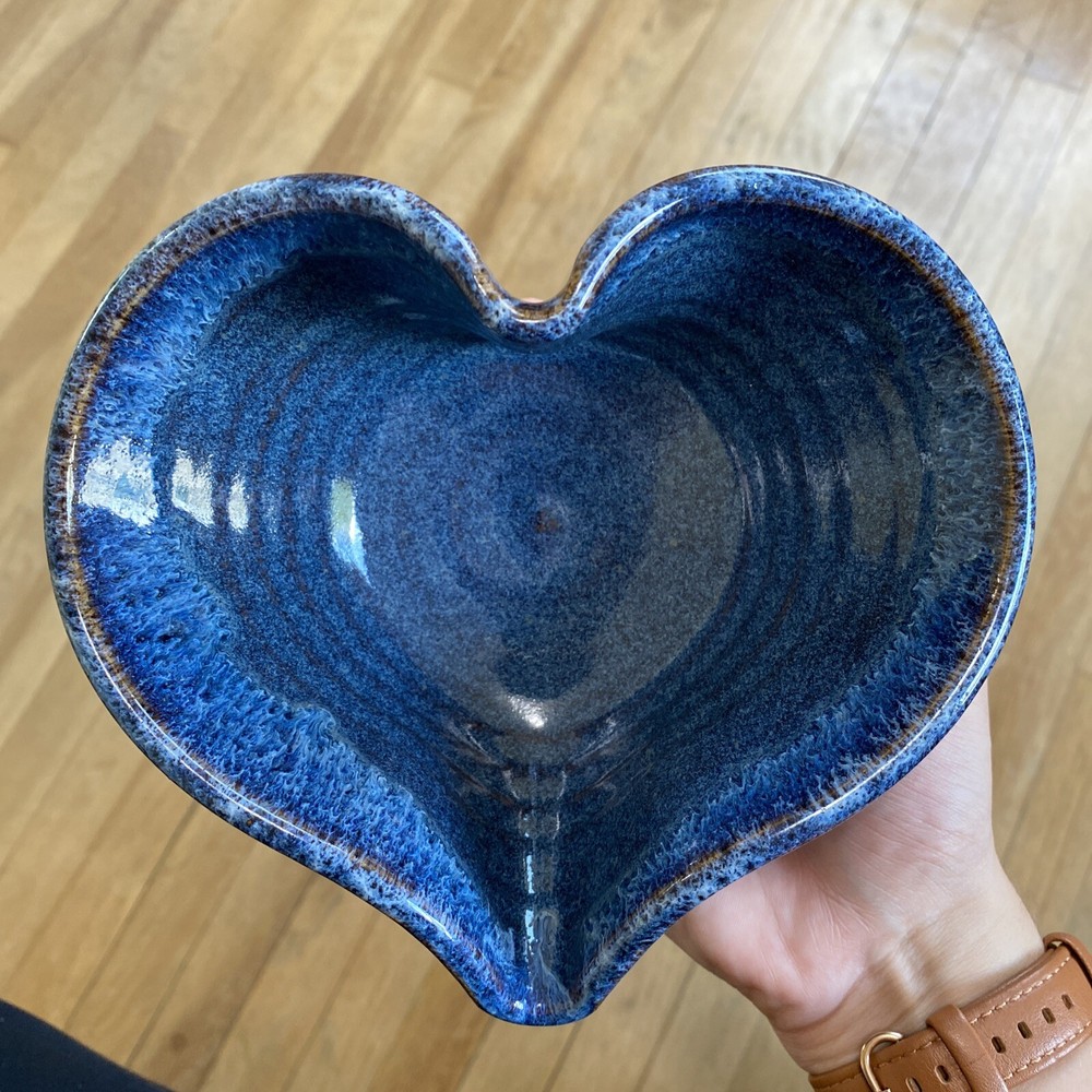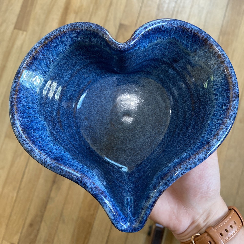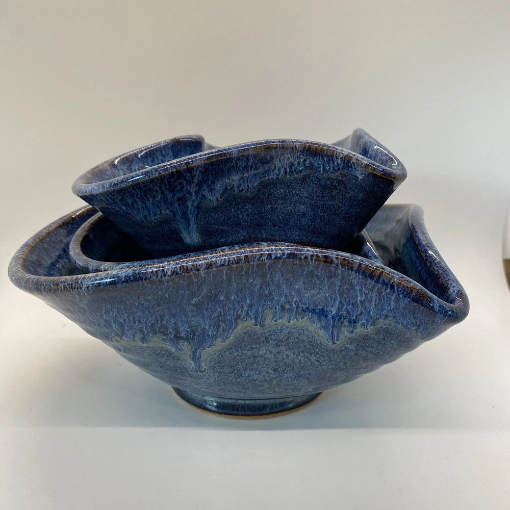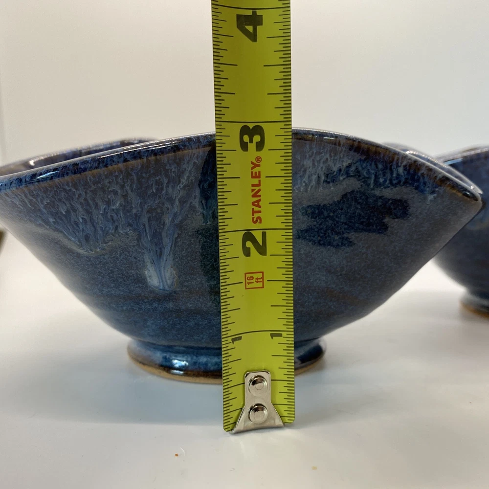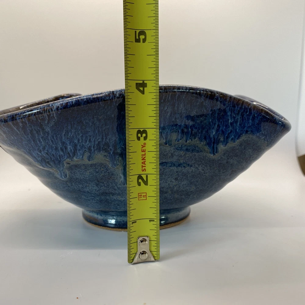 Set includes 3 bowls… one larger serving bowl and two smaller bowls that are similar in size. They are not exactly the same because they are hand made.. beautiful drip glaze. Please see all photos. (3) Greg Neal Heart Shaped Stoneware Art Pottery 1993 Blue Drip Glaze.