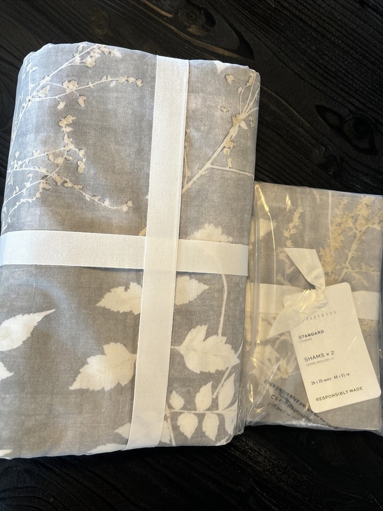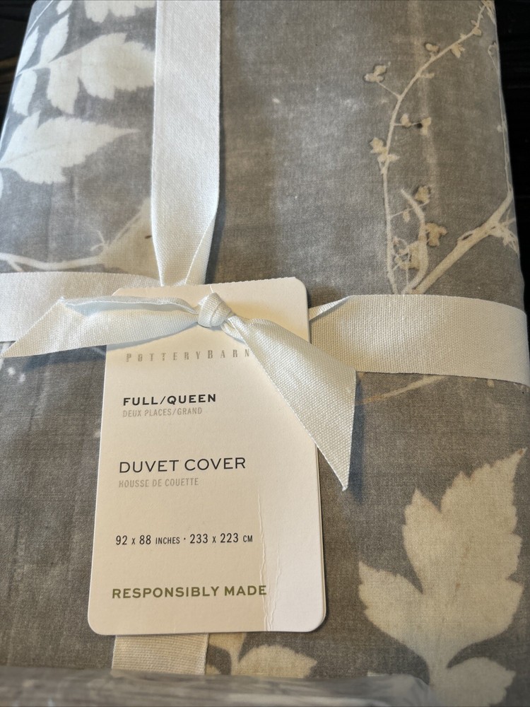 This 3-piece set from Pottery Barn includes a Full/Queen duvet cover and two standard shams in a Shadow Floral pattern. The color is gray, and the material is cotton. The set features a button closure and is part of the Pottery Barn product line. The bundle is a custom set and suitable for adults. The care instructions recommend machine washing. Personalization is not available for this set.